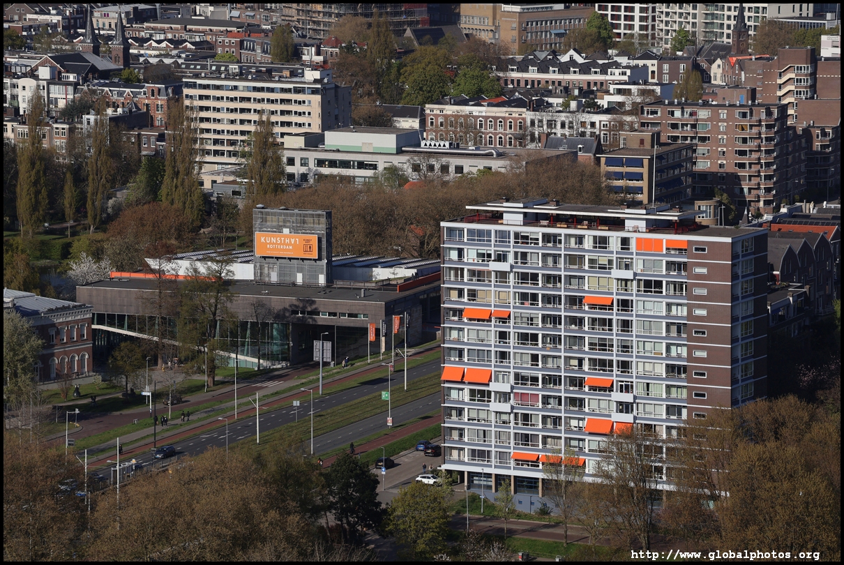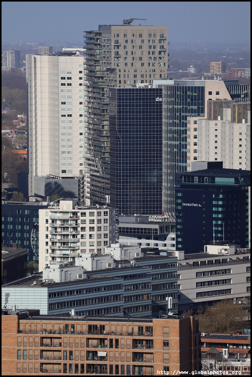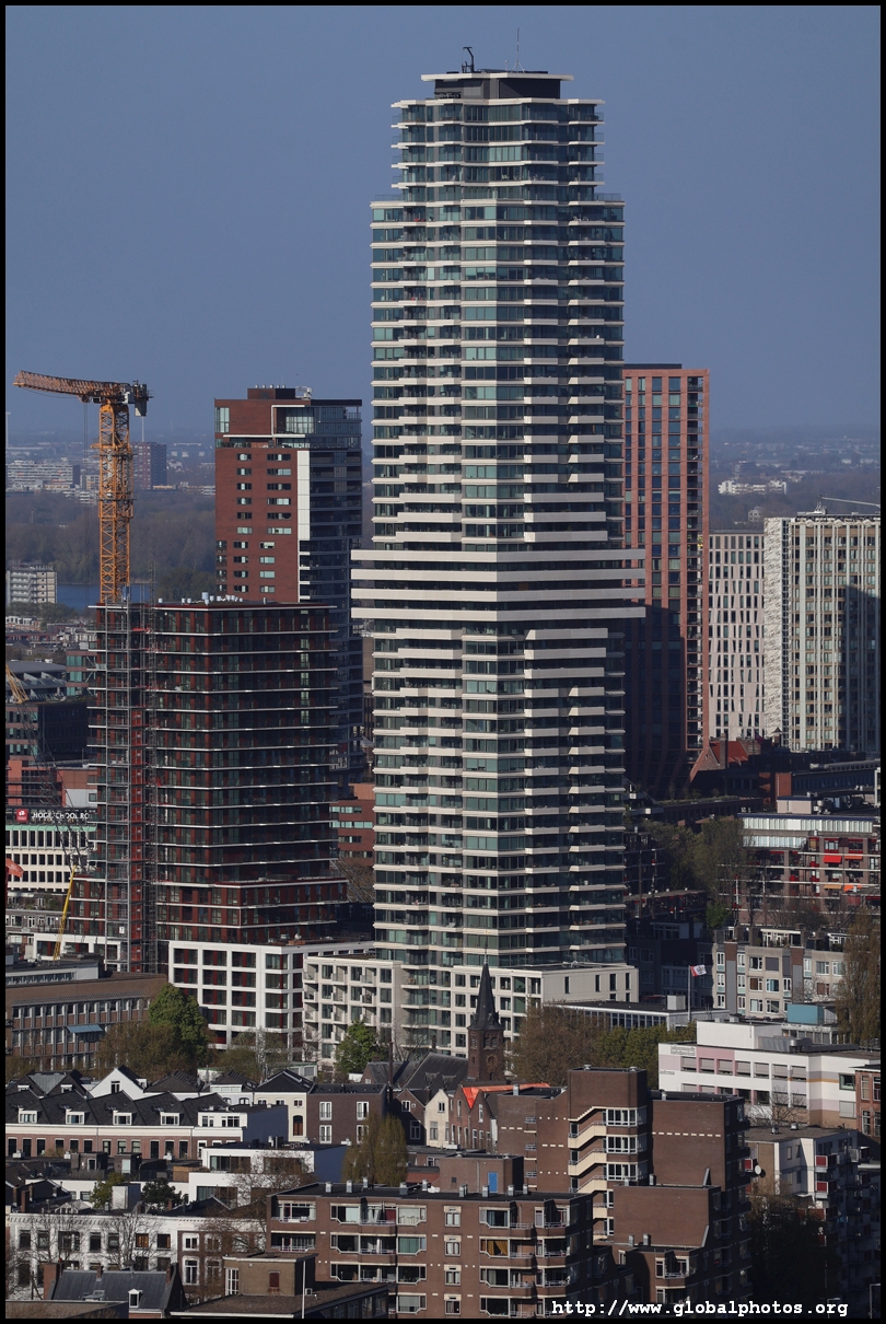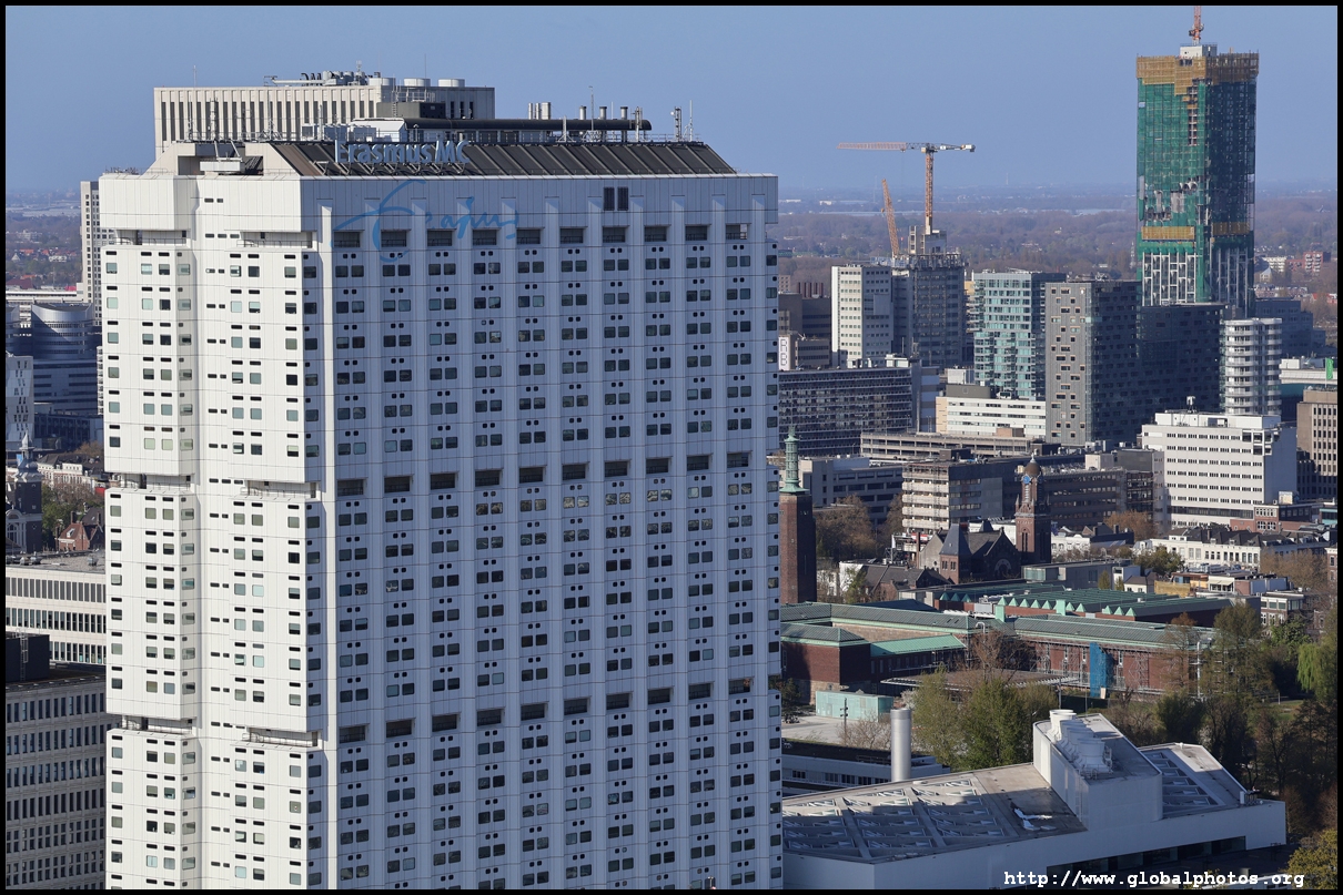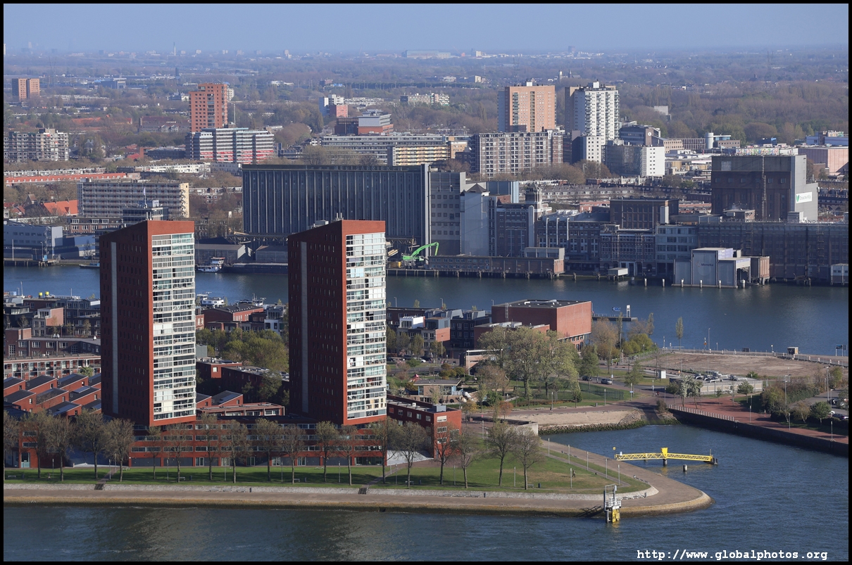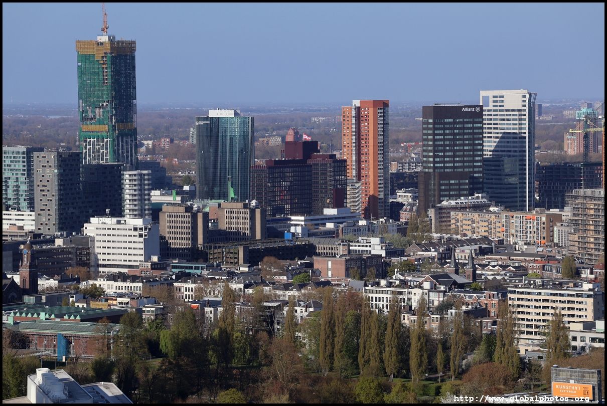 The tower is just across the highway from Het Park, a nice urban oasis along the Nieuwe Maas river. On the other side of the river towards the south are plenty of residential developments around Rijnhaven, Maashaven, and further beyond. To the west, the residential communities slowly fade away and the massive port takes over all the way to the North Sea. In 2024, Rotterdam's port throughput exceeded 435 million tonnes, including 13.8 million container TEU, ranking it the largest in Europe. To the north, I can make out The Hague's skyline in the distance. The metro's line E connects both cities together, with a journey time of about half an hour from Centraal station.