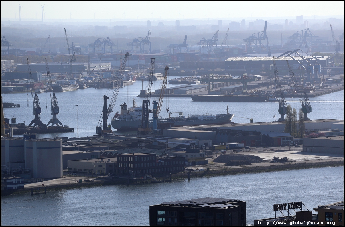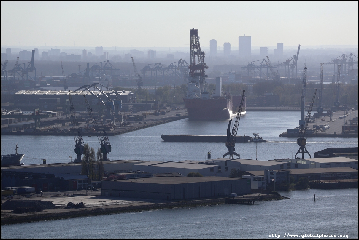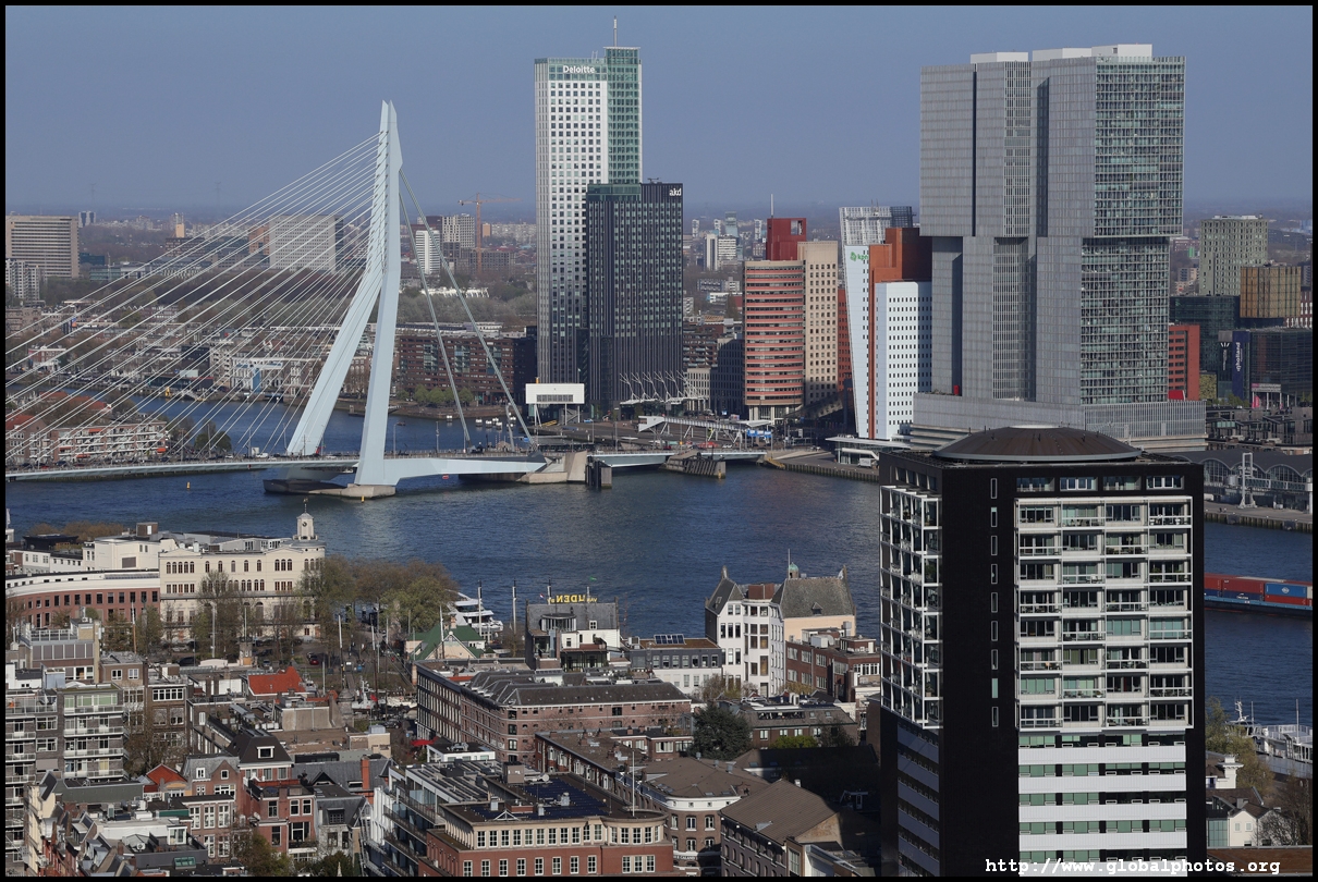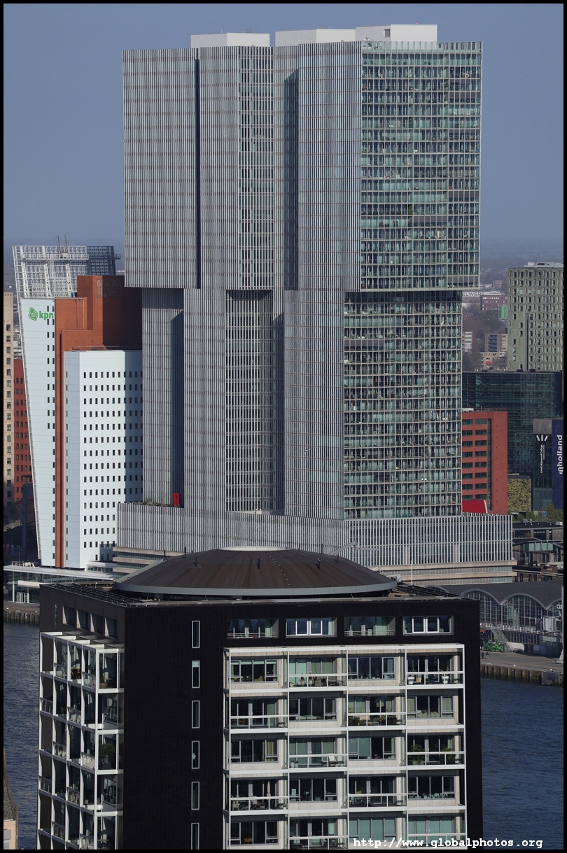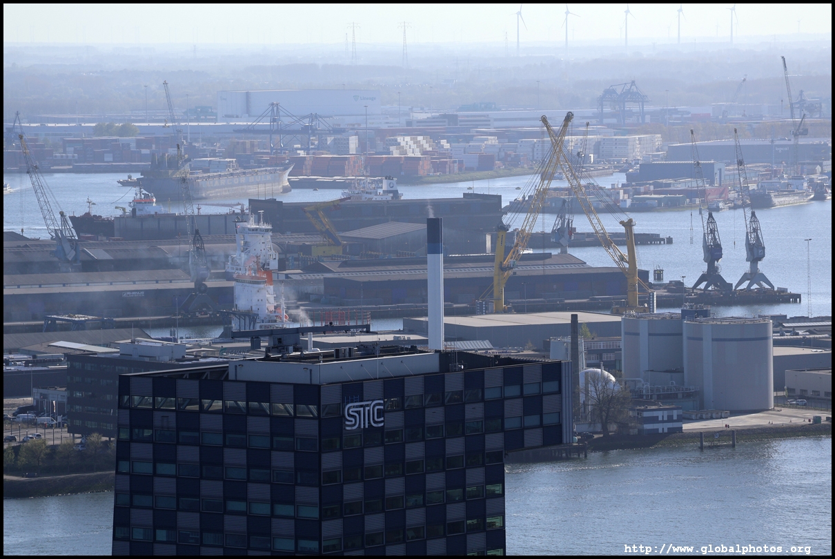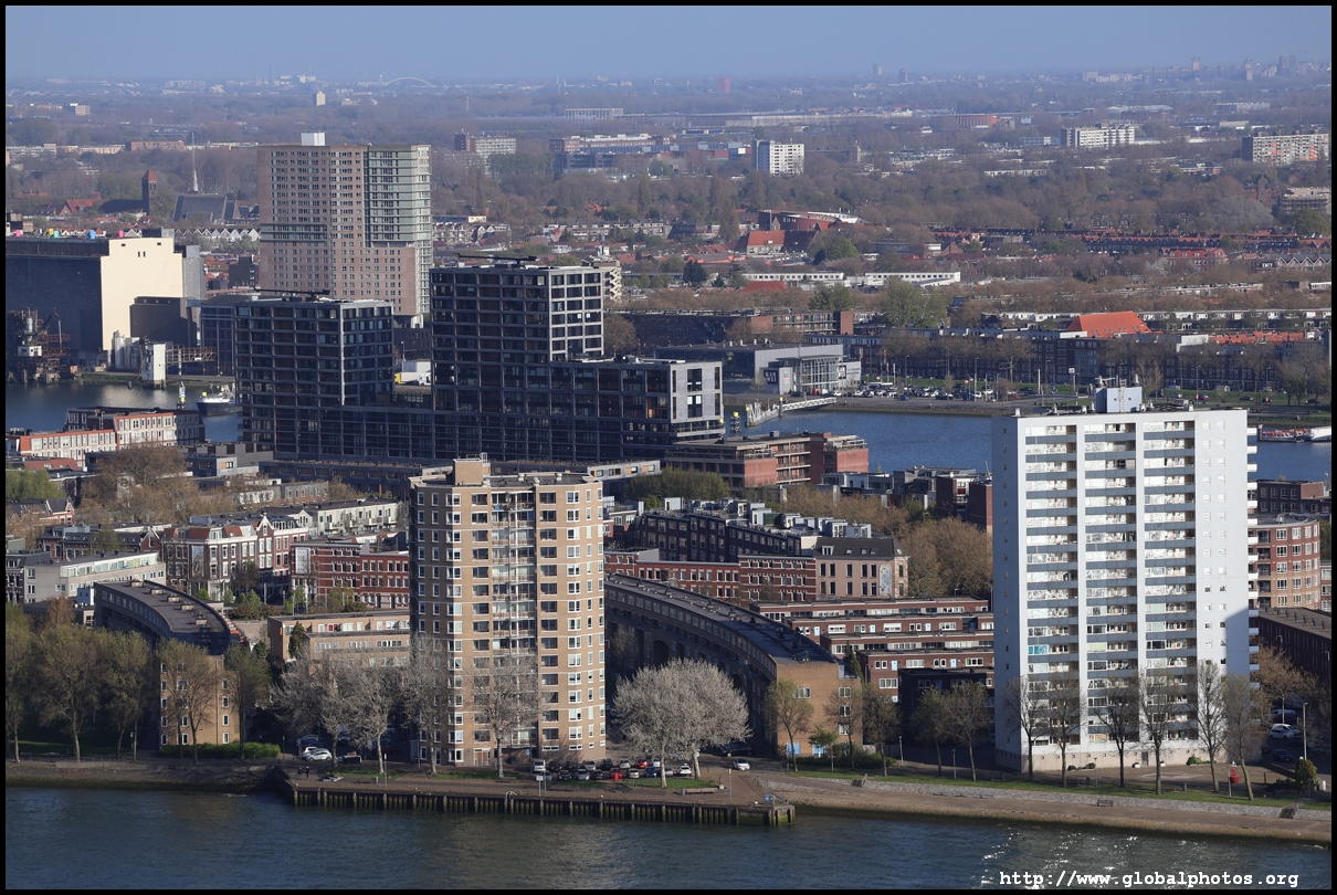 The tower is just across the highway from Het Park, a nice urban oasis along the Nieuwe Maas river. On the other side of the river towards the south are plenty of residential developments around Rijnhaven, Maashaven, and further beyond. To the west, the residential communities slowly fade away and the massive port takes over all the way to the North Sea. In 2024, Rotterdam's port throughput exceeded 435 million tonnes, including 13.8 million container TEU, ranking it the largest in Europe. To the north, I can make out The Hague's skyline in the distance. The metro's line E connects both cities together, with a journey time of about half an hour from Centraal station.