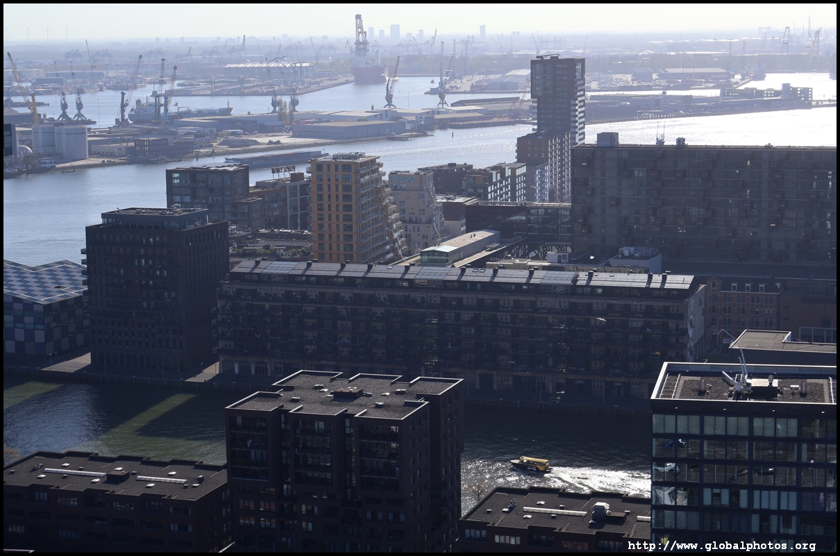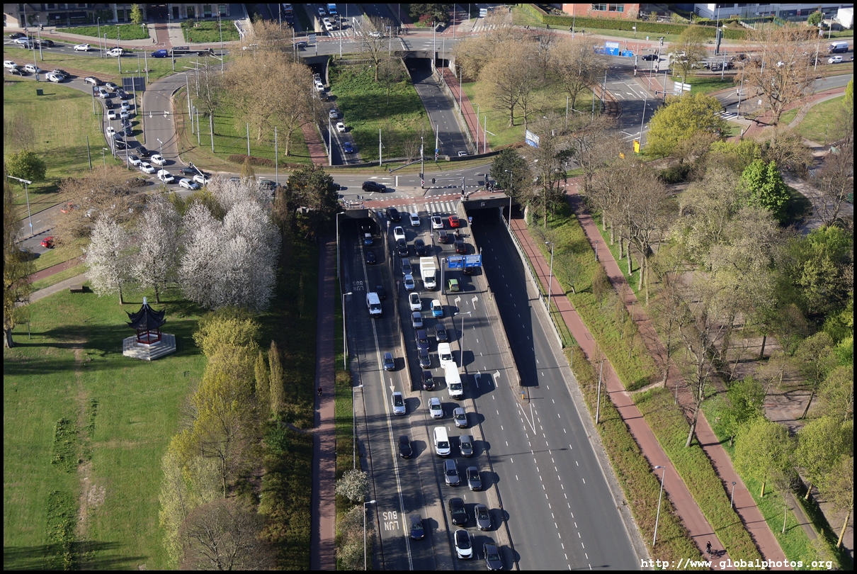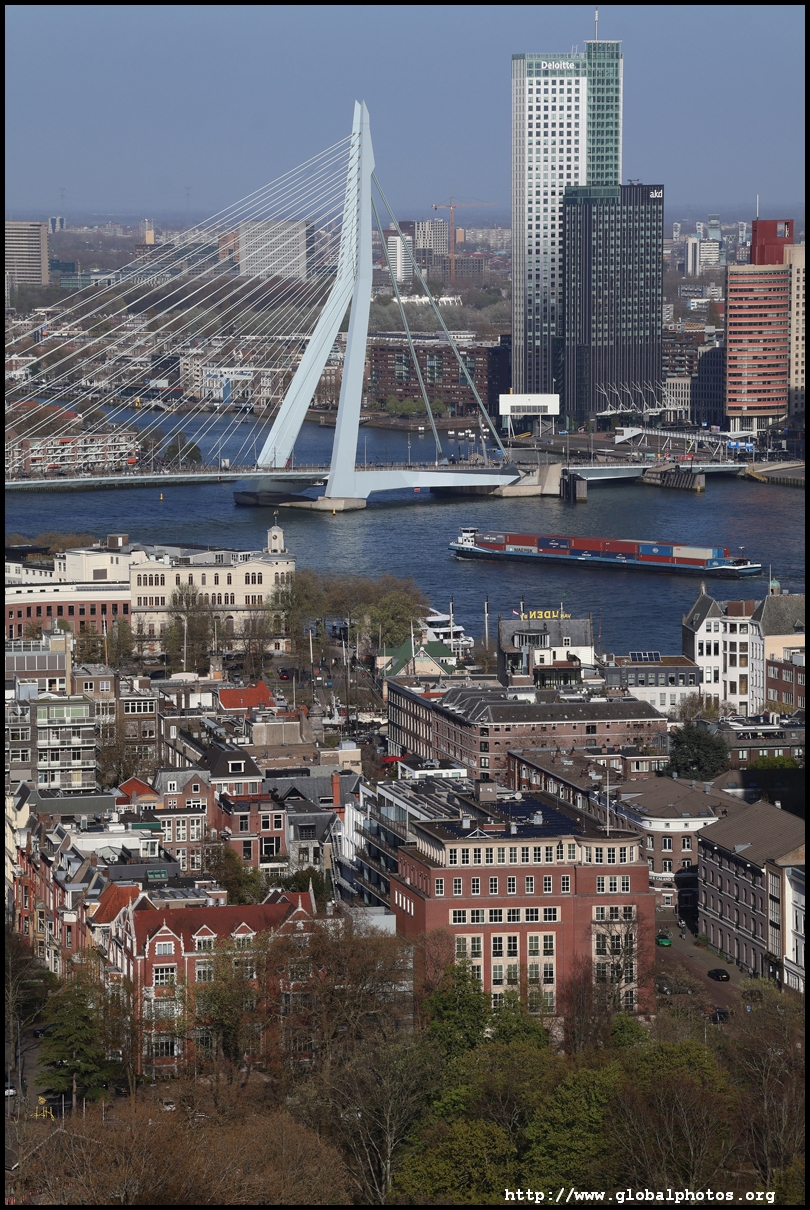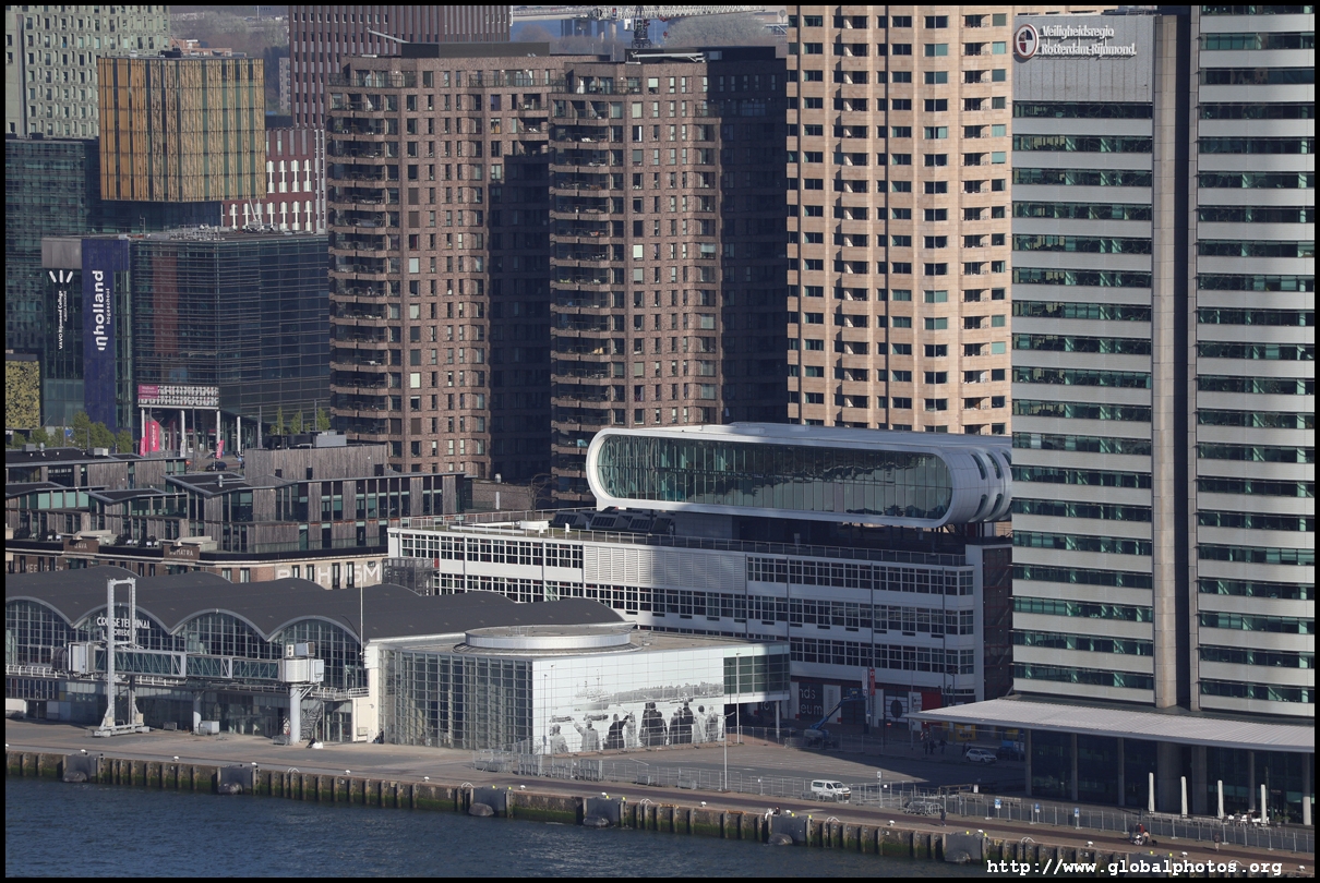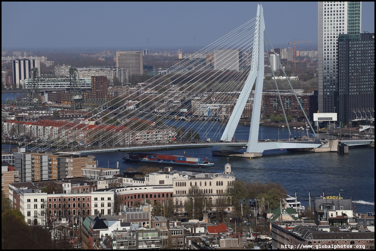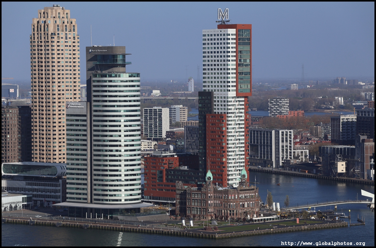 The tower is just across the highway from Het Park, a nice urban oasis along the Nieuwe Maas river. On the other side of the river towards the south are plenty of residential developments around Rijnhaven, Maashaven, and further beyond. To the west, the residential communities slowly fade away and the massive port takes over all the way to the North Sea. In 2024, Rotterdam's port throughput exceeded 435 million tonnes, including 13.8 million container TEU, ranking it the largest in Europe. To the north, I can make out The Hague's skyline in the distance. The metro's line E connects both cities together, with a journey time of about half an hour from Centraal station.