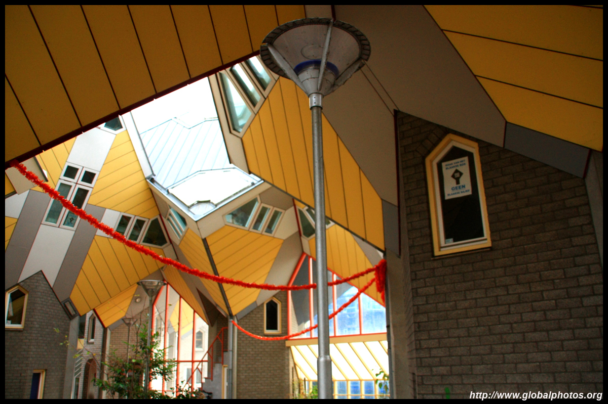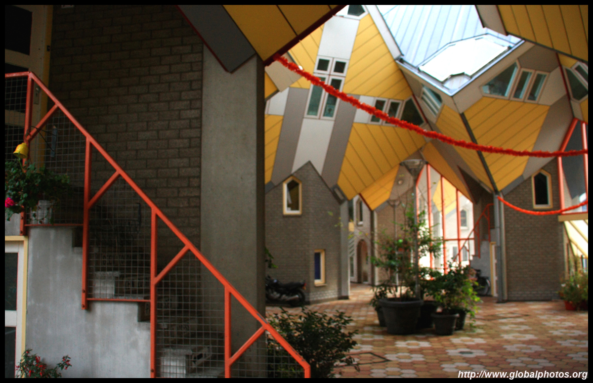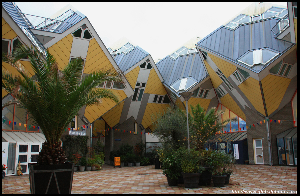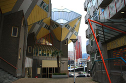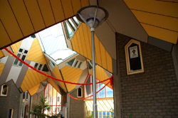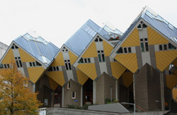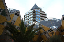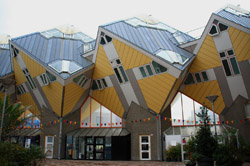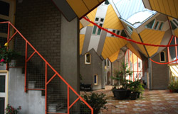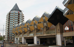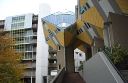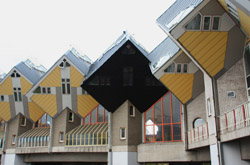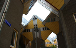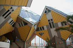 Located in the historic port, Kubuswoningen was designed by Piet Blom as a cube concept that challenged conventional norms. He believed that housing needs to be recognizable as such and his creation showcased progressiveness and innovation as part of the city's reconstruction. The city didn't want bland architecture here. Each elevated cube represented a tree and the entire complex was a forest, allowing plenty of public space below.