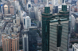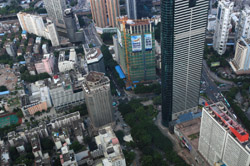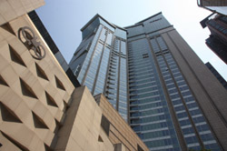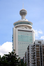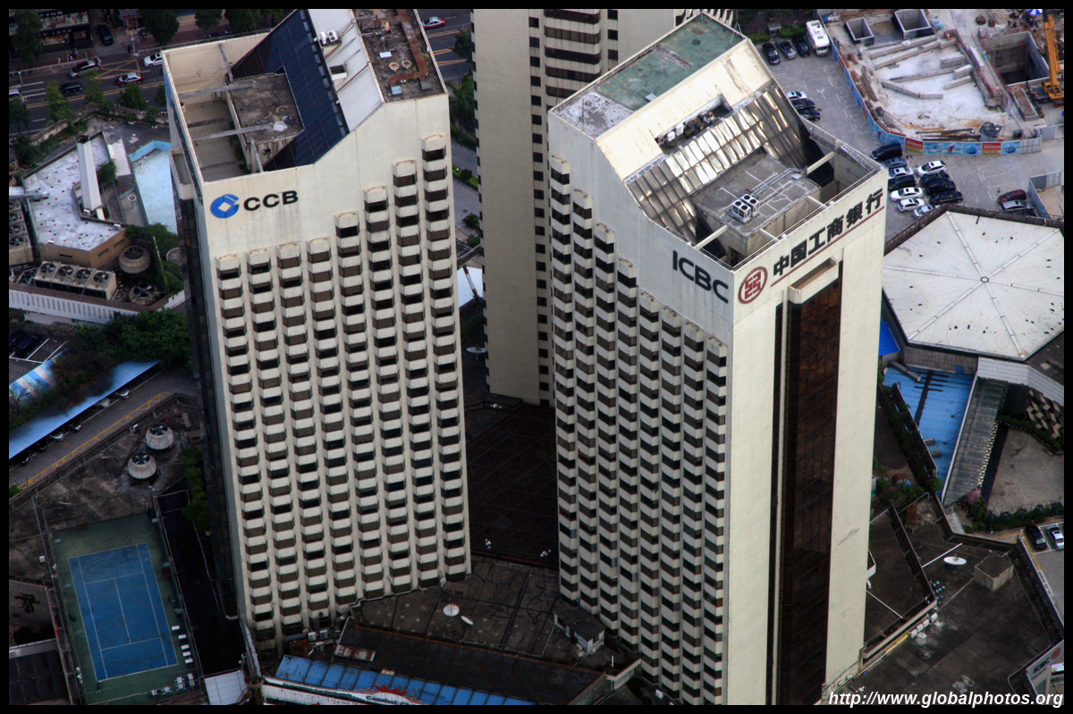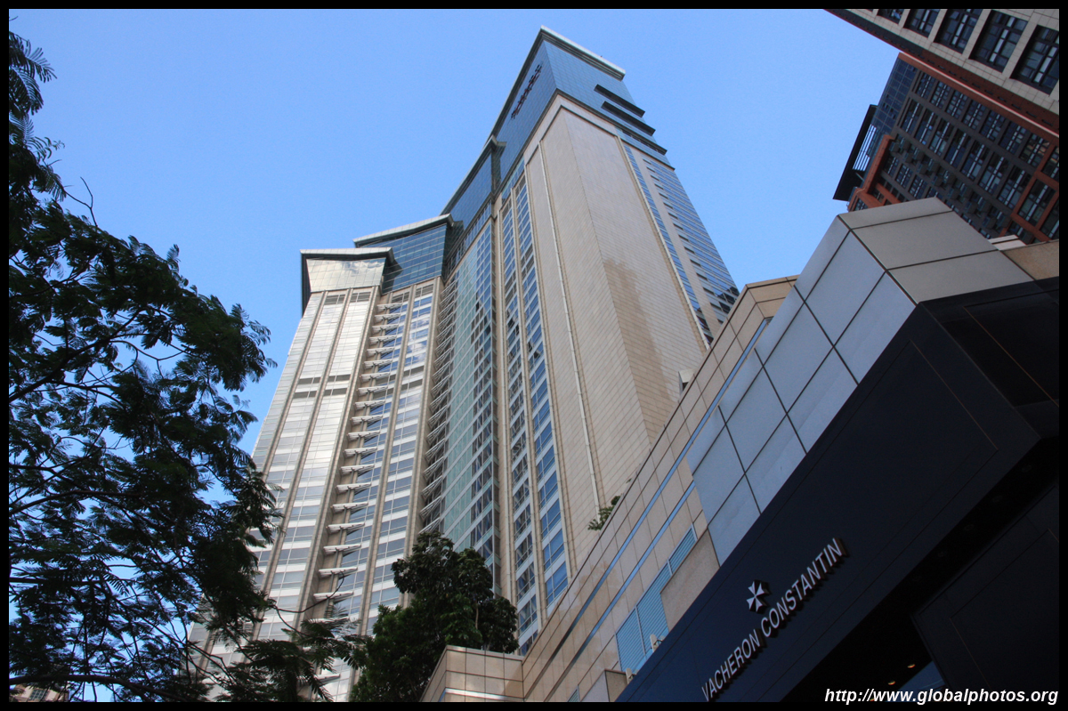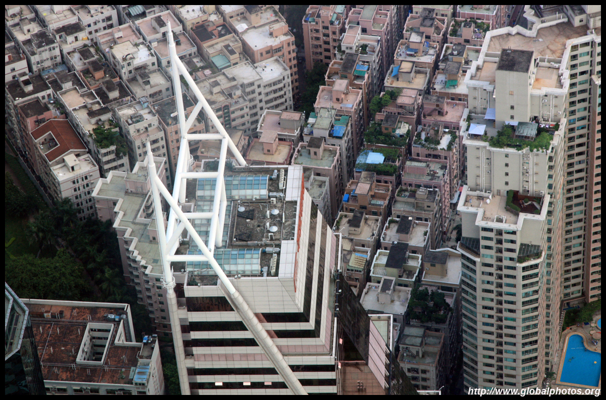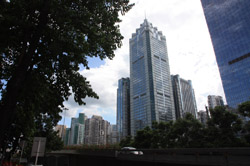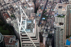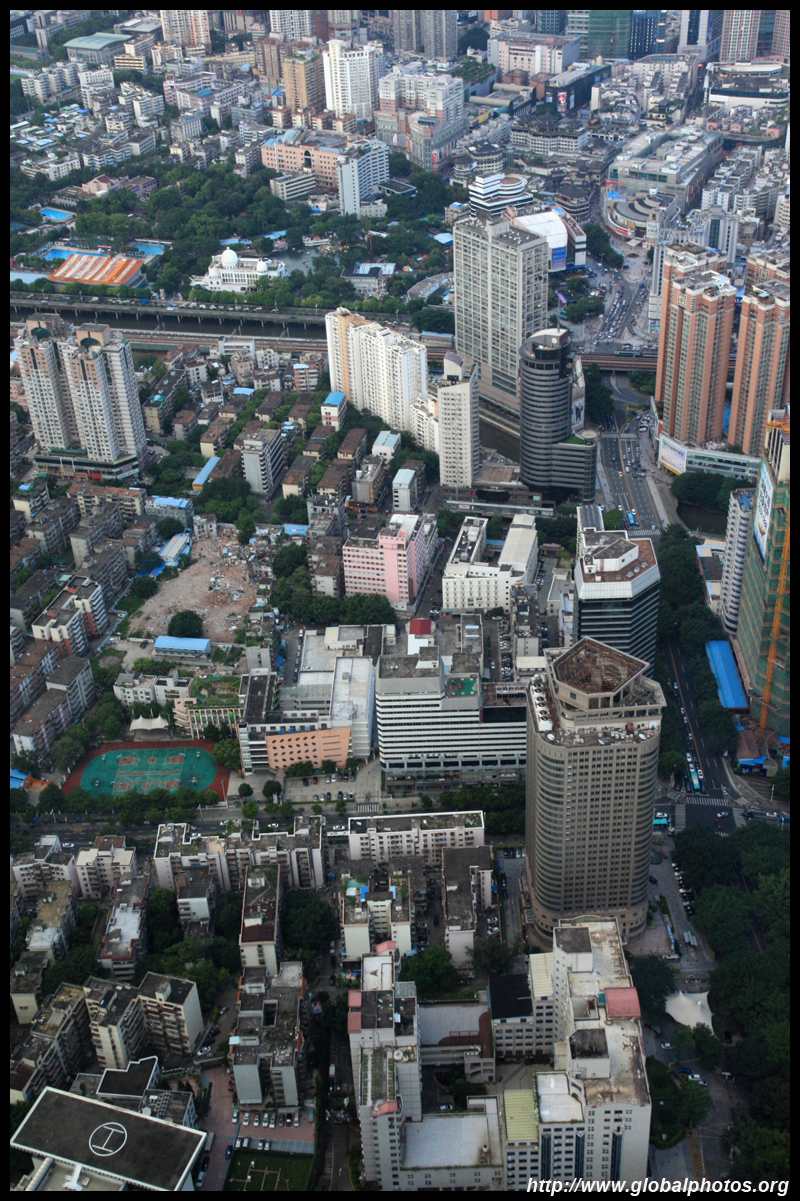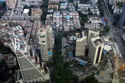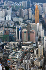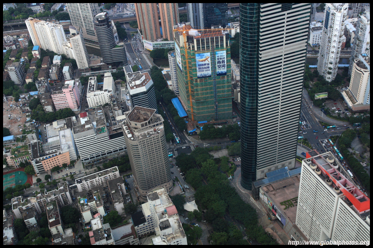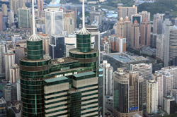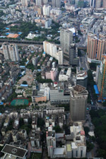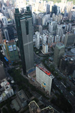 The city is densely built up around the building. Shun Hing Square next door used to be the city's tallest and looks tiny now.