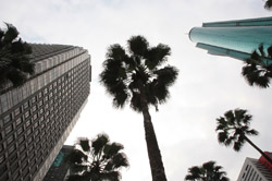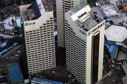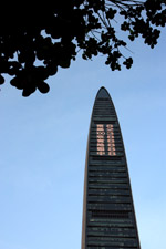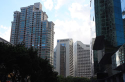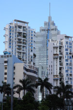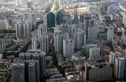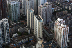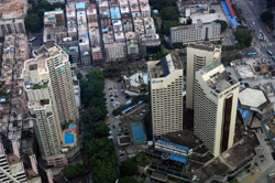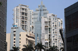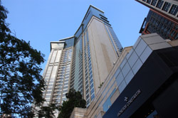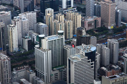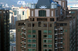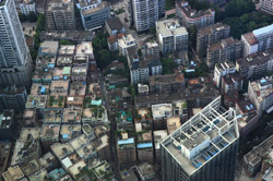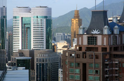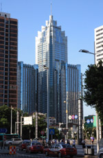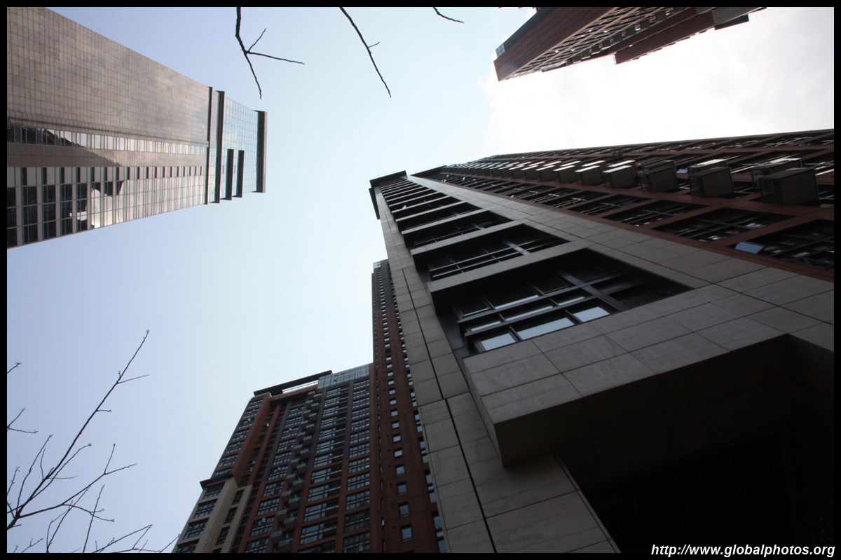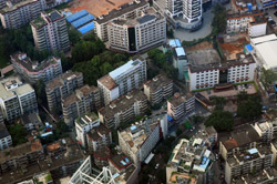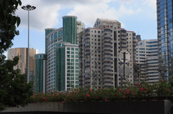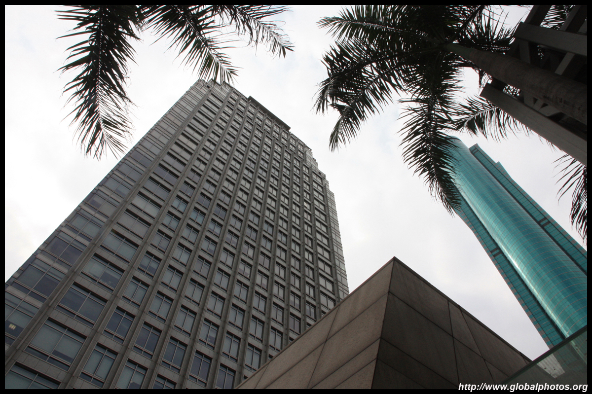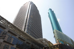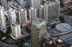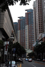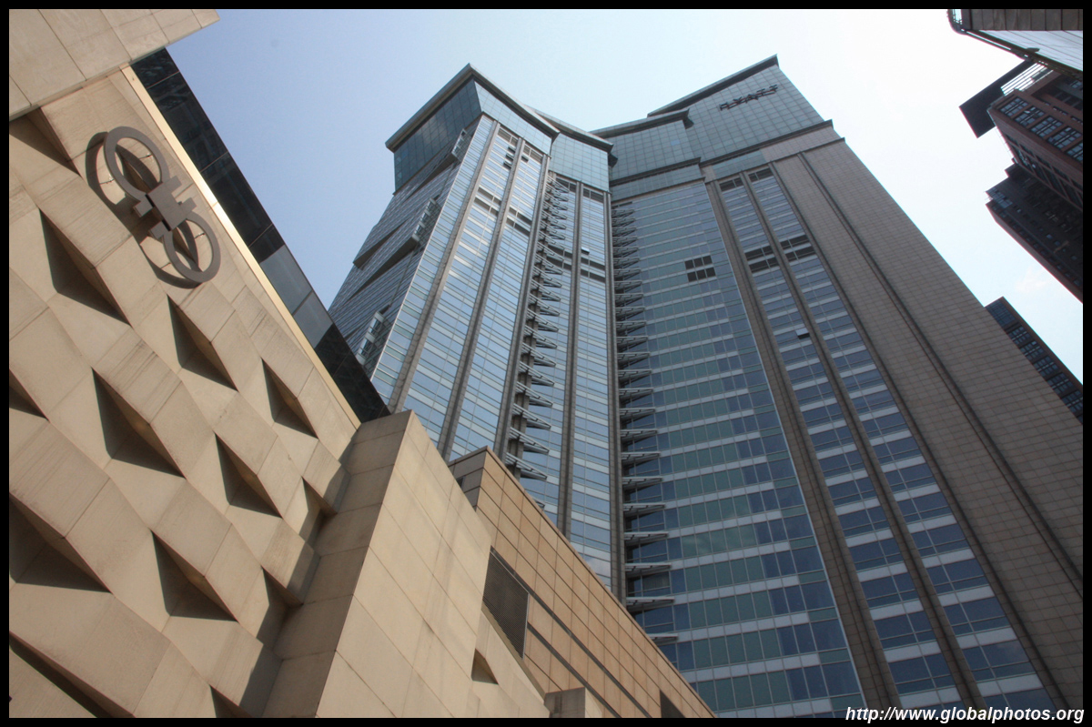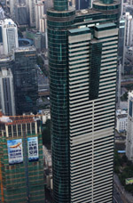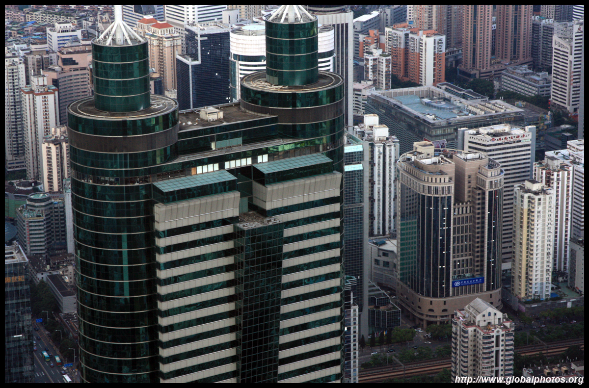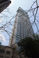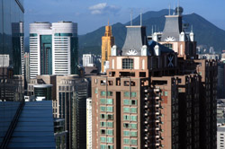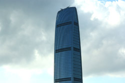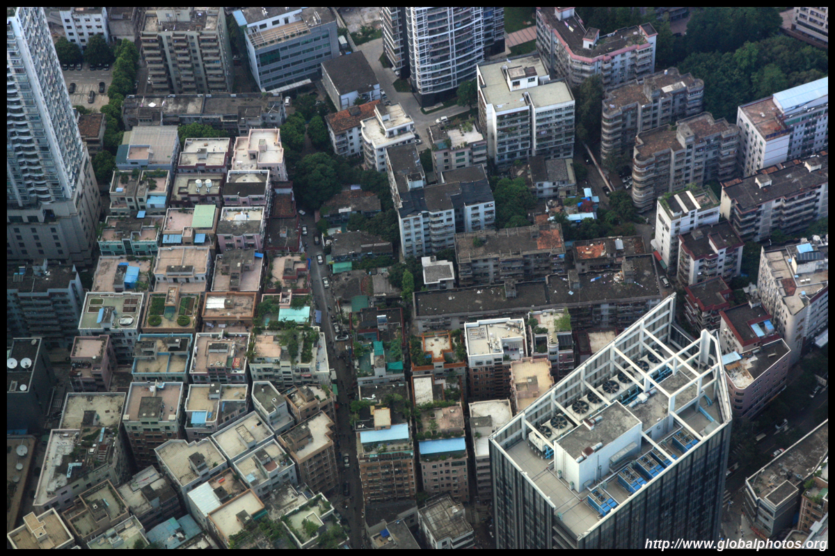 The city is densely built up around the building. Shun Hing Square next door used to be the city's tallest and looks tiny now.