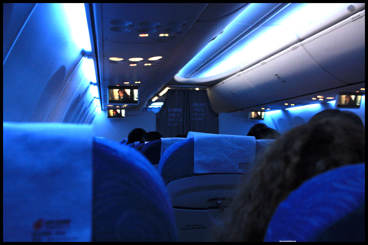 Tonight's plane looked fairly new with mood lighting. We made a very sharp ascent that was quite uncomfortable and entered Chinese airspace at over 10,000 feet.