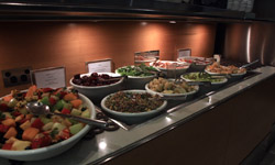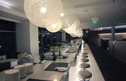 The lounge's food selection is scattered across several rooms, with the dessert and sandwich section at the far end.