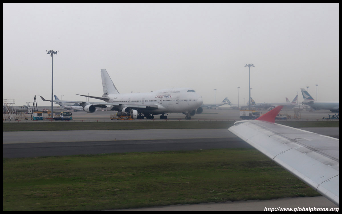 As we headed for take-off, I noticed this Orient Thai 747 under repair. Was this the plane that went out of service for almost a month and wrecked havoc on thousands of passengers?