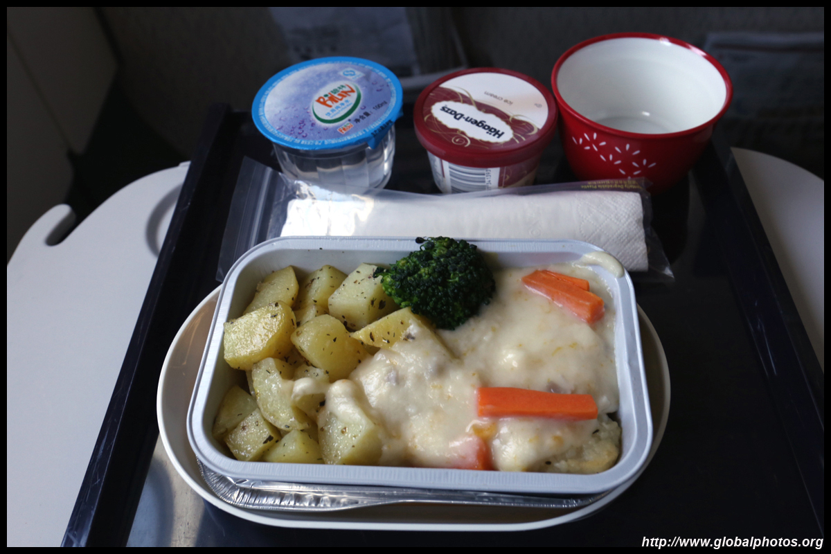 Today's plane is a widebody A330 with PTVs and the flight home would be short at under 2 hours. A hot meal was served shortly after the seat belt signs came off. Since I had lunch already at the airport, I opted for a simple dish of fish and potatoes. Strange there wasn't rice or pasta. Like the incoming flight, premium ice-cream was also served.