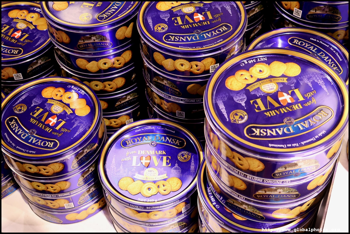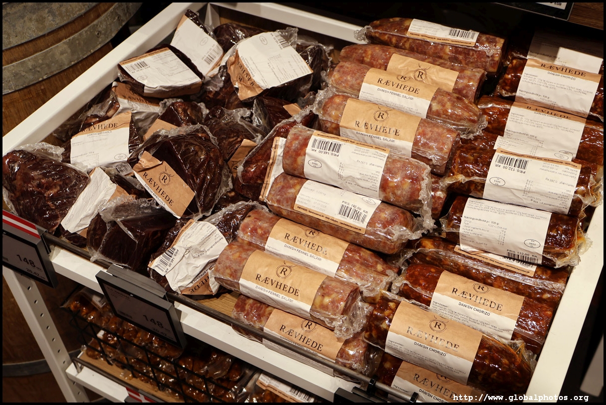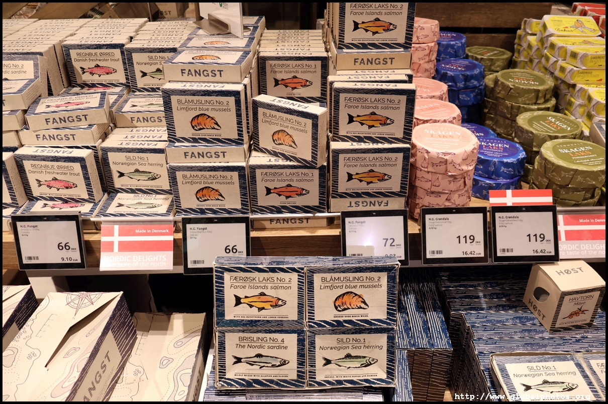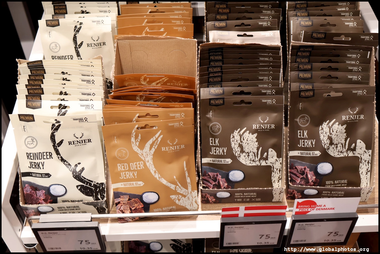 Denmark has a fairly high cost of living so it is browsing-only at the airport duty-free. They have the "royal" Danish cookies that I grew up eating in Hong Kong, sausages, and cans of all sorts. The reindeer and elk jerky seems to be a fairly common item in the Northern European countries.