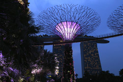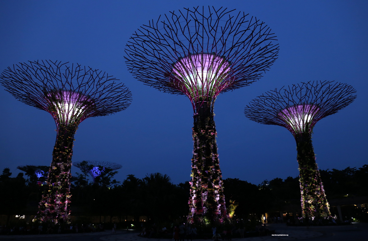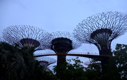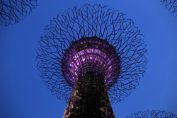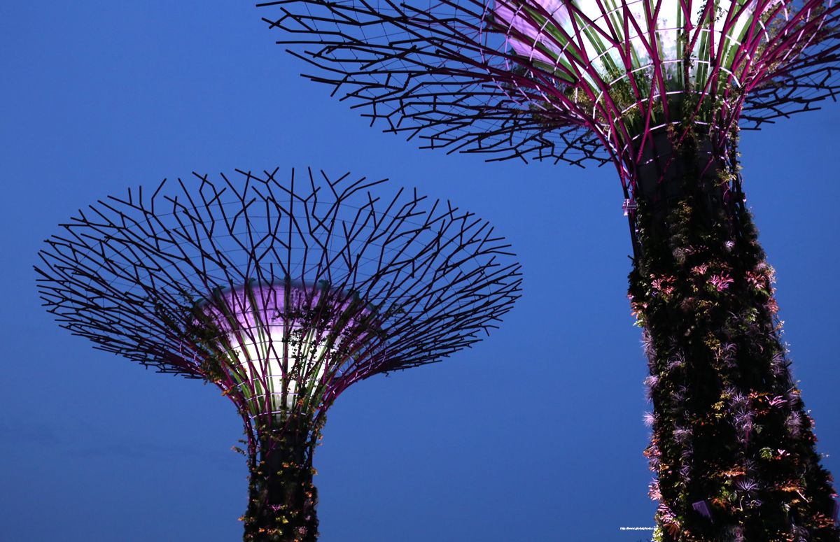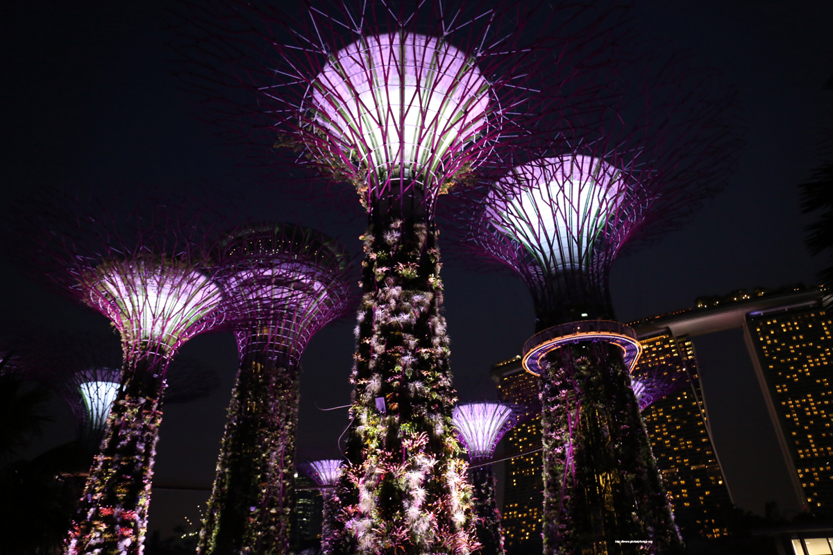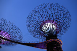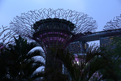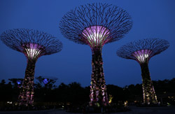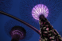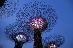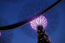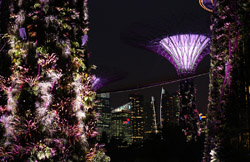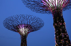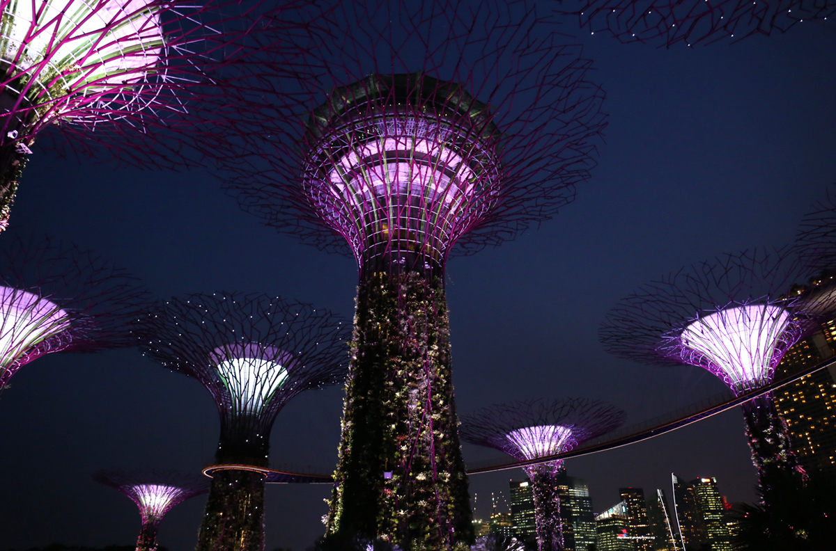 Gardens by the Bay features artificial tall trees that are covered by vegetation and light up at night.
