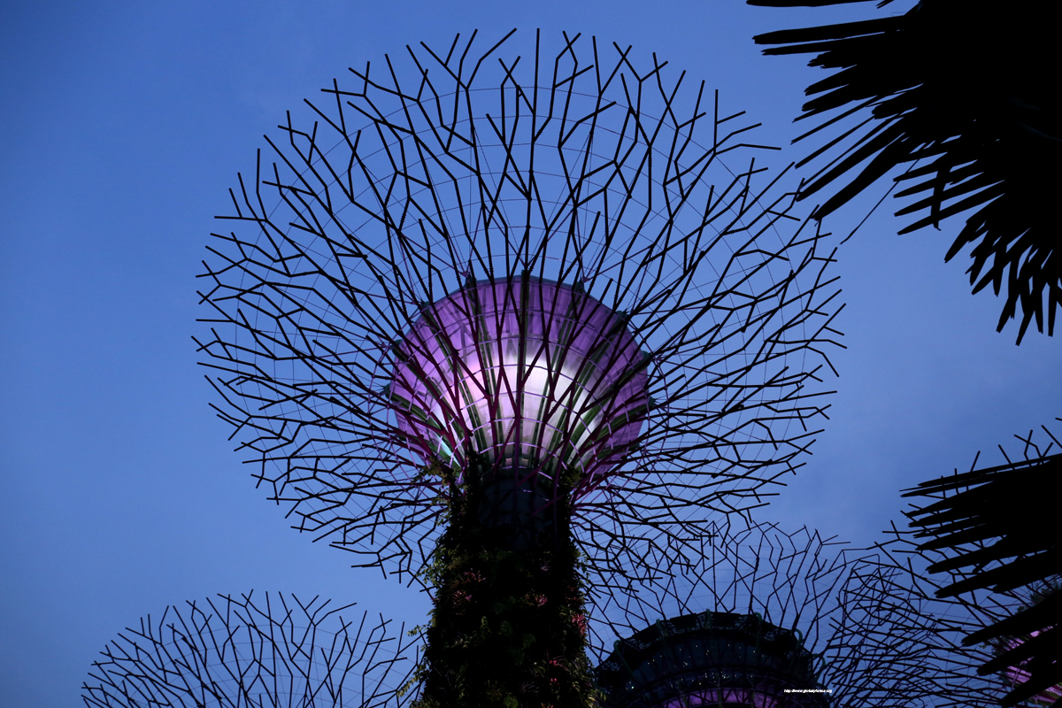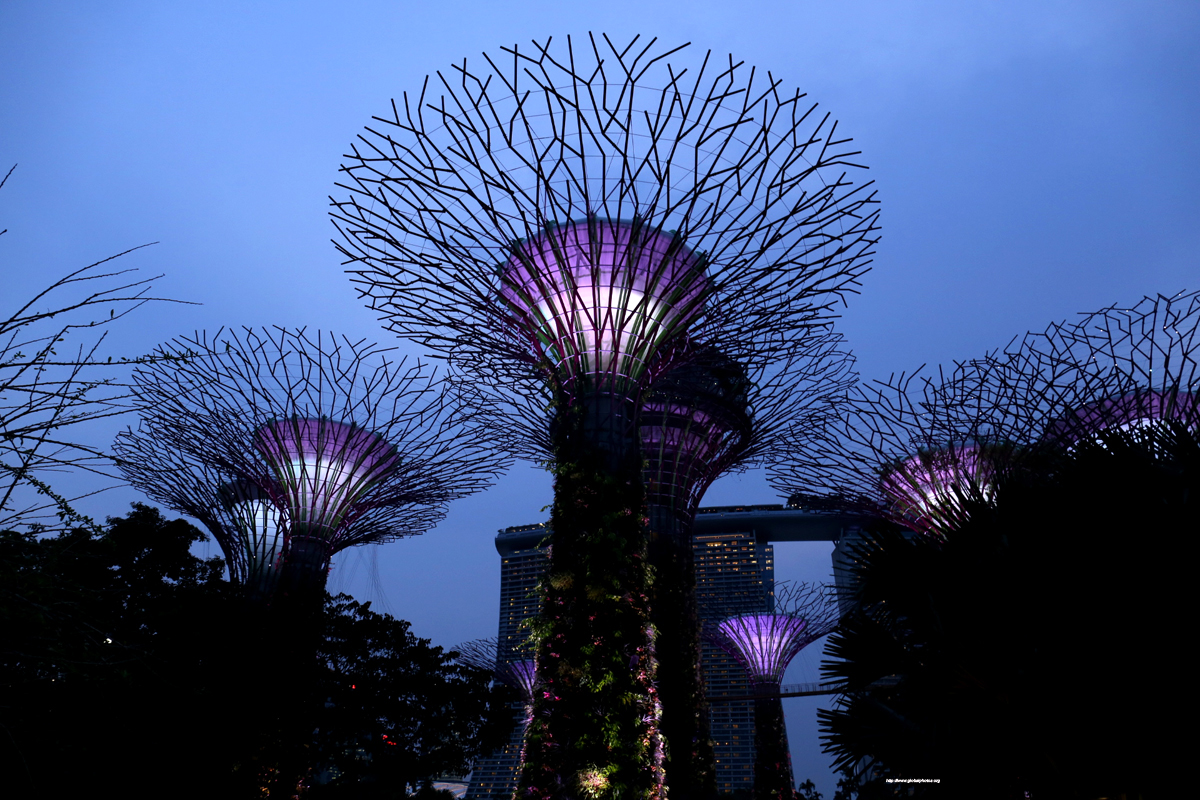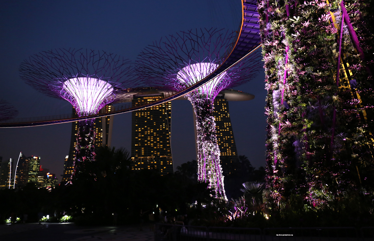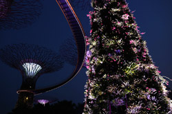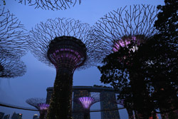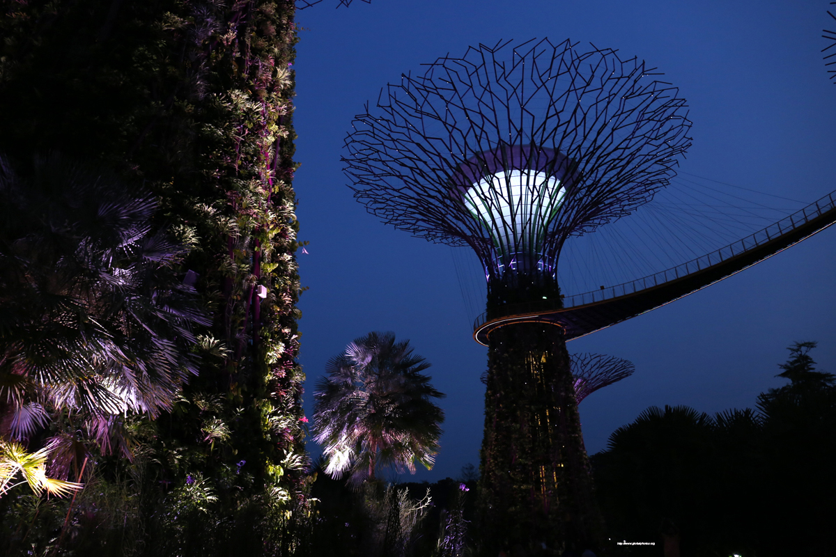 Gardens by the Bay features artificial tall trees that are covered by vegetation and light up at night.