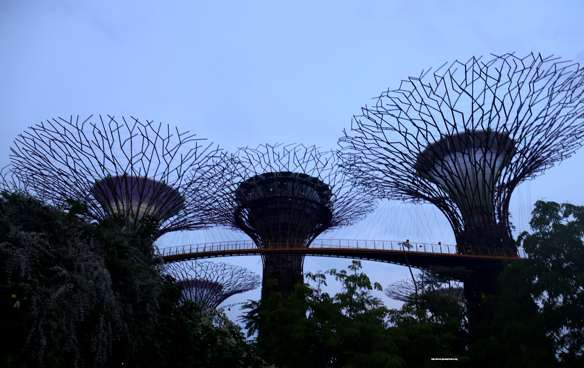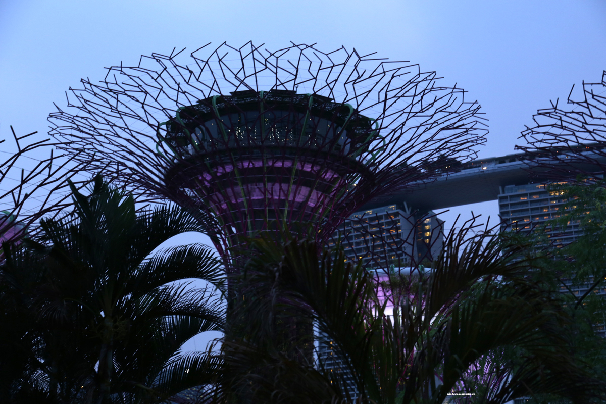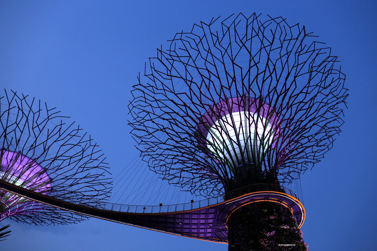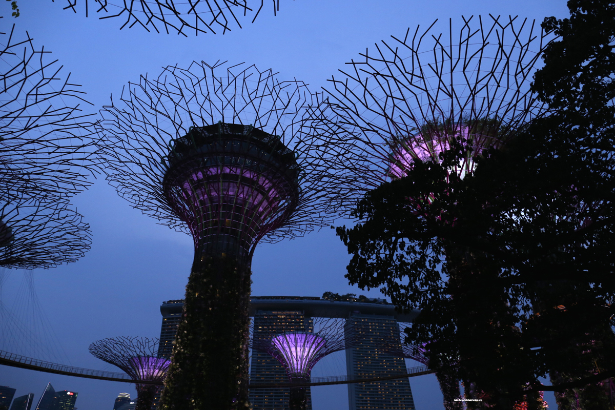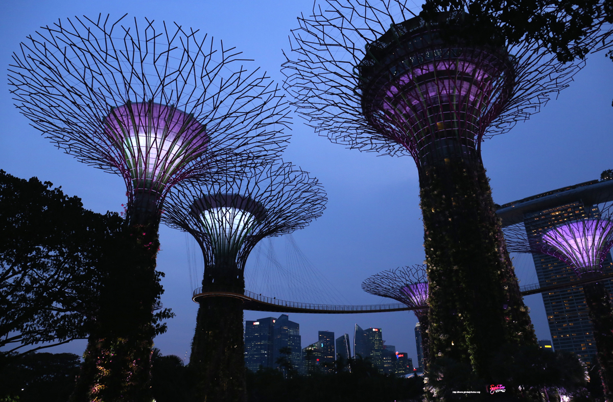 Gardens by the Bay features artificial tall trees that are covered by vegetation and light up at night.