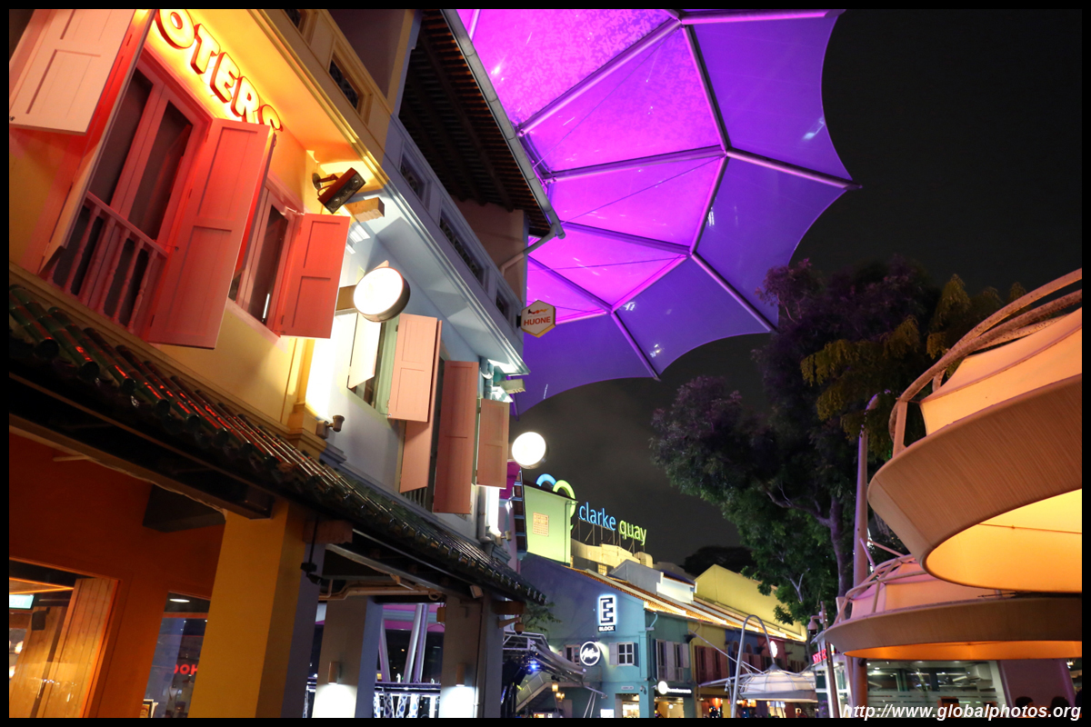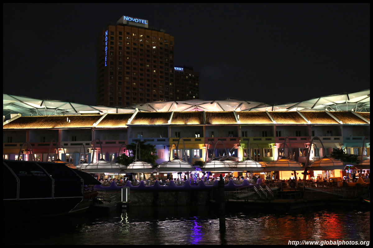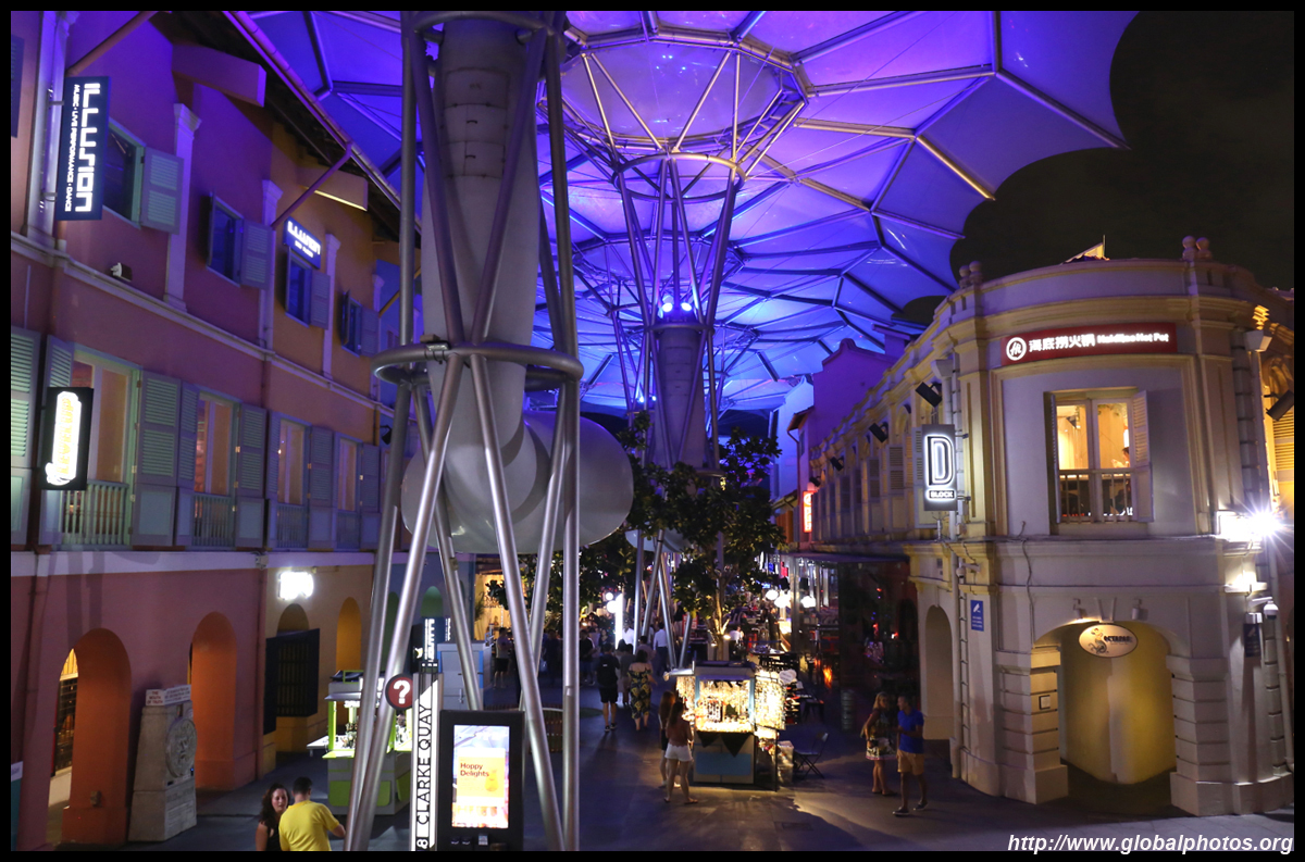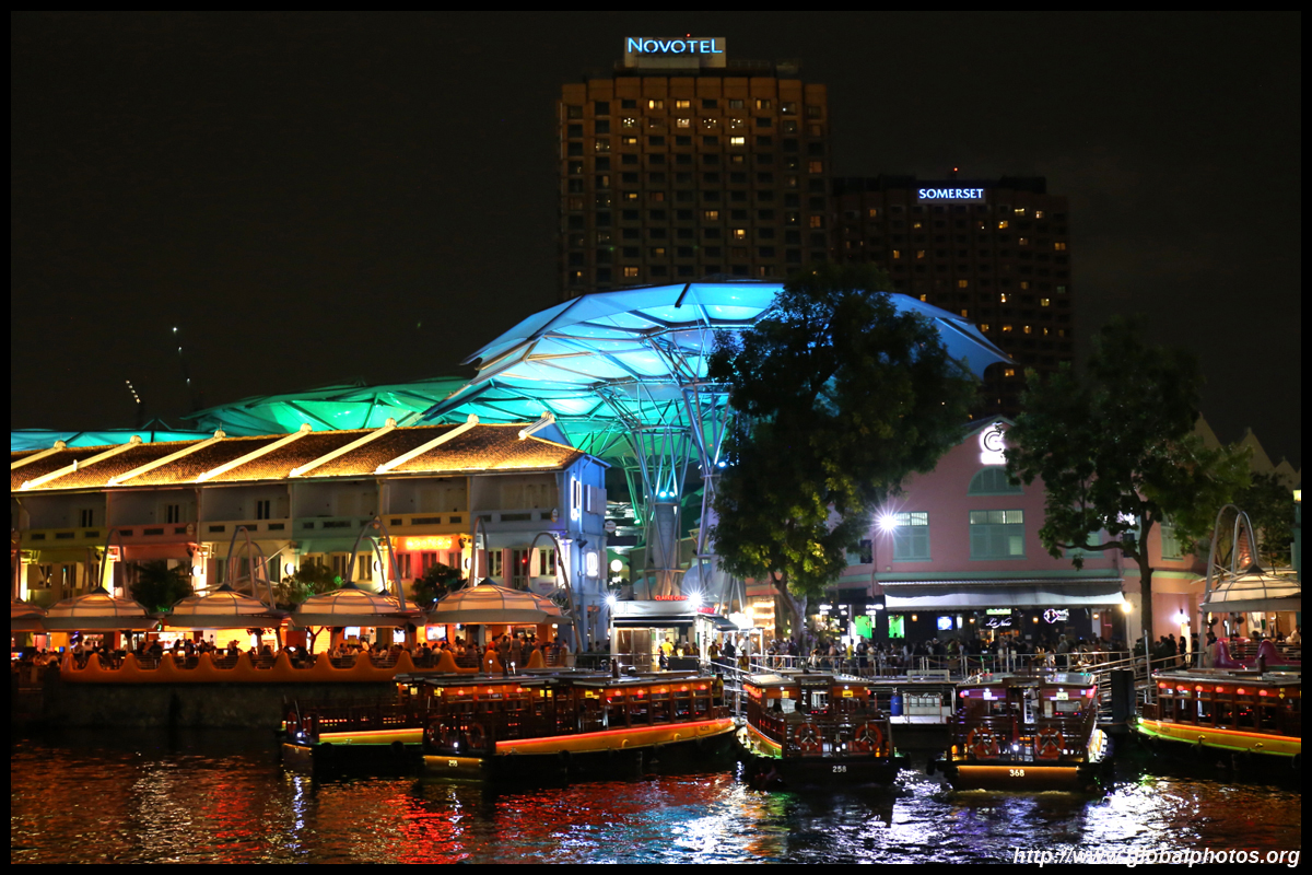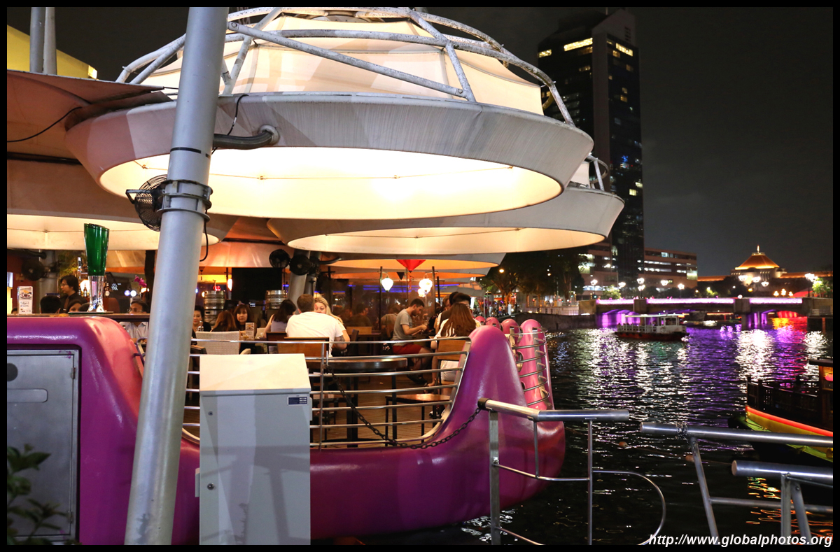 Clarke Quay's dining areas are wrapped under interesting canopies suspended above the river.