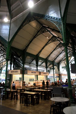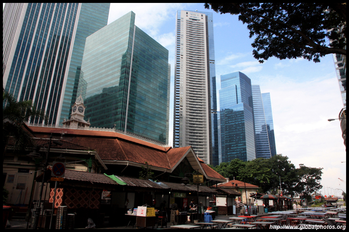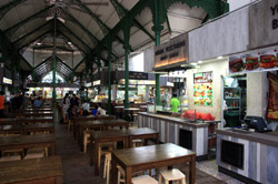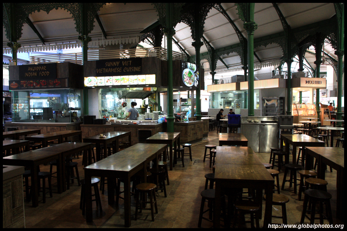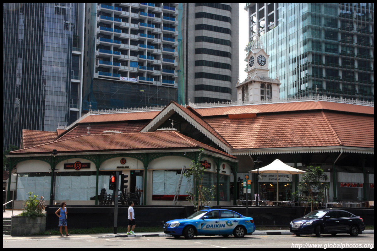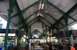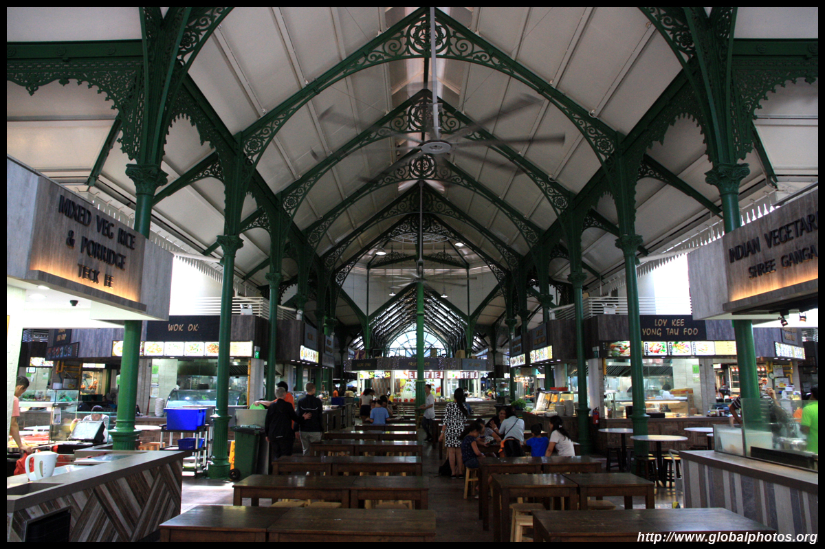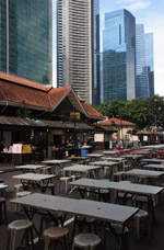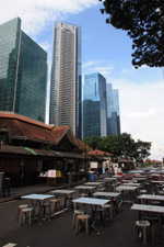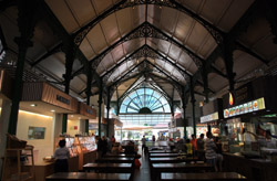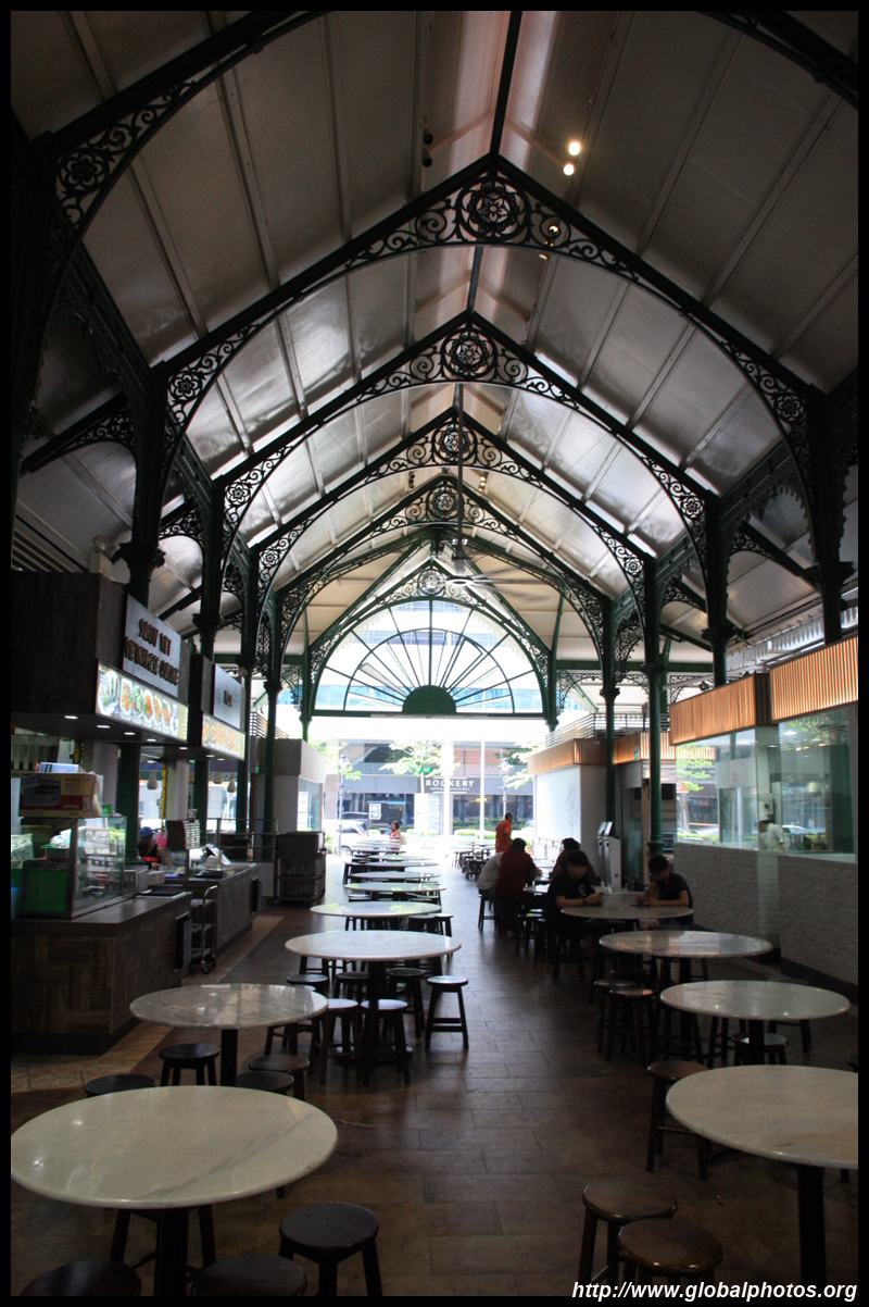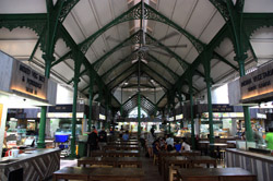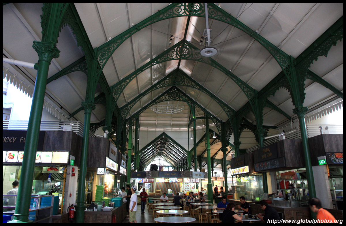 Lau Pa Sat was built in 1894 as a market, with its cast-iron support structure made in Glasgow and shipped to Singapore. It is a favourite lunch location for office workers in neighbouring skyscrapers.