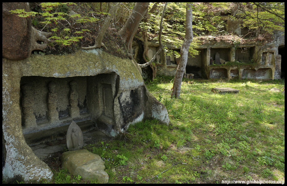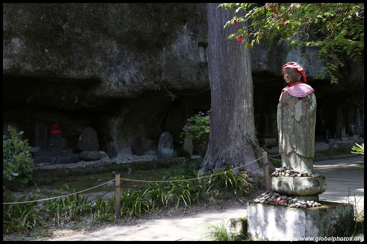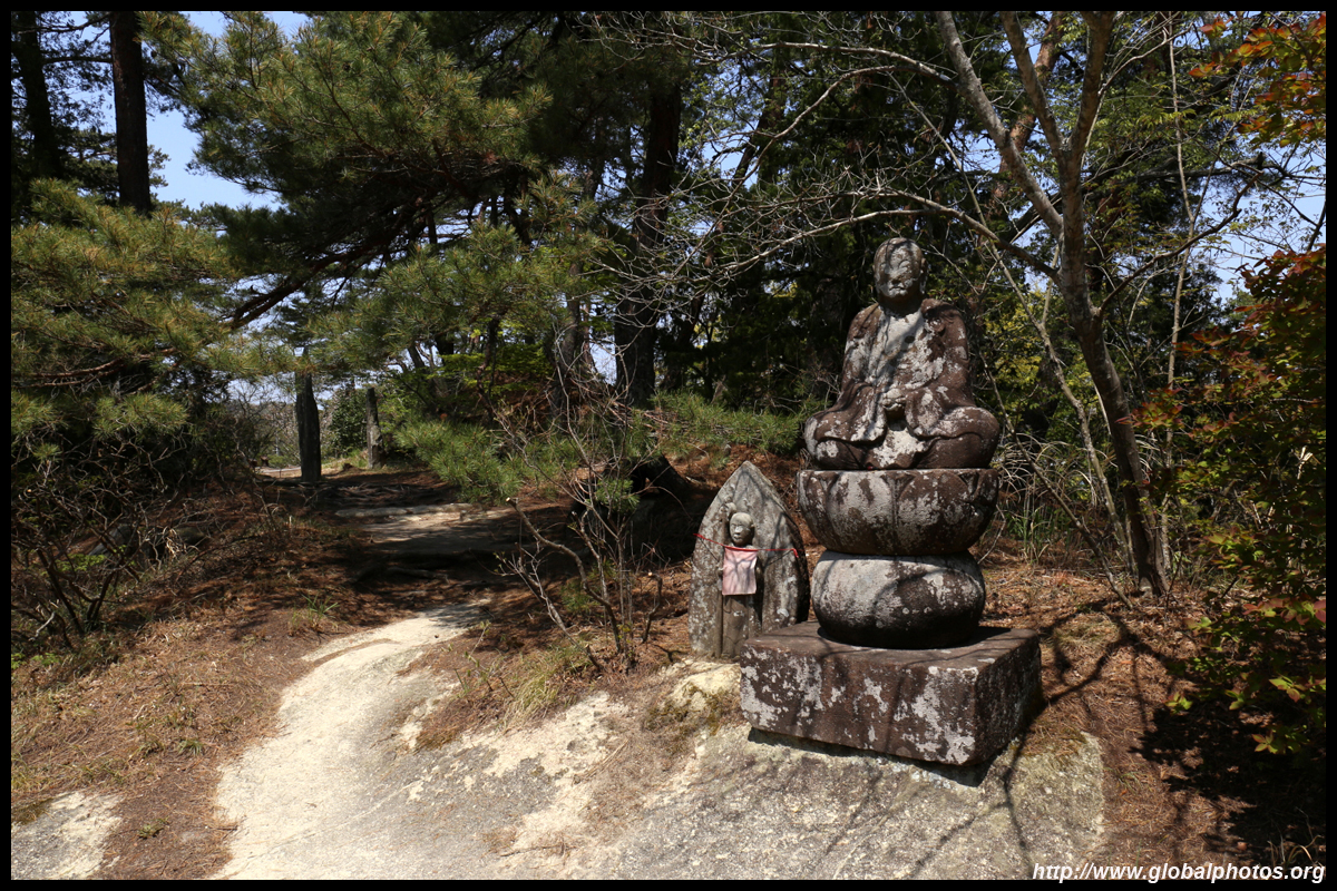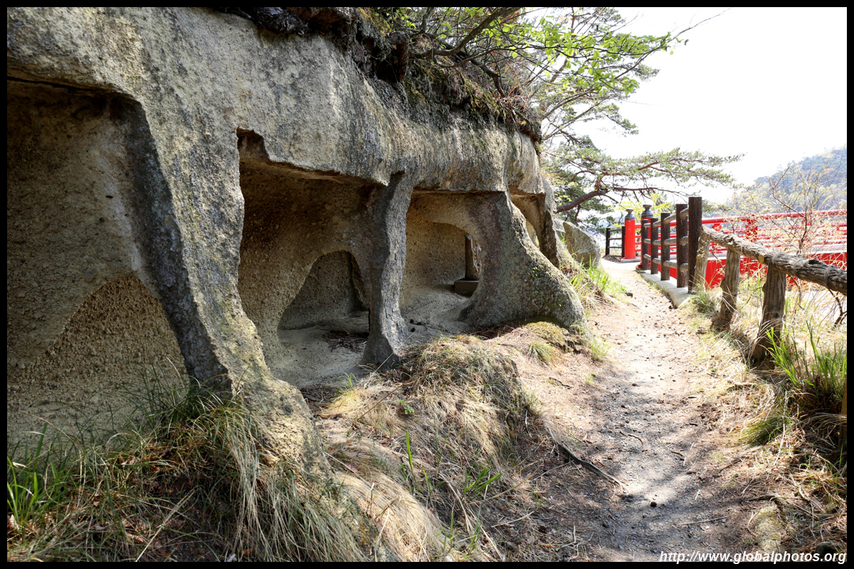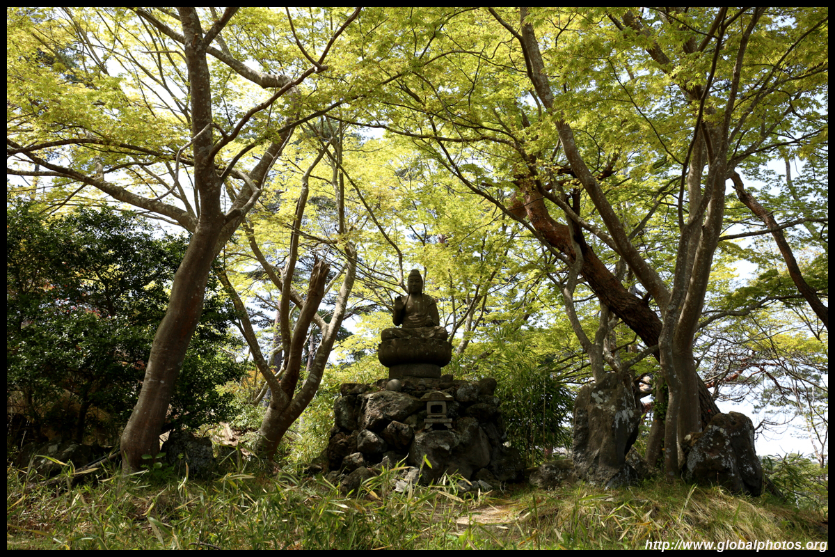 Oshima is just off the coast but connected via a bright red bridge. Stone tablets and caves dot the island, which is sacred for Buddhists.