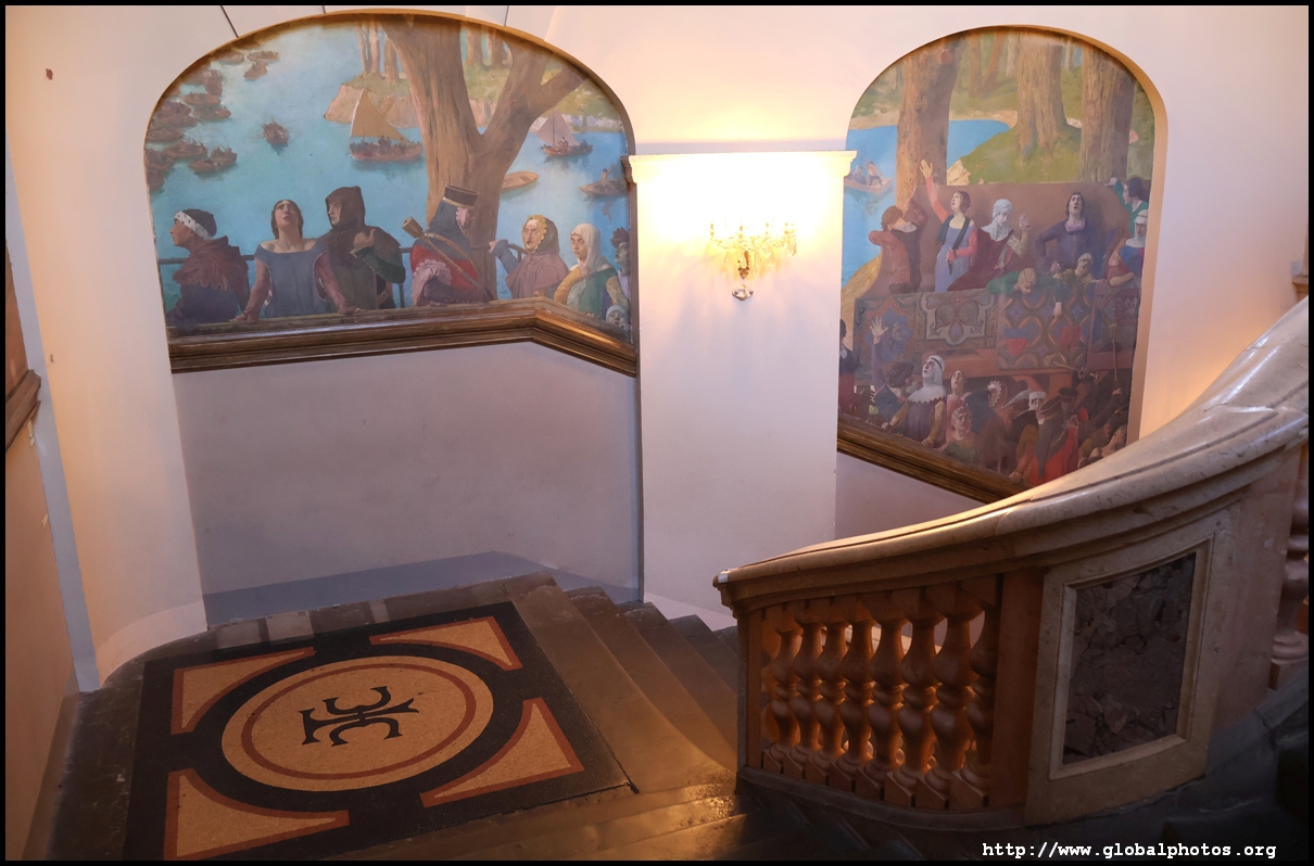 The grand entrance is already impressive with the decorated staircase heading up to the first room.