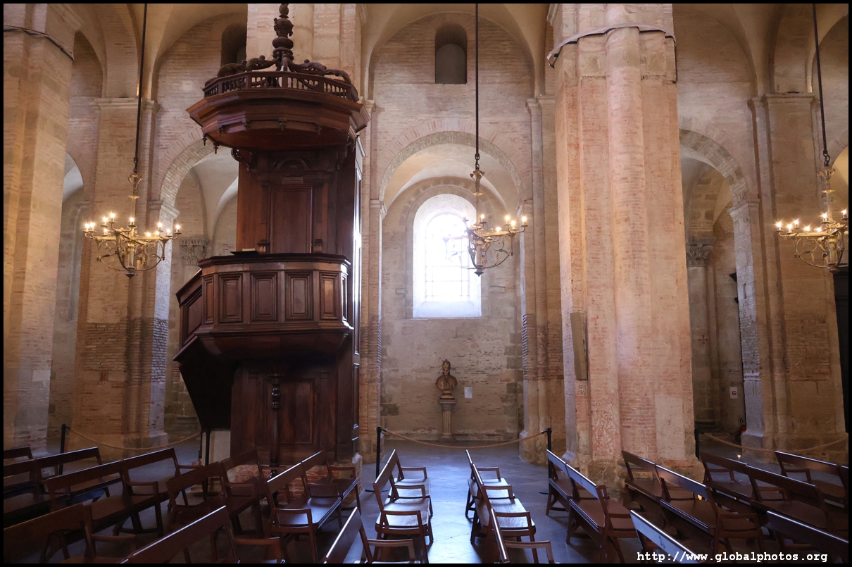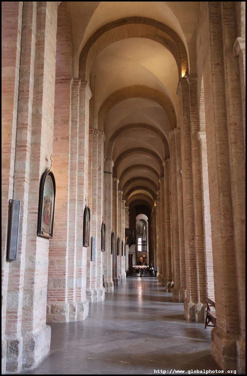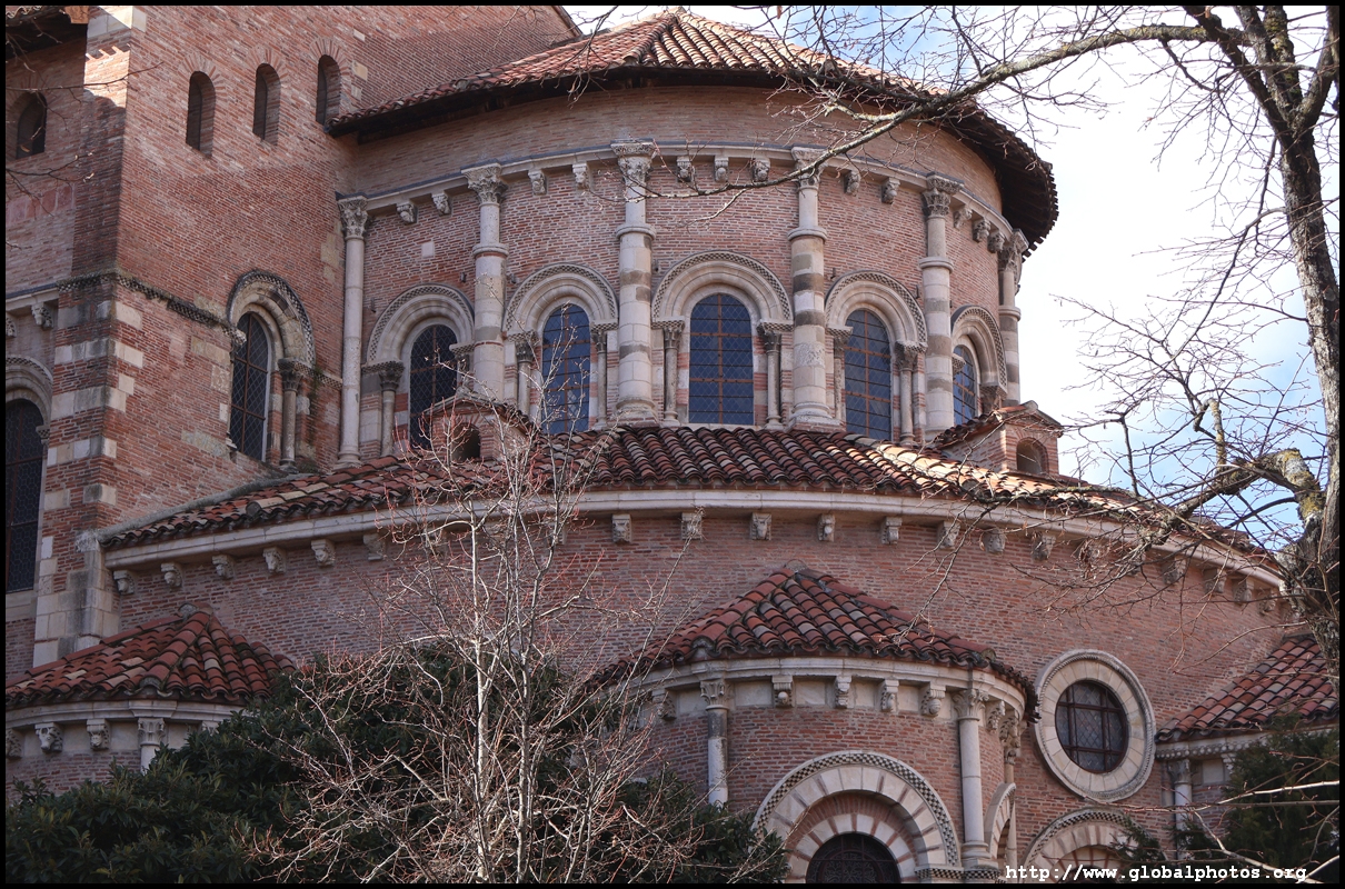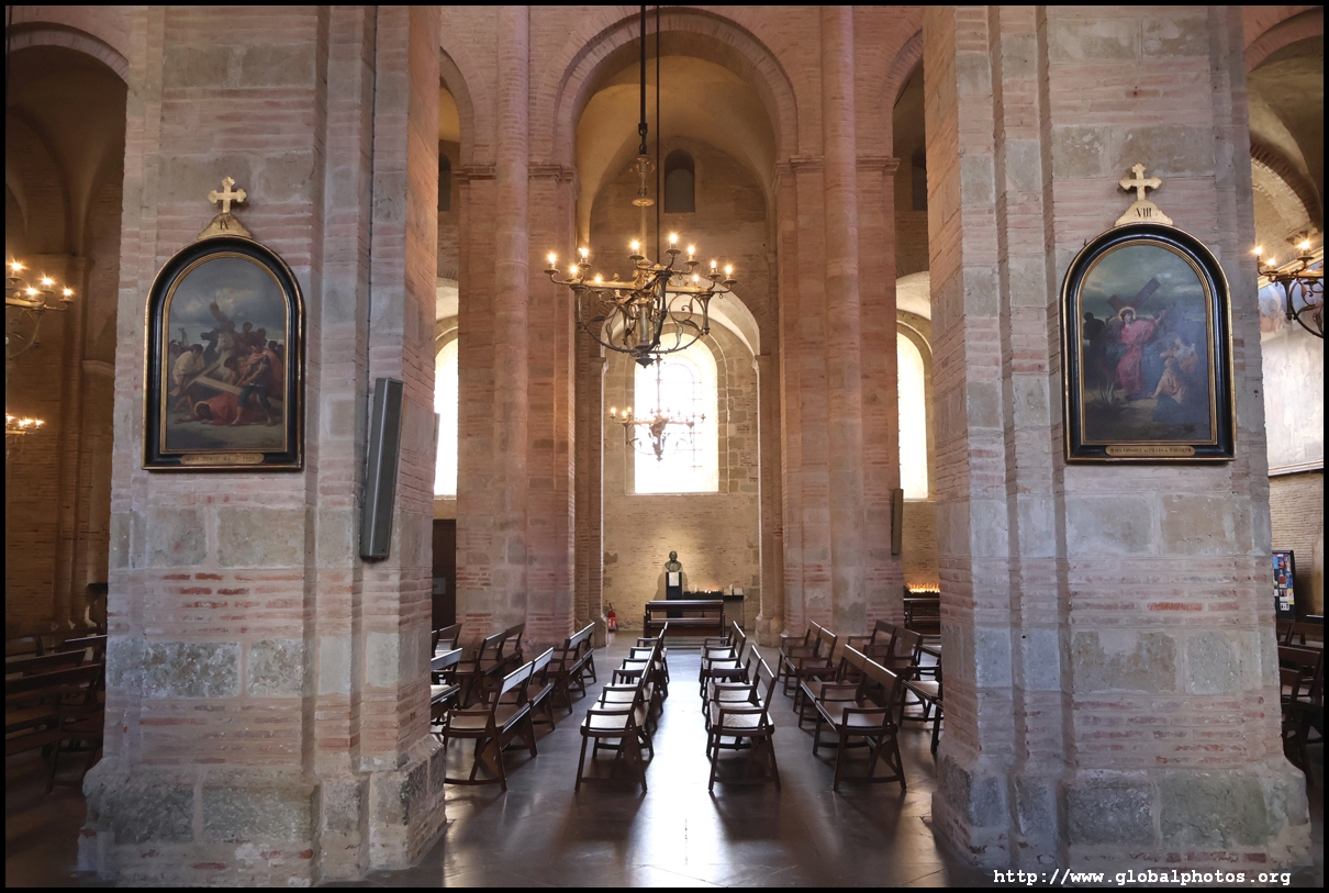 Around the corner is the Saint-Sernin Basilica, the largest Romanesque church in the country. Dedicated to St. Saturninus, Toulouse's first bishop, the church was consecrated in 1096 with construction continuing until the 14th century. The huge interior space was designed to handle pilgrimmage crowds bound for Santiago de Compostela.