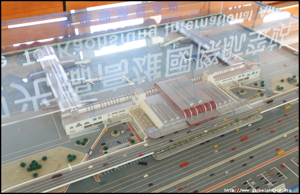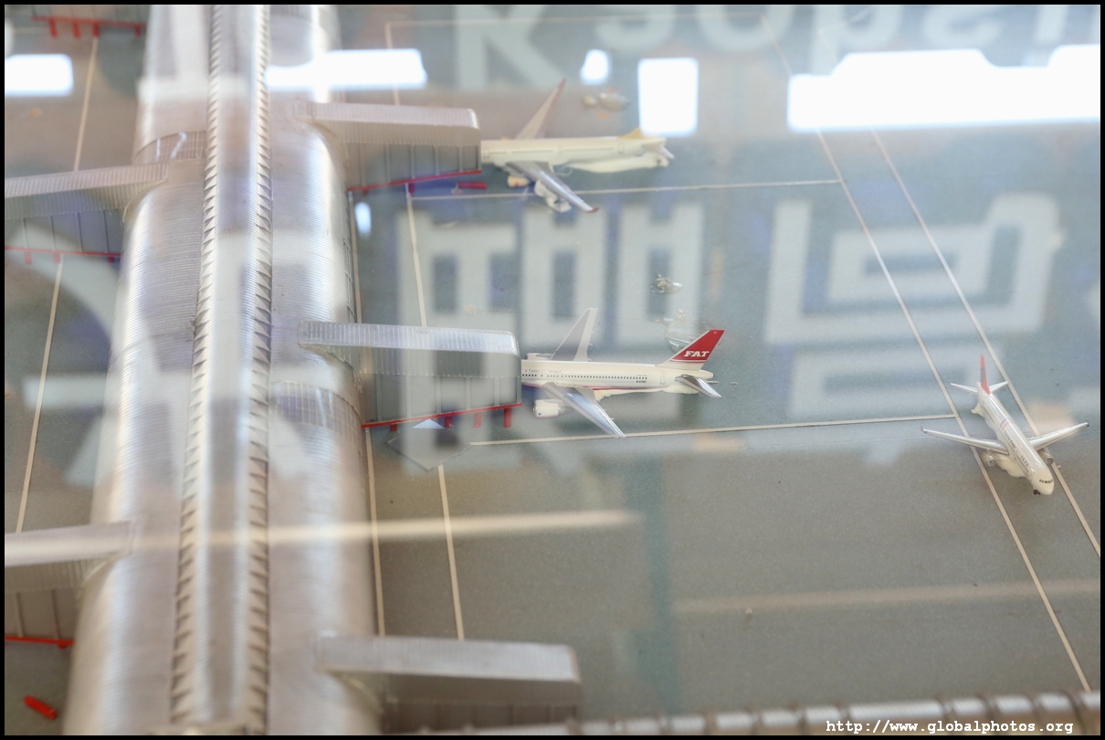 I decided to go up to the bridge, which is a step-free way to the international departures hall, although even that opens up to the outside along a bit of the covered taxi drop-off area before entering the terminal's doors. Greeting me at the elevator exit is a scale model of the terminal with Dragonair and FAT airplane models parked at the gate.