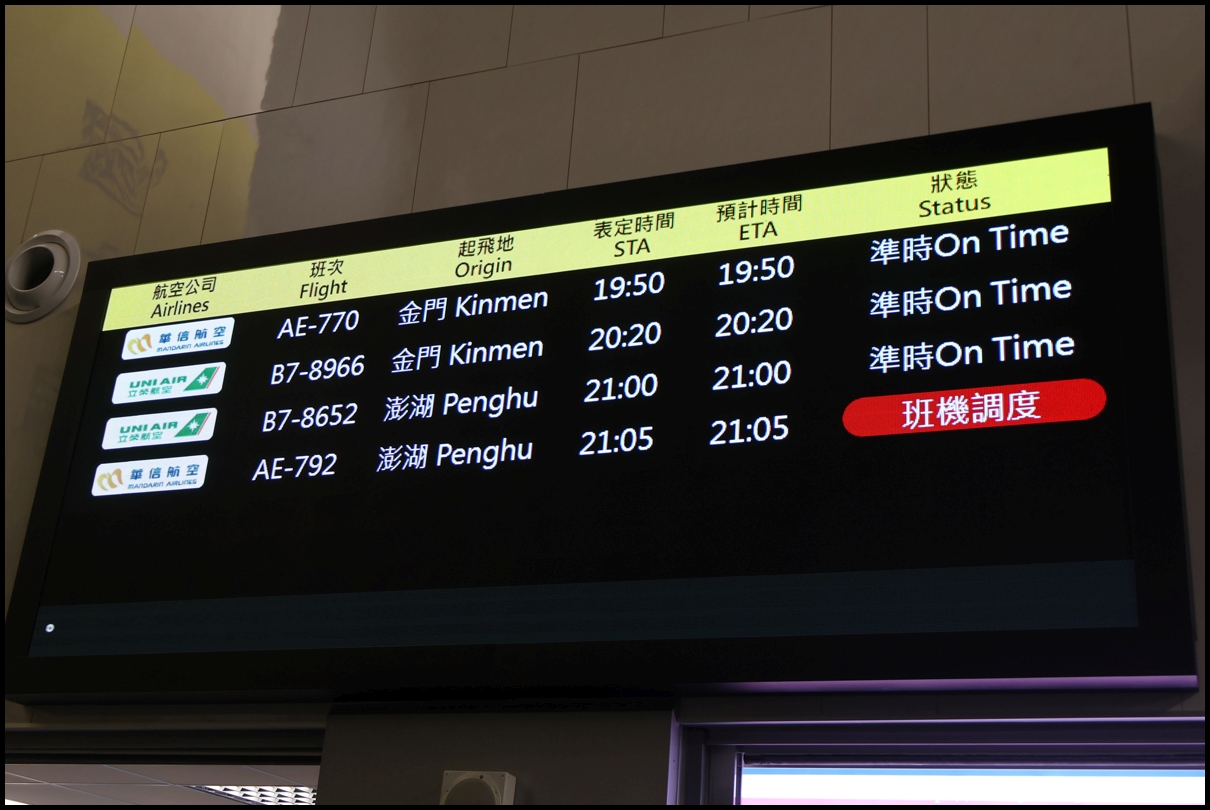 With the time at barely 7pm and an 8:35pm departure, I explored land-side a bit and headed down the hall to the domestic section - both are under the same building. It was even quieter here with flights only to the outer islands such as Penghu and Kinmen.
