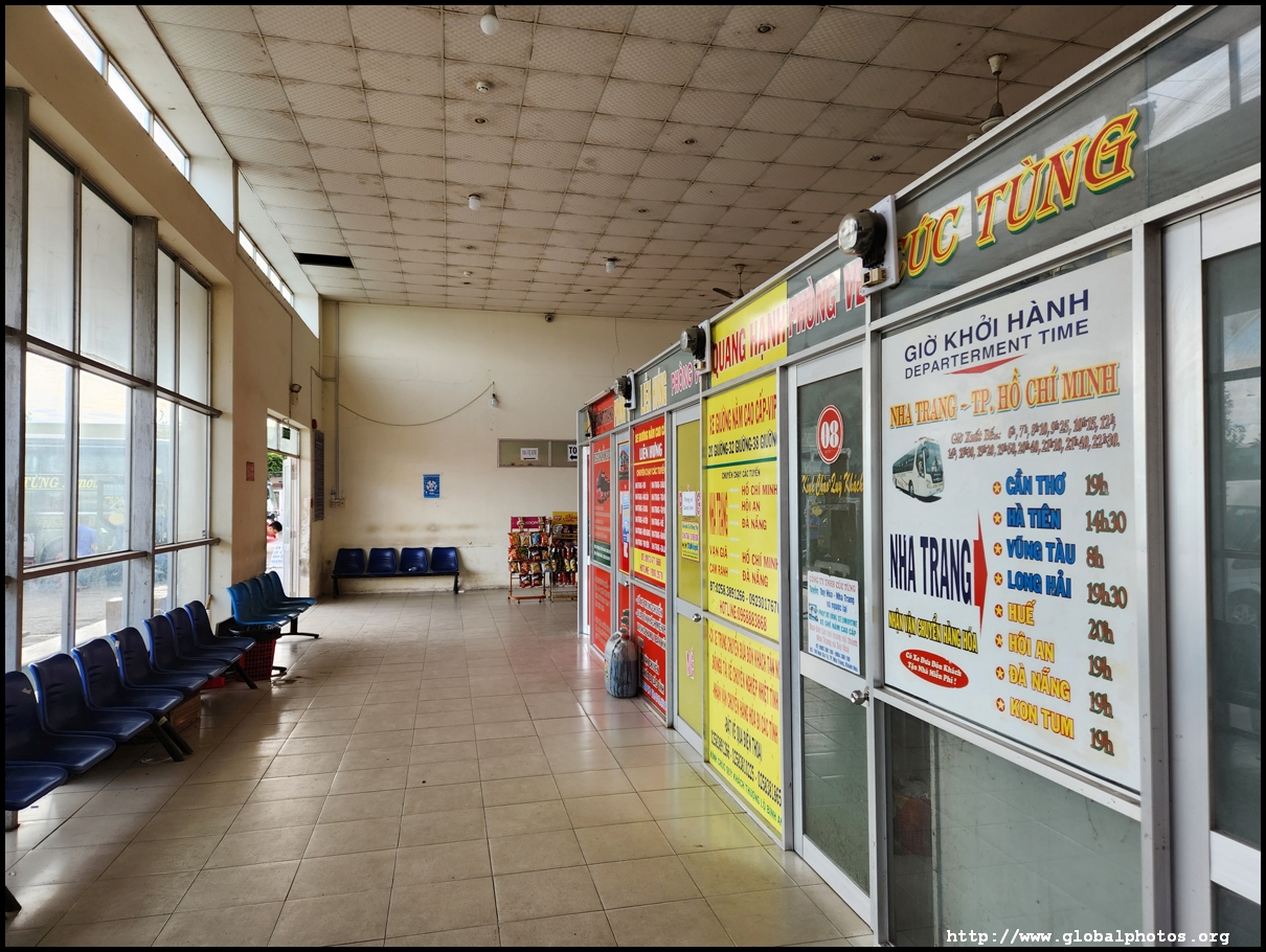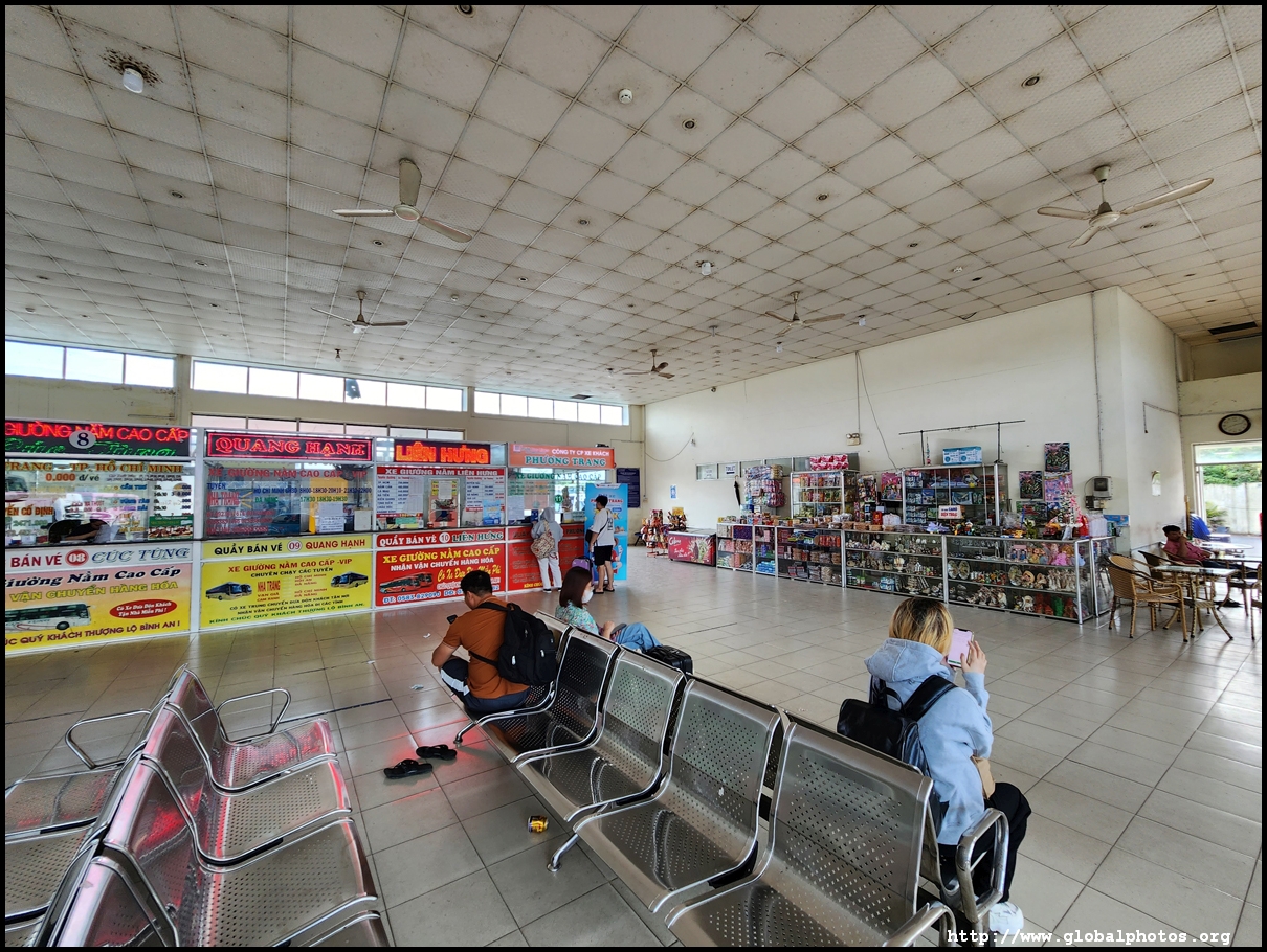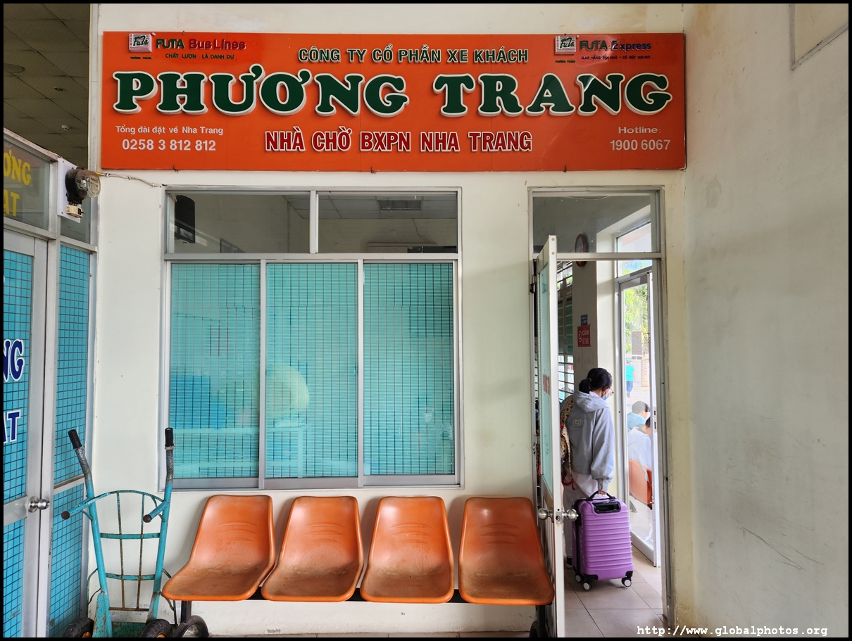 My Grab car took 26 minutes for the mostly smooth 7km journey from my beach-side hotel to the bus station, costing 104,000 dong. It's an old building but functional. I asked the orange Futa counter whether this is the right place for the bus, and the agent spoke a little English to direct me to the back for departure.
