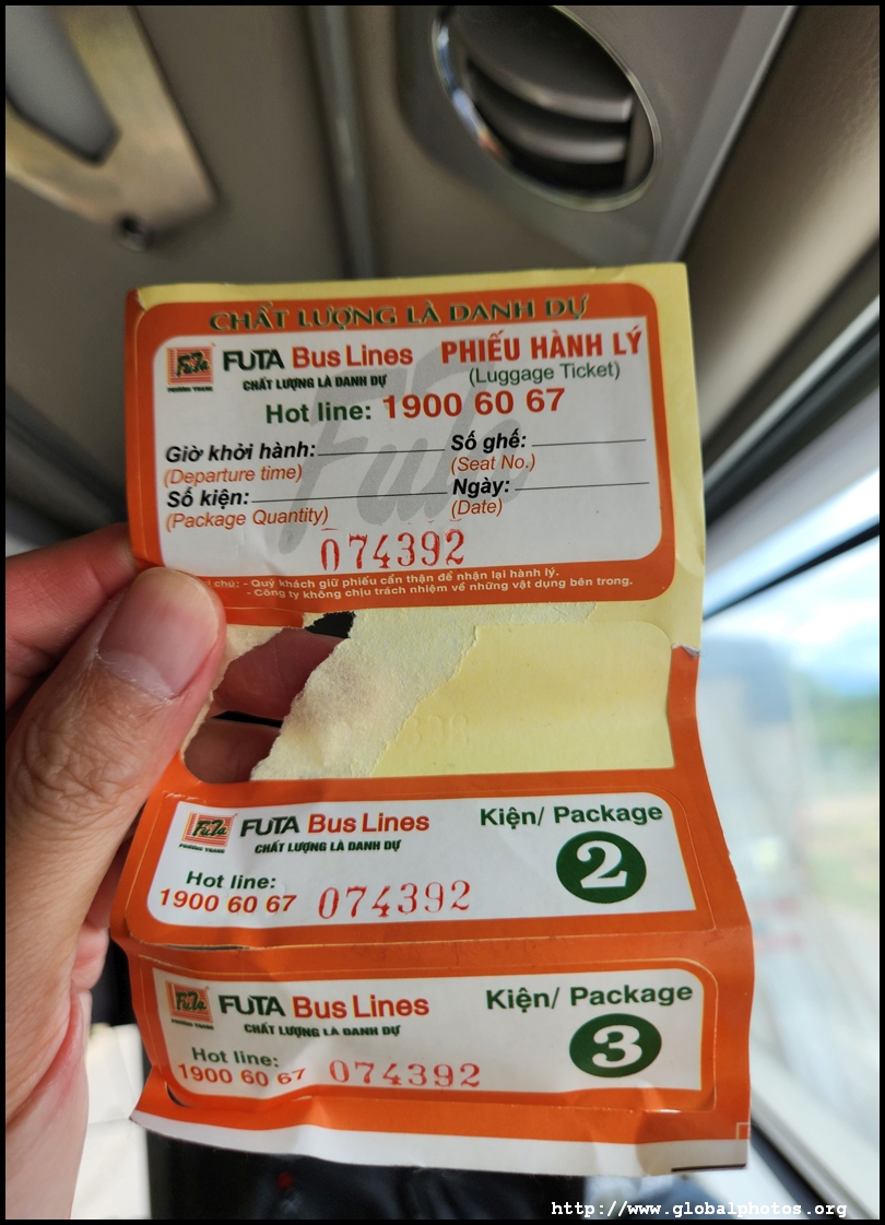 I heard an announcement with the word Dalat and knew it's time to go. The staff did signal to me to head out and the experience was quite interesting. For each piece of luggage that goes into the hold, the staff pull out a sheet of 3 coded stickers. Each bag gets one and you get the stub to keep. After they scanned my QR code ticket, I took off my shoes and boarded, putting them in a plastic bag that they had placed at the door.