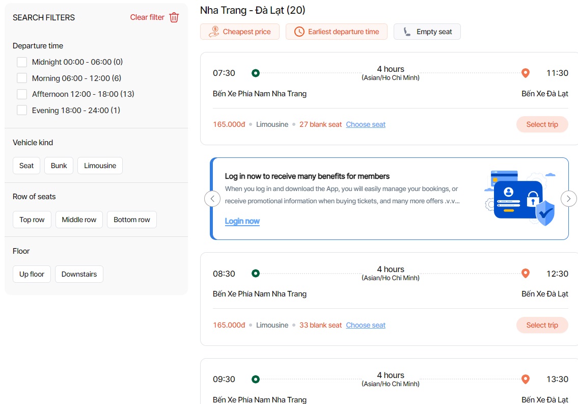 When I planned my 4 day trip to Nha Trang, I originally wanted to stay in the same hotel for all 3 nights in the beach zone and do a day trip up to Dalat. I didn't want to haul my luggage around since the two cities are only 130km apart, but Google Maps strangely clocked the drive at over 3 hours. That's when I realized a day trip would be too rushed even if joining a bus tour out of Nha Trang. So I needed to change the plan to spend one night in Dalat and enjoy their much cooler weather.Finding a shared minibus company to book online or via travel aggregators was unfruitful. I wanted to get to Dalat as quick as possible, so a smaller vehicle with about 10 tourists would have been a lot more flexible. Asking my Nha Trang hotel for help, they surprisingly replied quickly, suggesting to use Futa and providing a website to book. Since I was travelling on the independence day long weekend, I wanted to pre-book my roundtrip ticket to avoid disappointment, so even a big bus would have to do. Futa's website has an English version and it was easy to find availability. They depart hourly with a listed time of 4 hours. I opted for the 8:30am service so not to wake up before sunrise. The bus terminus in Nha Trang is quite a way out of the city centre, so I would factor in at least 20 minutes for that.