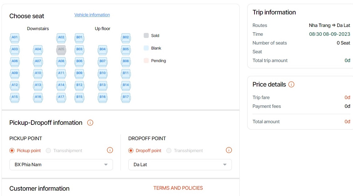 After selecting the departure time, the website would direct me to seat selection. This route is run by sleeper buses in a double deck configuration.