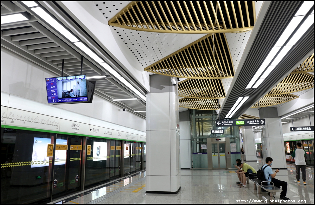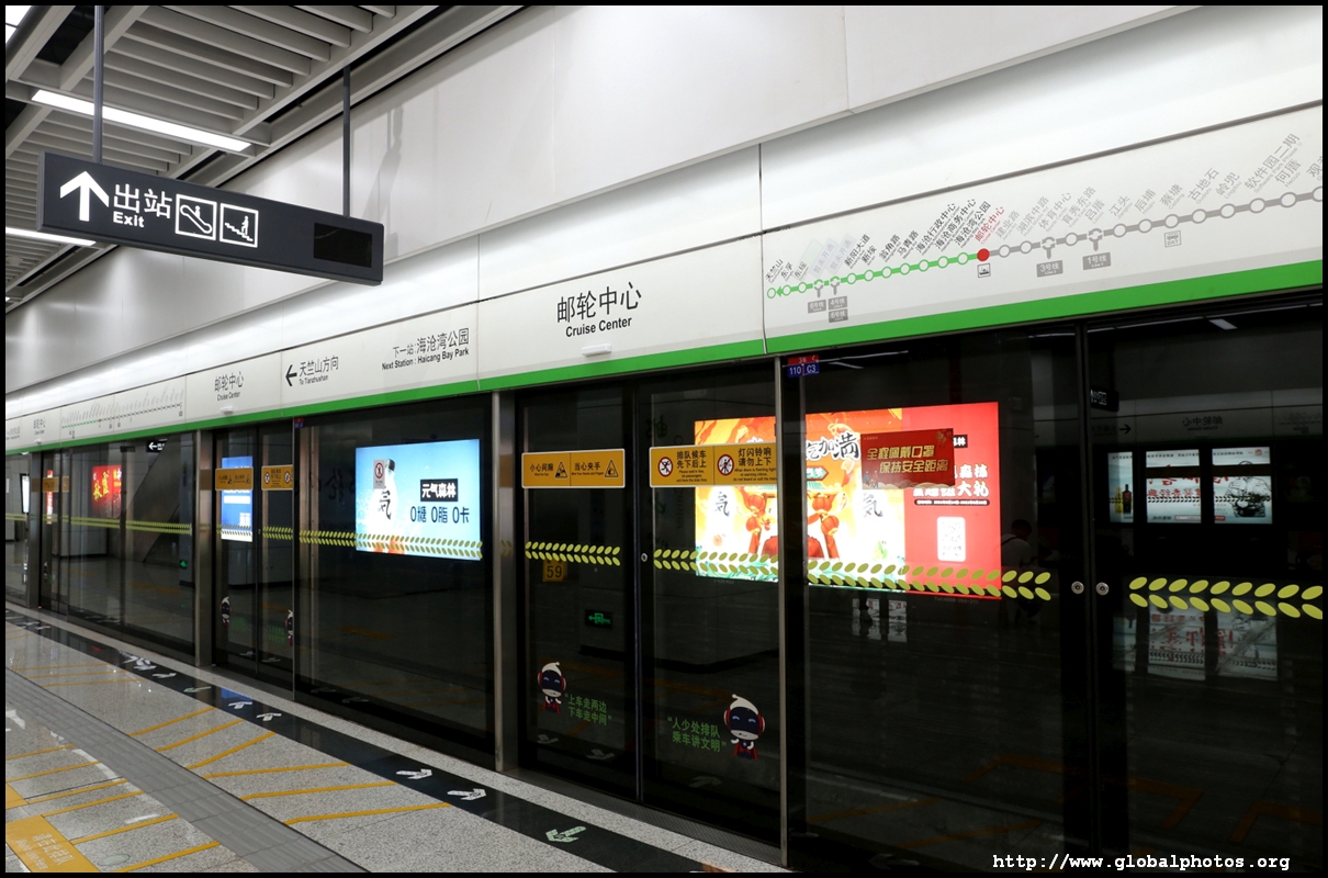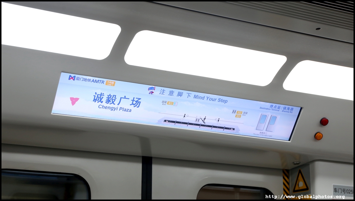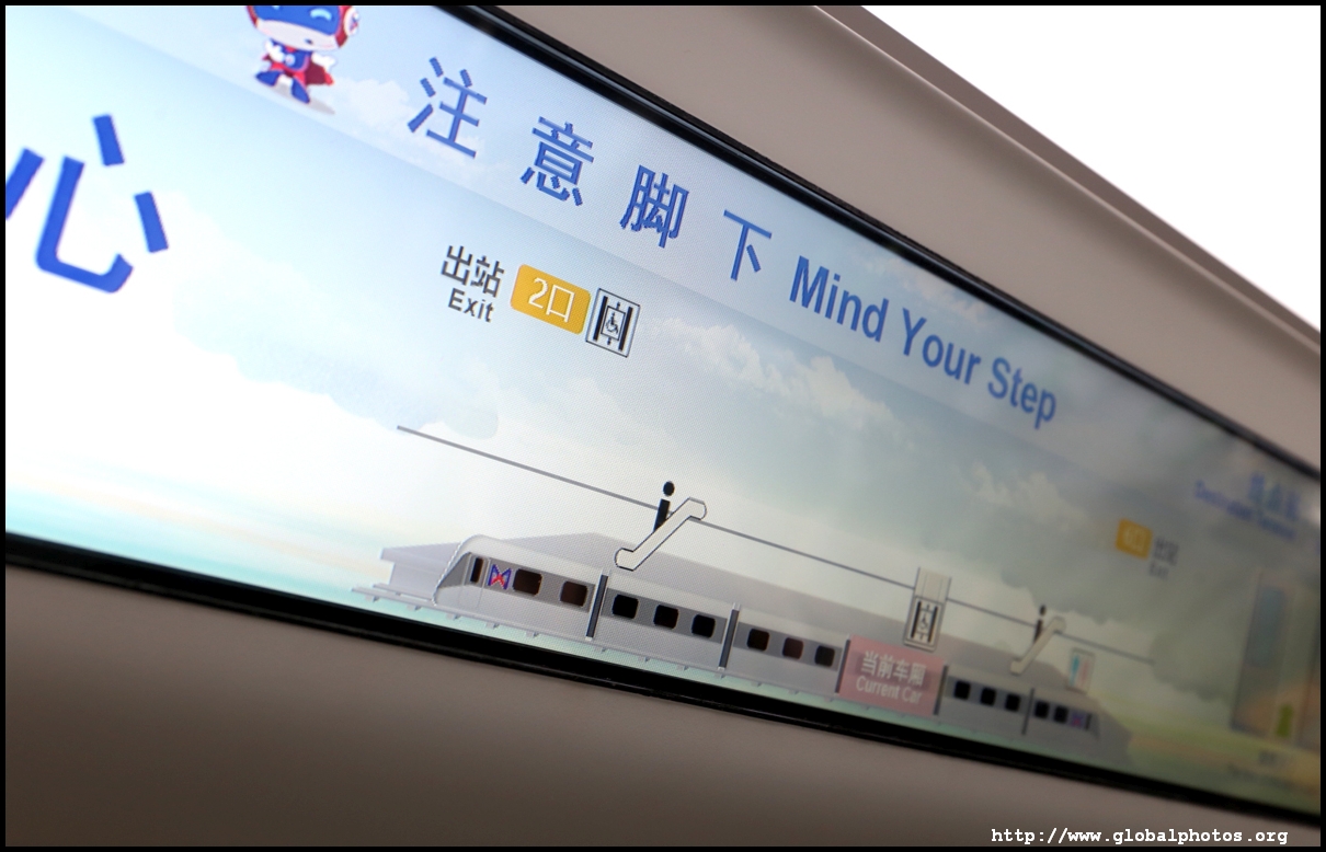 Screens above train doors show which car you are in and where is the nearest escalator or elevator at the upcoming station. Announcements are made in local dialect, Mandarin, and English.