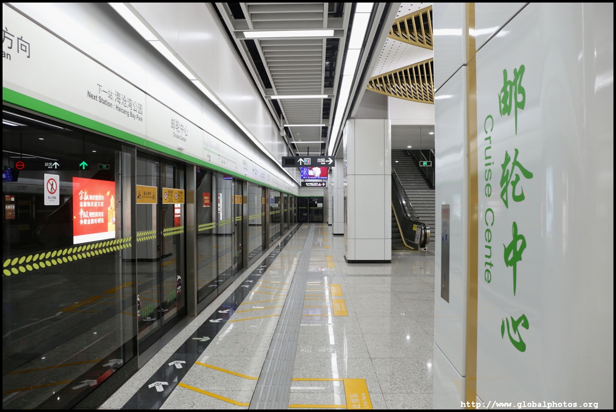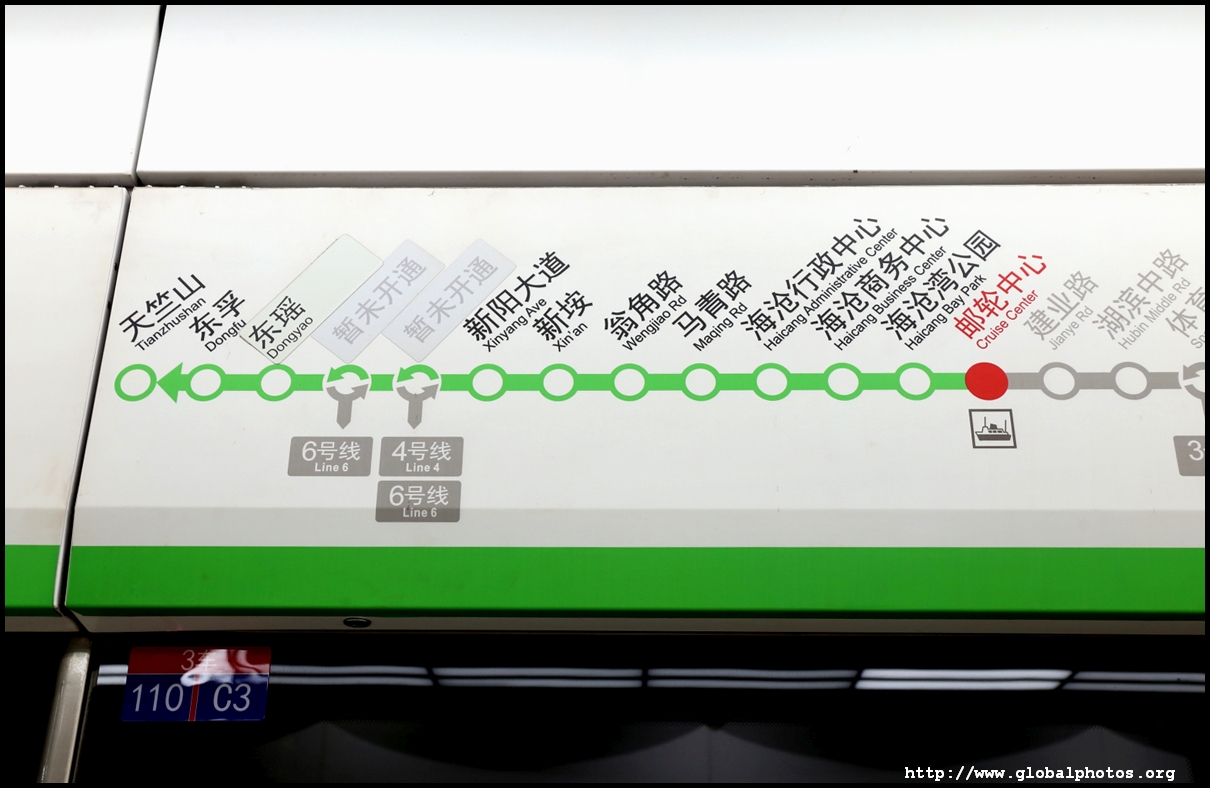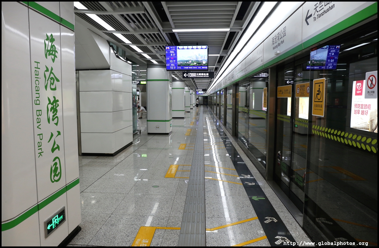 Screens above train doors show which car you are in and where is the nearest escalator or elevator at the upcoming station. Announcements are made in local dialect, Mandarin, and English.