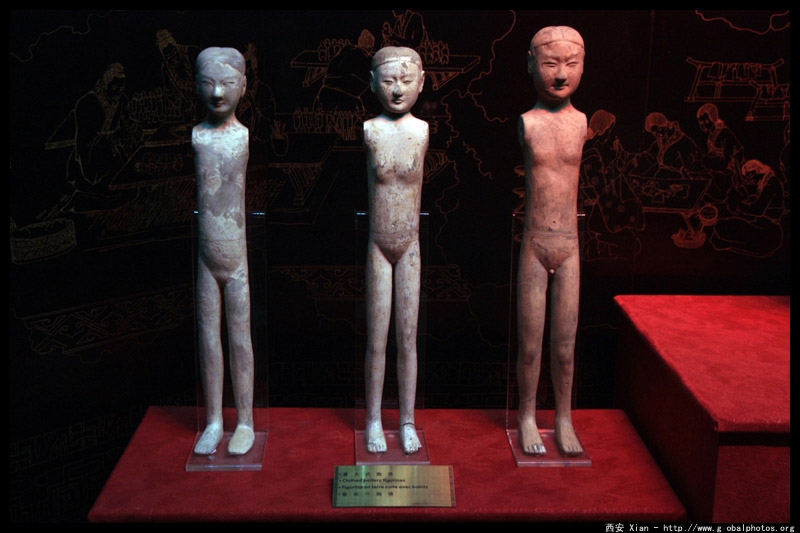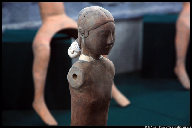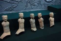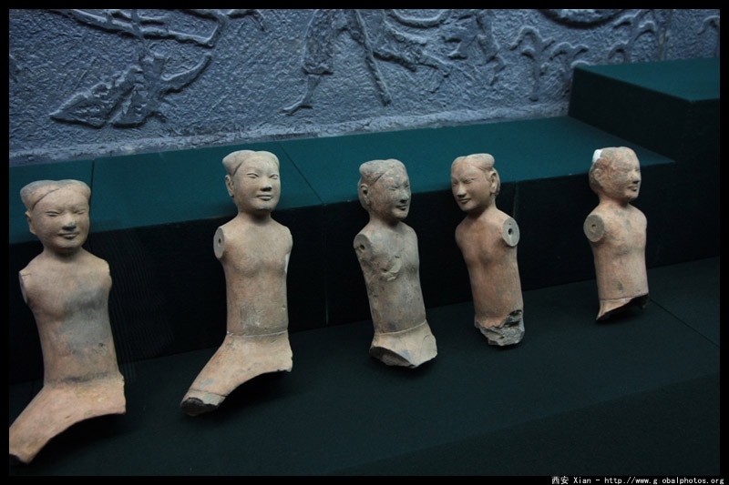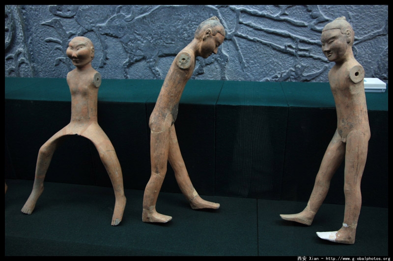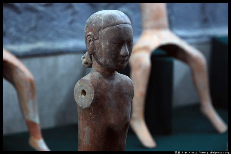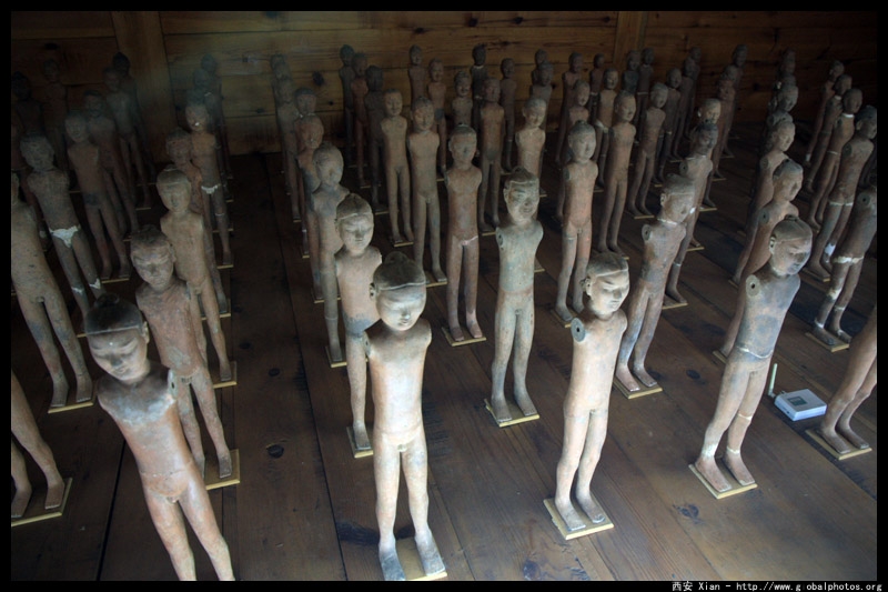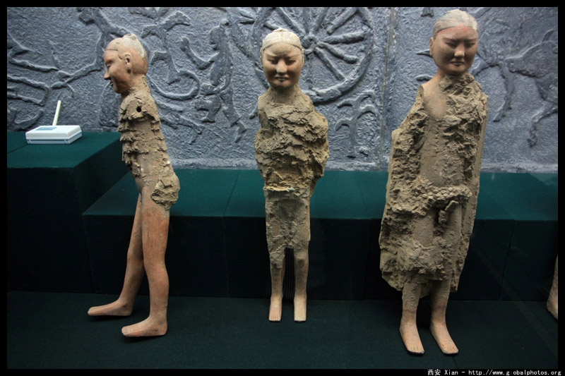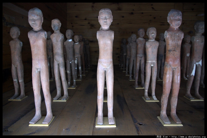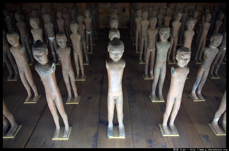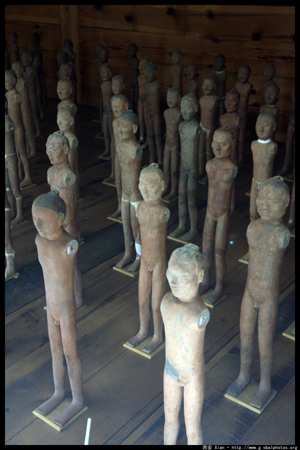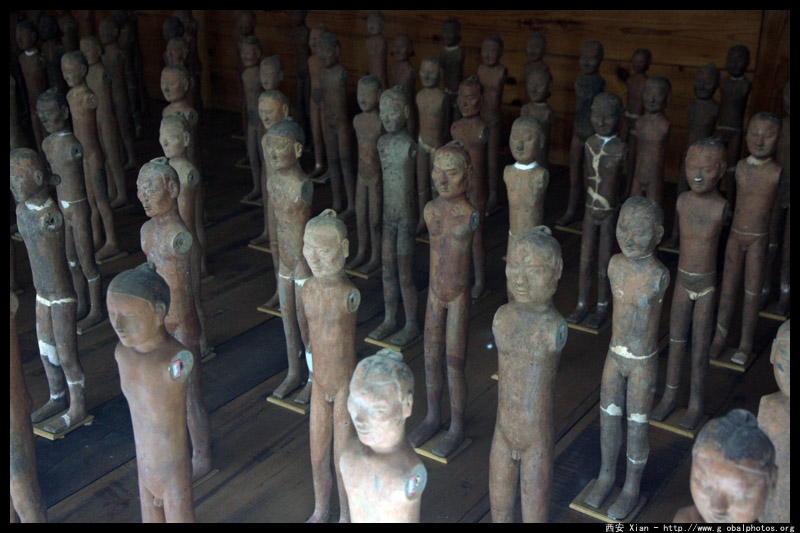 The Han figurines were clothed, but time has destroyed those. The arms and hands were made of wood and could move, but those have also not survived the test of time. What remains today are the heads, bodies, and legs, which look quite eerie.