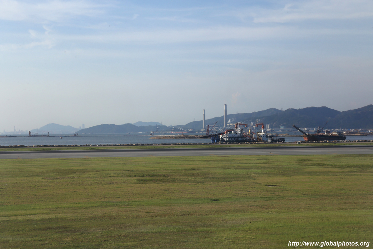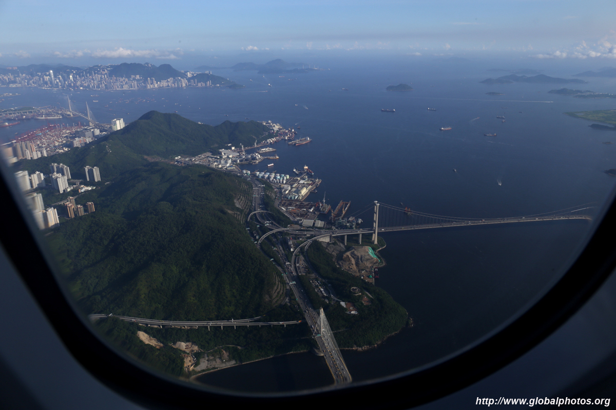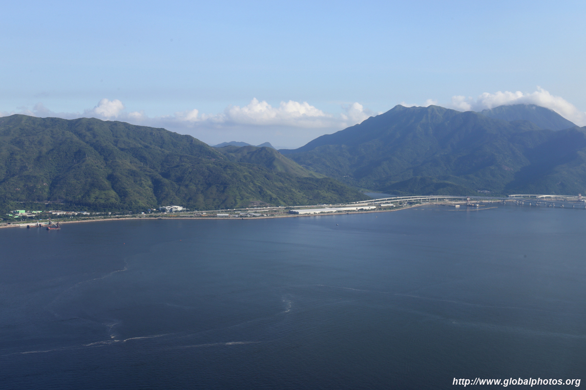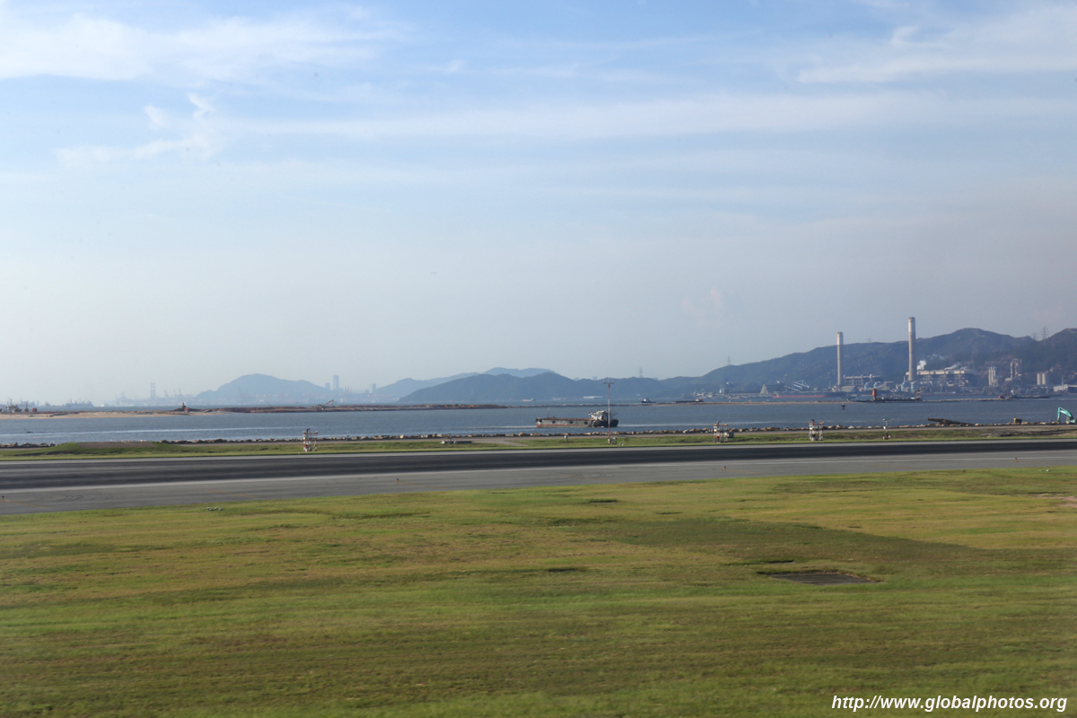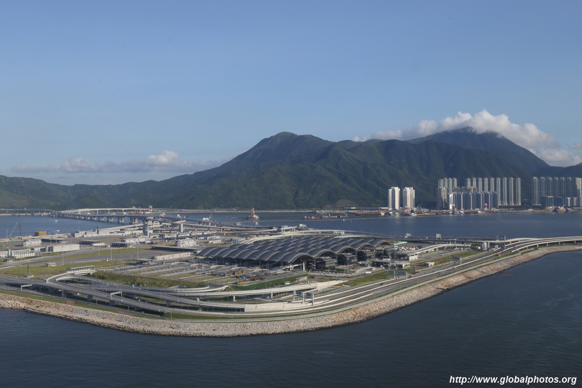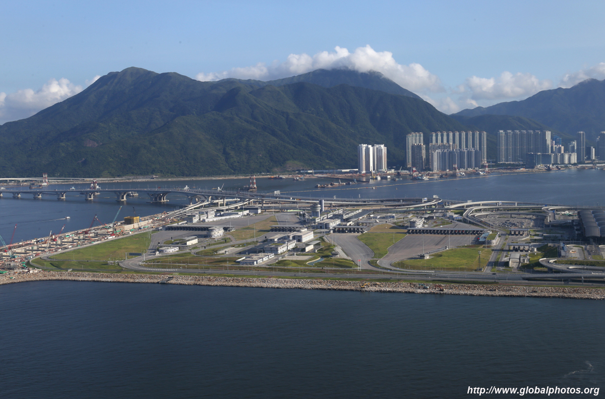 On final approach, the boundary facilities of the new bridge to Macau and Zhuhai are visible, mostly empty. Cars and trucks still don't frequent this new piece of infrastructure yet, although buses are packed full even if they depart every few minutes.