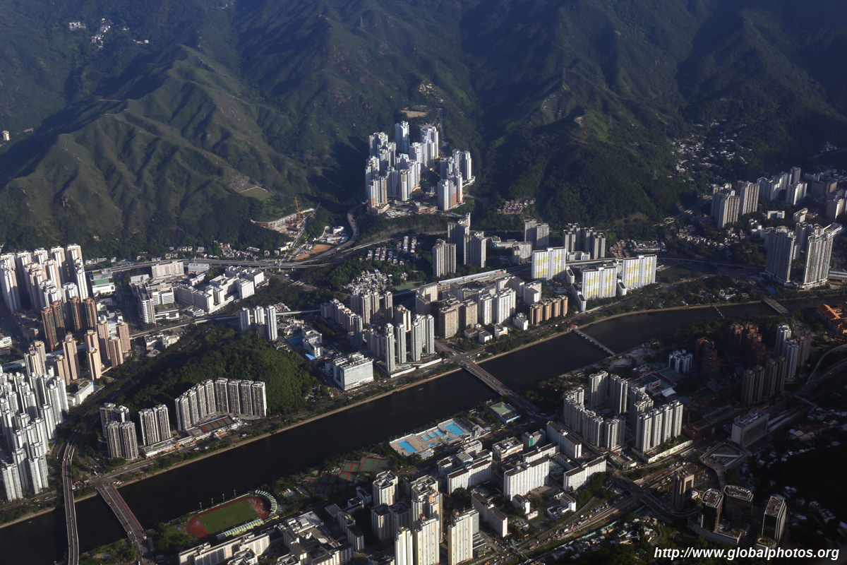 The suburb of Shatin is wedged between tall hills. The once stinky Shing Mun River is now a pleasant place for a jog and fish can survive in there once again.