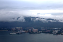 The suburb of Ma On Shan has a dense but thin corridor of residential skyscrapers facing the water.