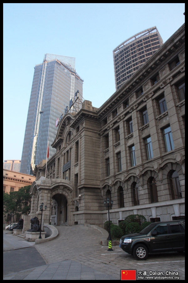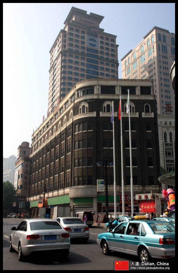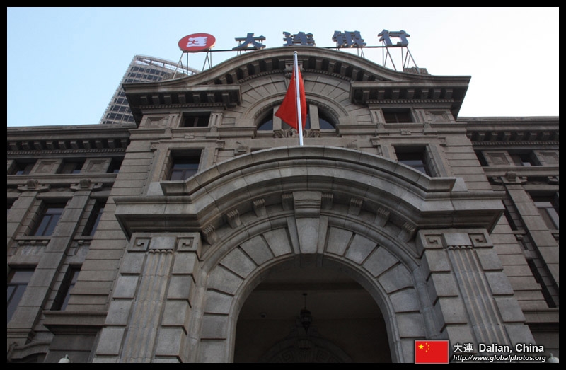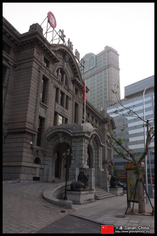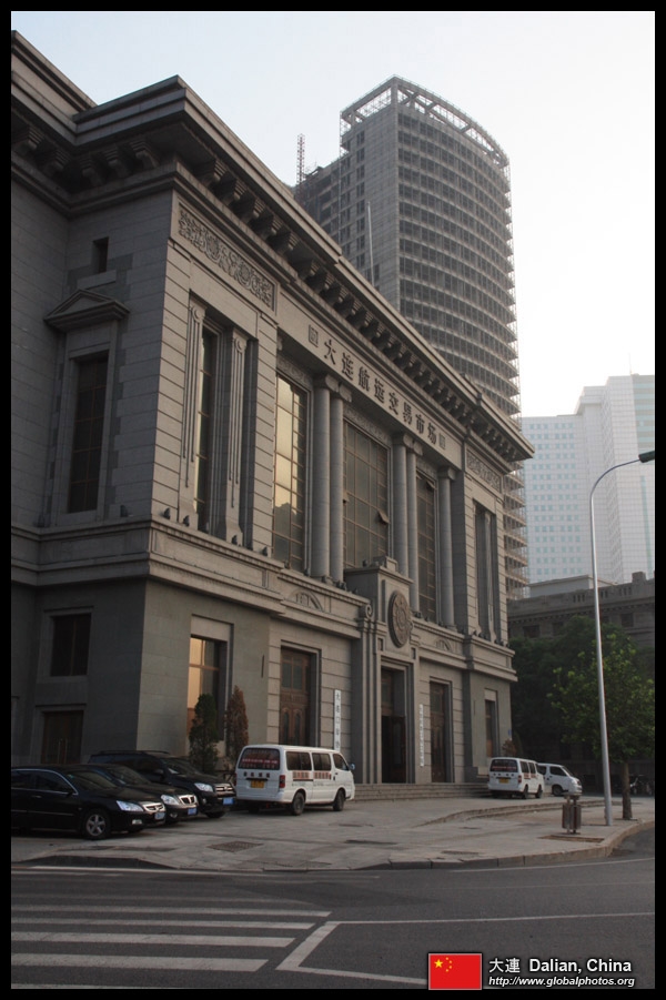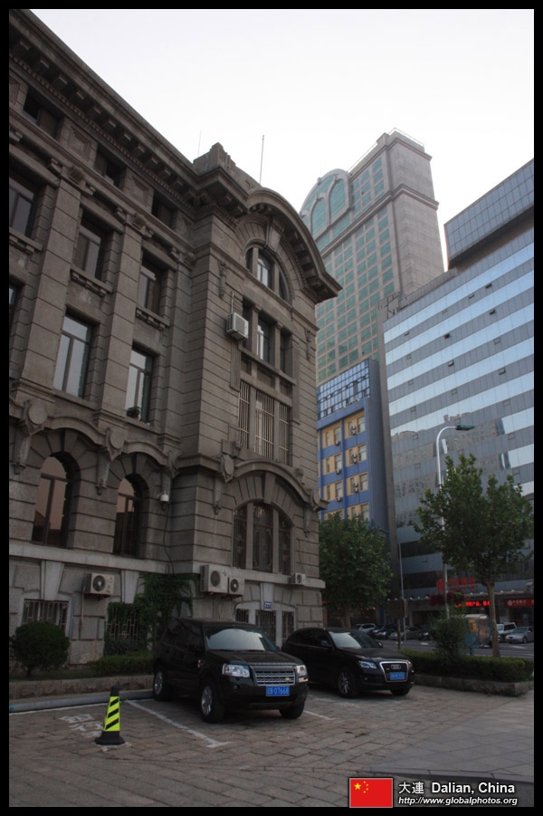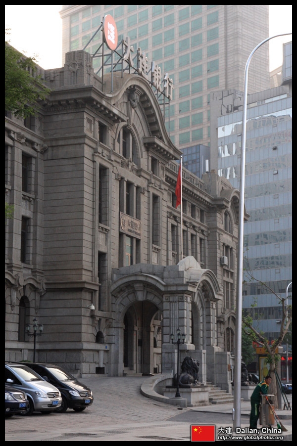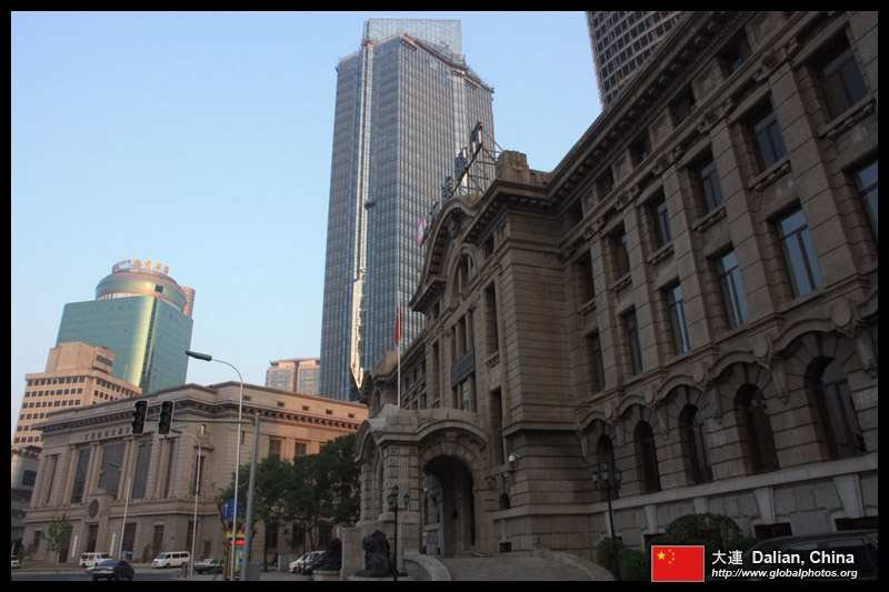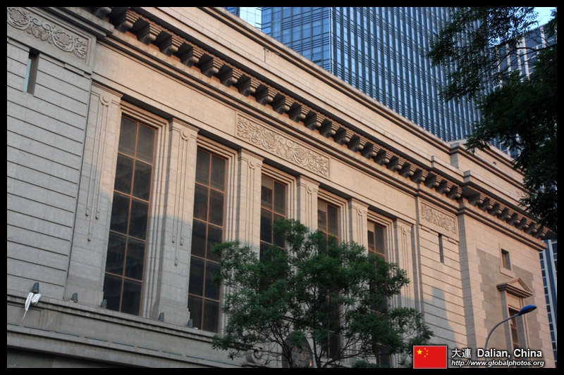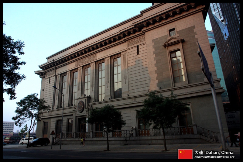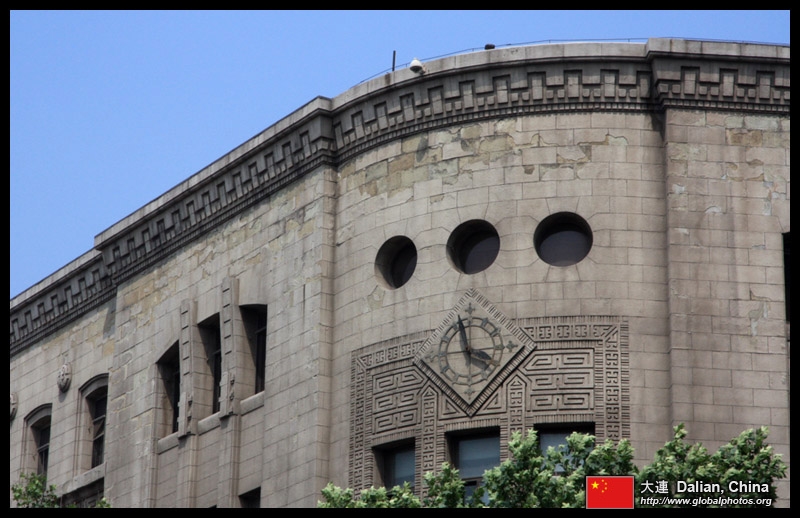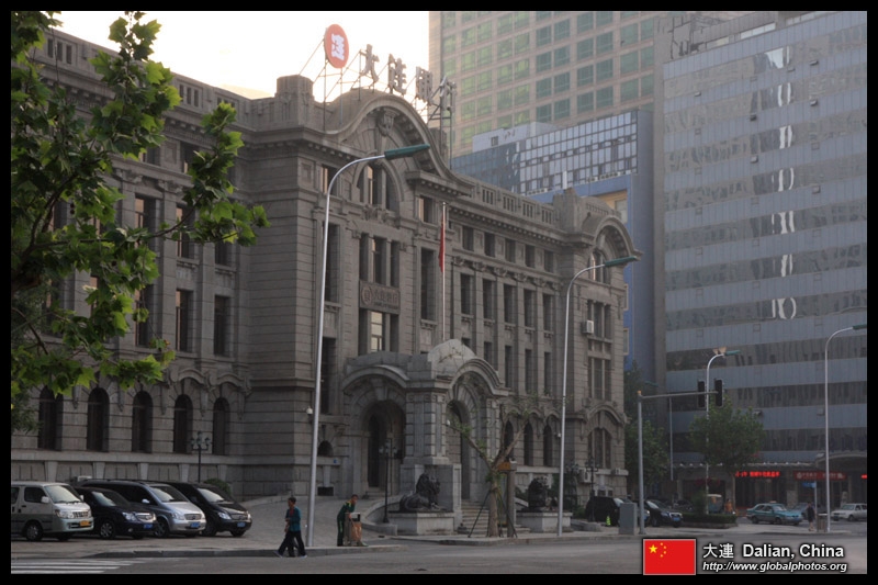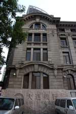 Dalian is a city of squares. Minzhu Square is to the northeast of Zhongshan Square, but it isn't a pedestrian spot, but more a spacious tram stop, bordered by buildings like this historic one.
