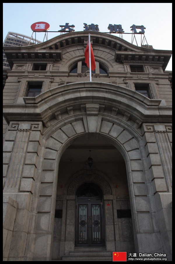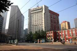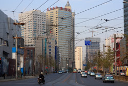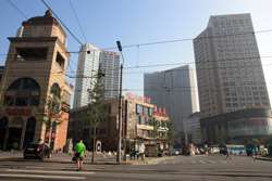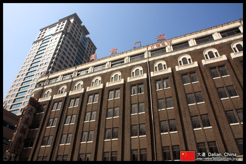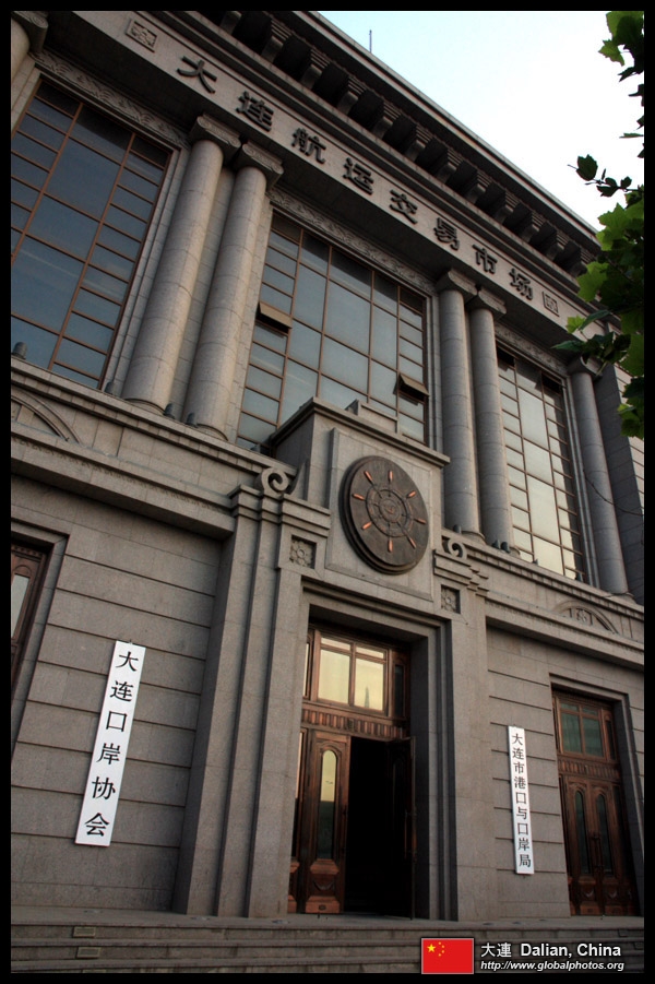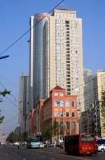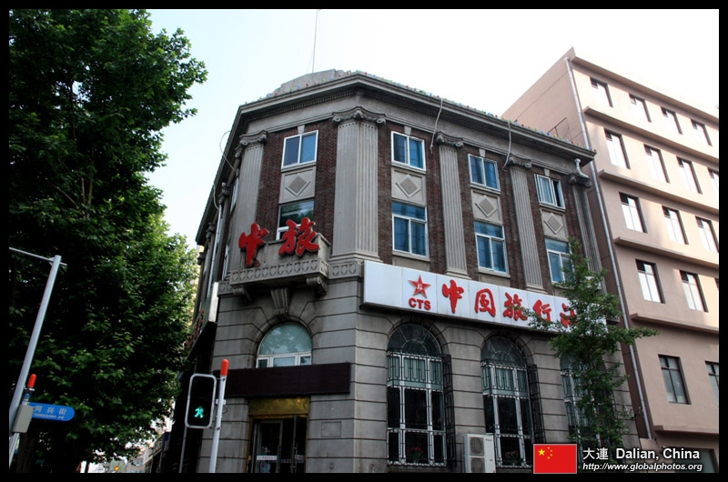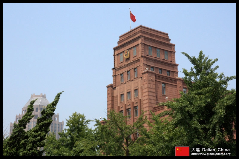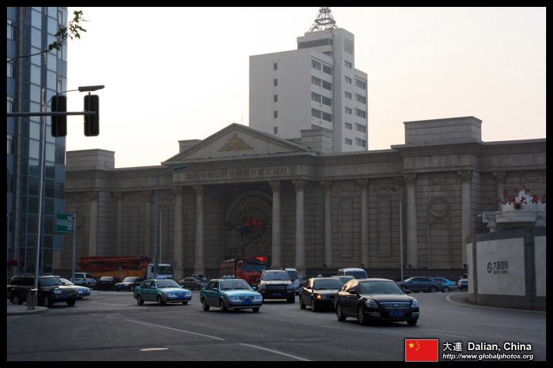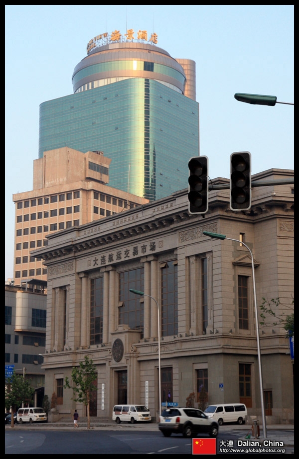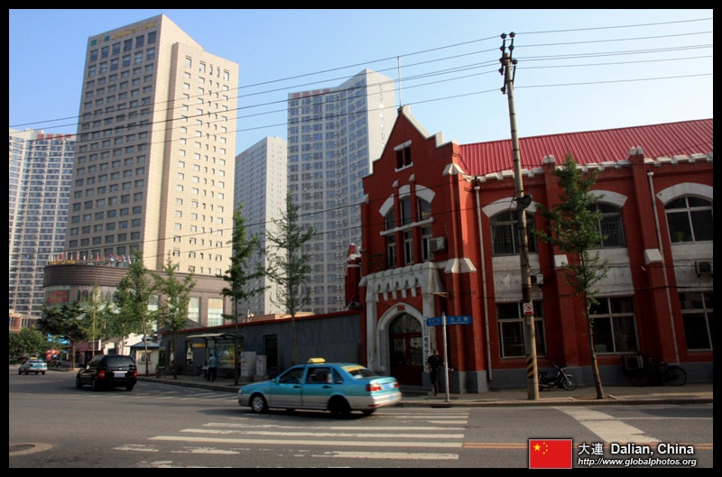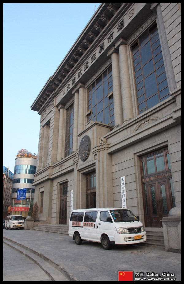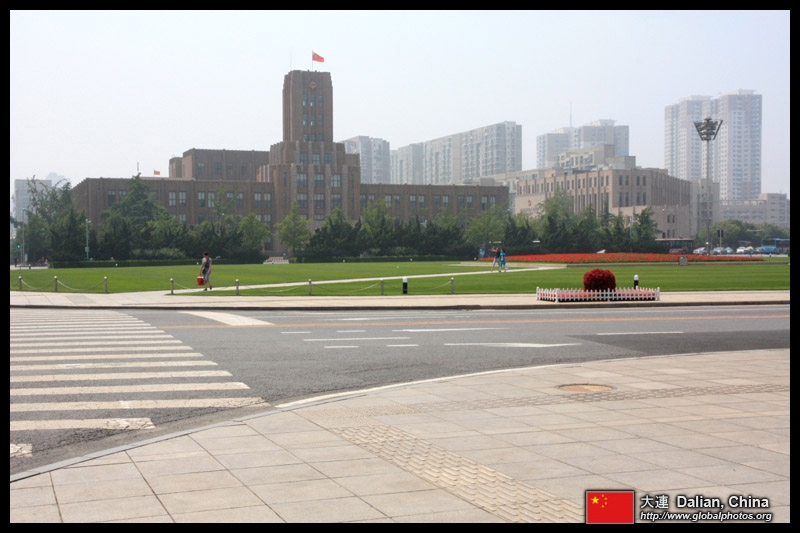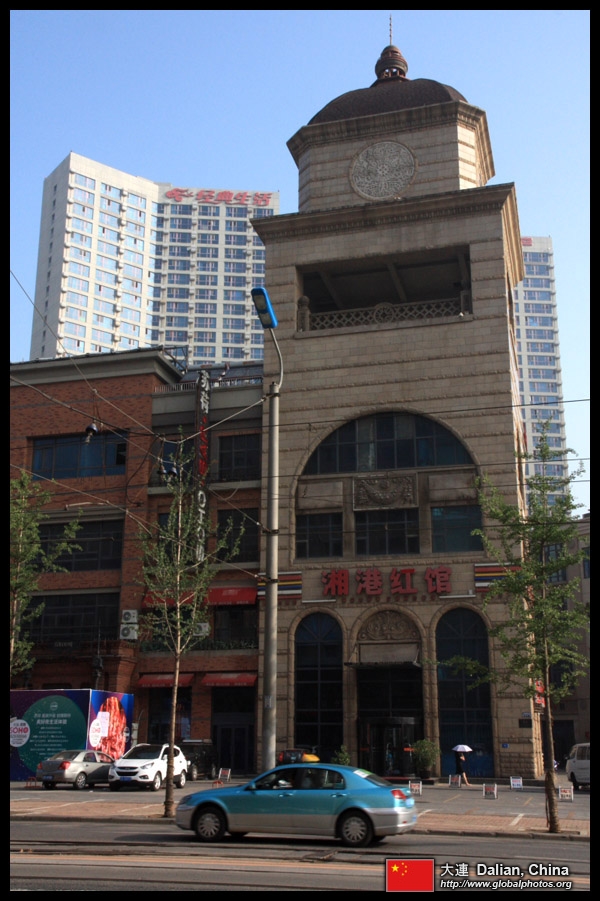Dalian is a city of squares. Minzhu Square is to the northeast of Zhongshan Square, but it isn't a pedestrian spot, but more a spacious tram stop, bordered by buildings like this historic one.