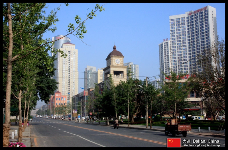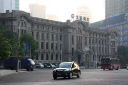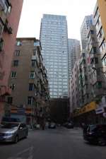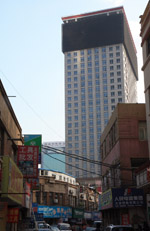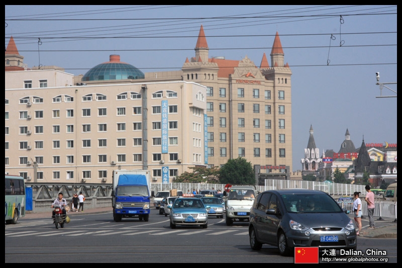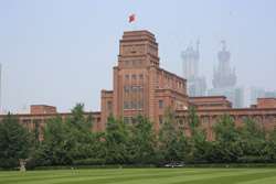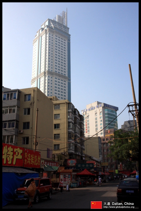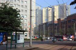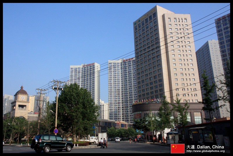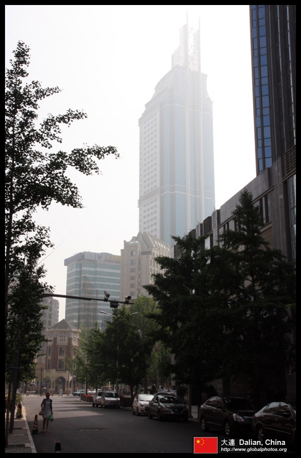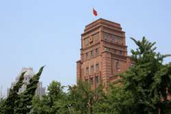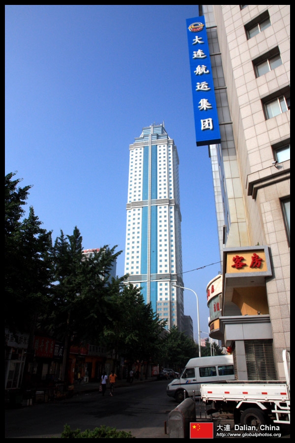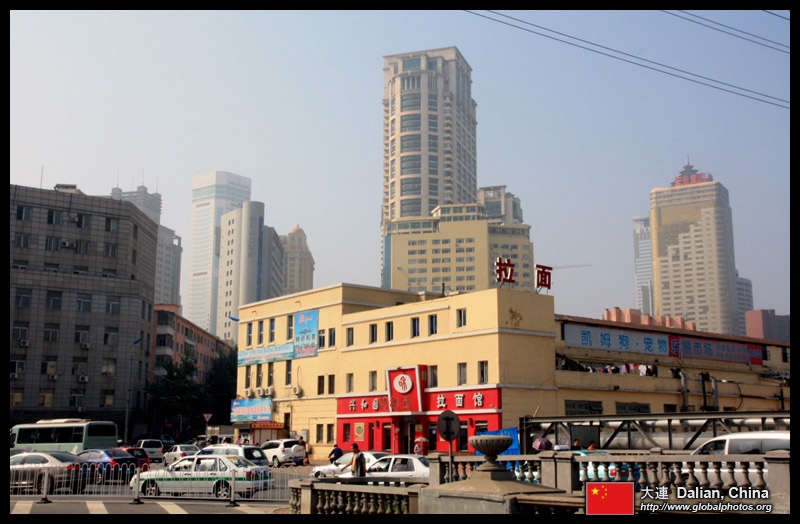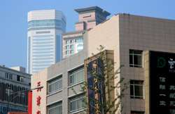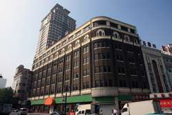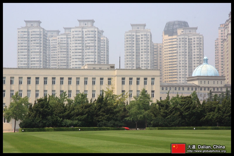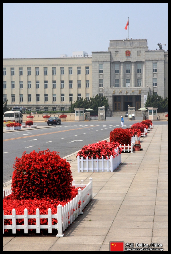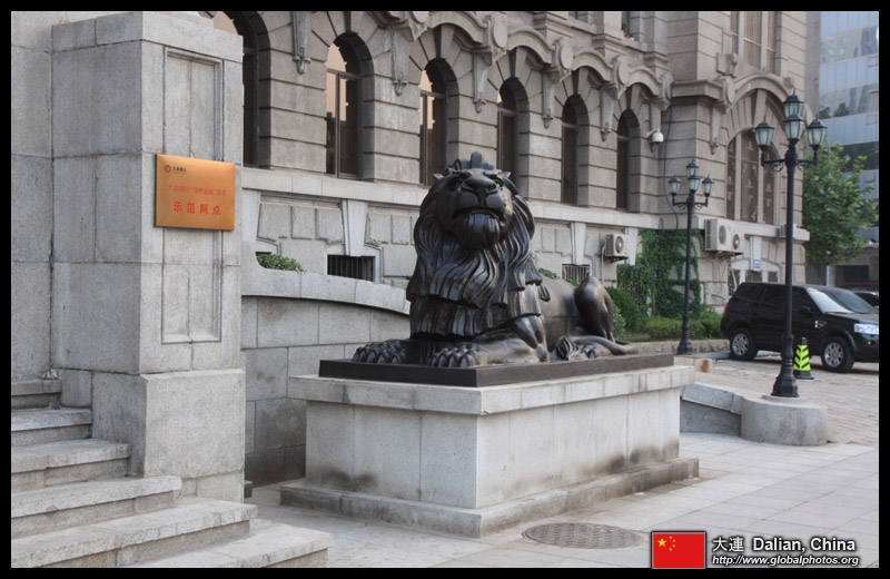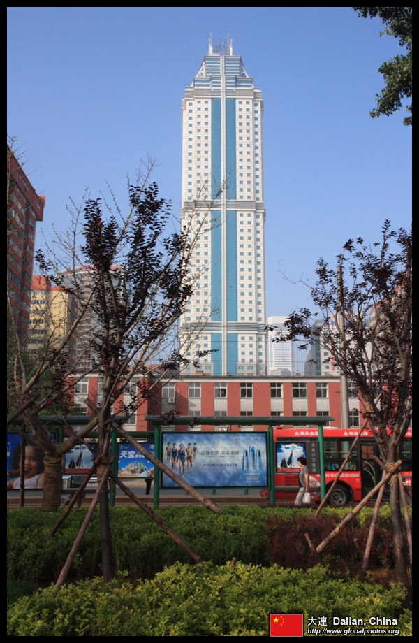 Dalian is a city of squares. Minzhu Square is to the northeast of Zhongshan Square, but it isn't a pedestrian spot, but more a spacious tram stop, bordered by buildings like this historic one.