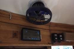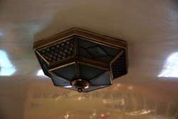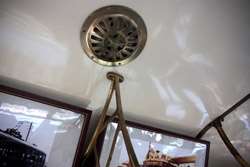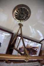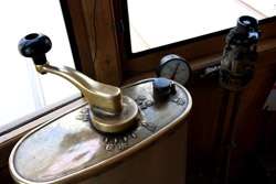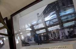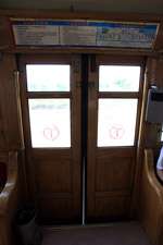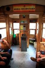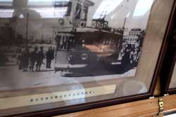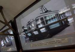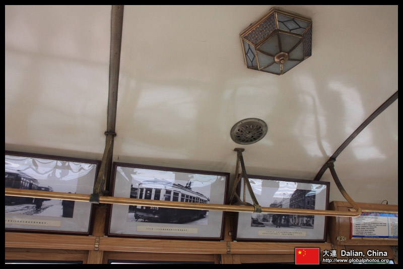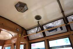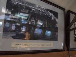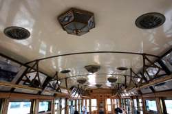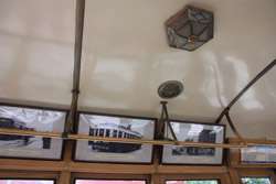 Historic photographs are hung along both sides of the historic tram's compartment.