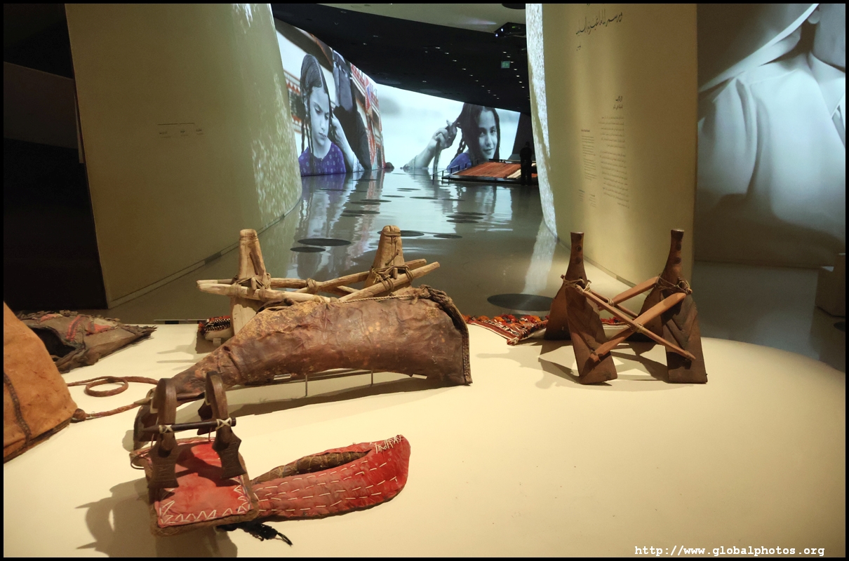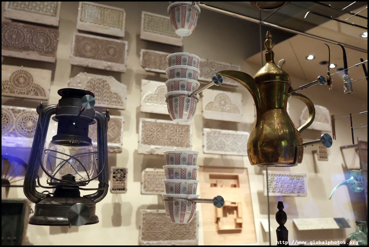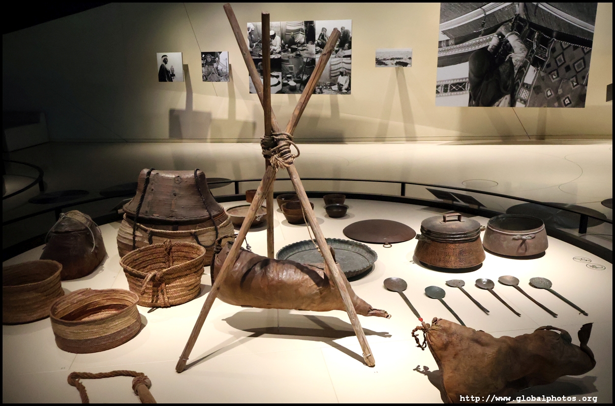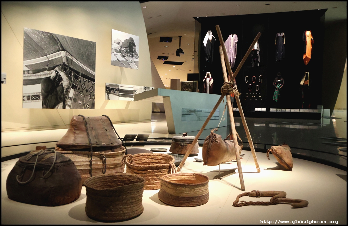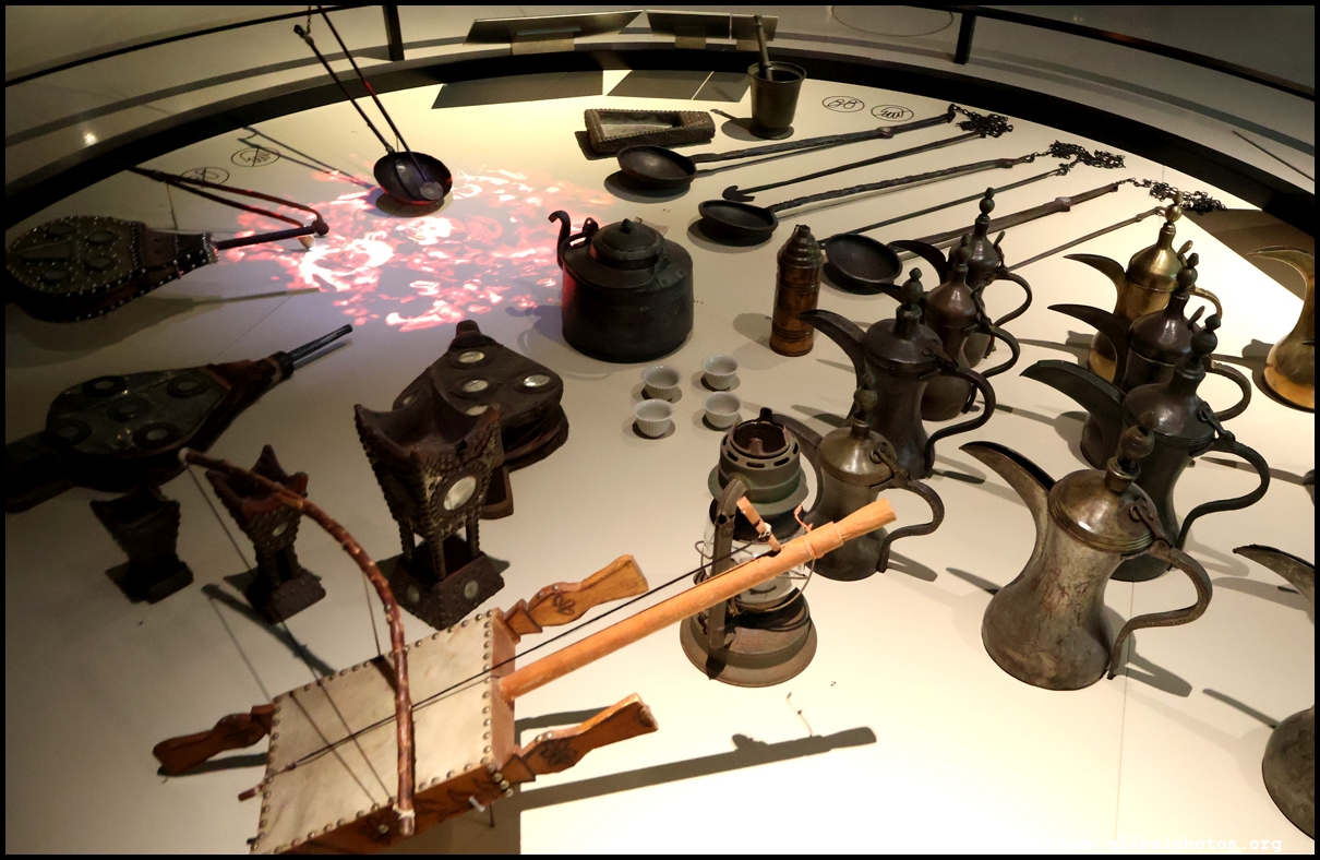Continuing on, there is a huge glass case of archaeological finds, followed by objects from the traditional lifestyle. The next gallery showcases life in the desert with objects such as a tent, falconry equipment, coffee-making tools, and traditional clothes.