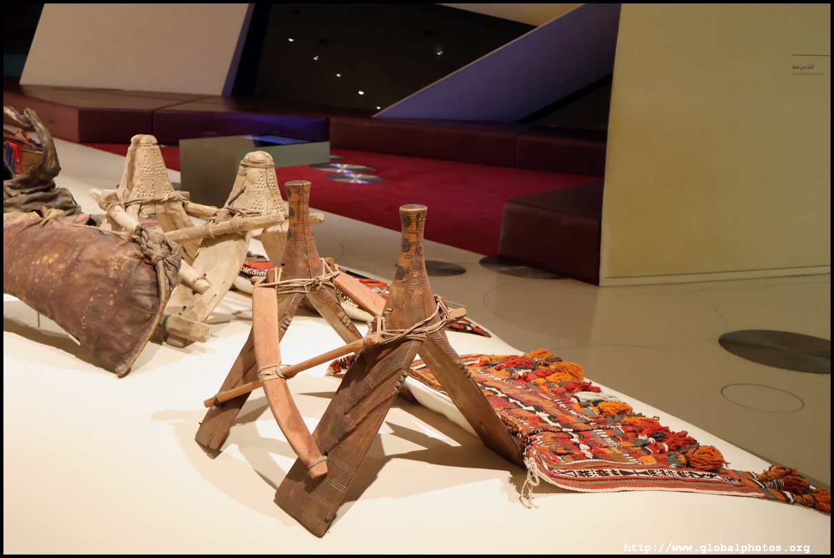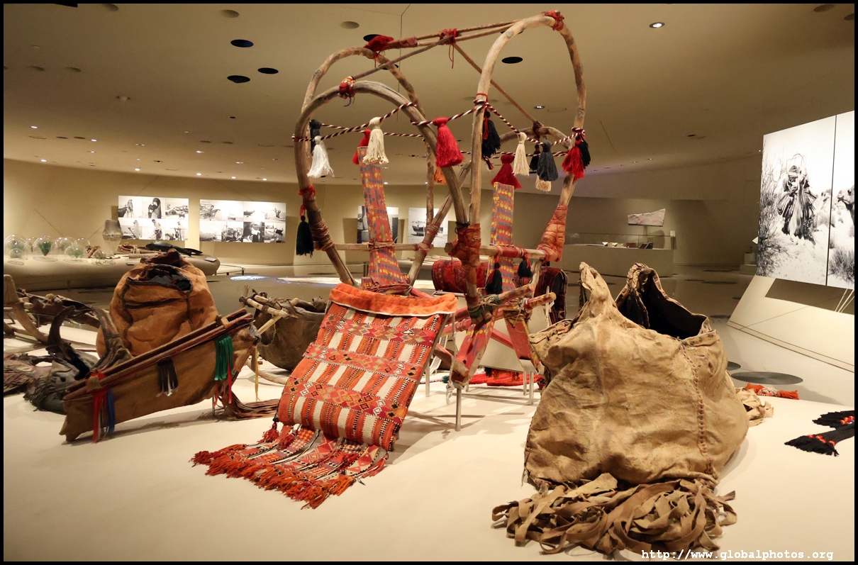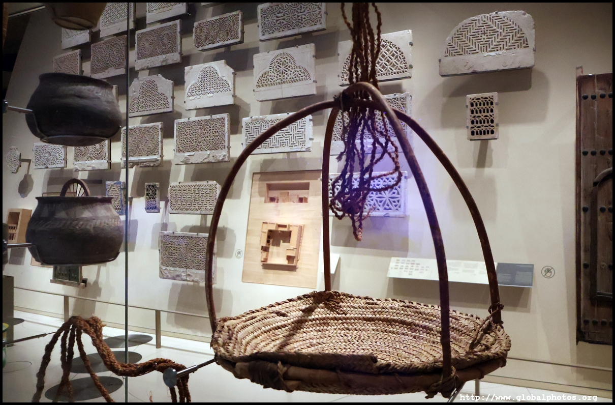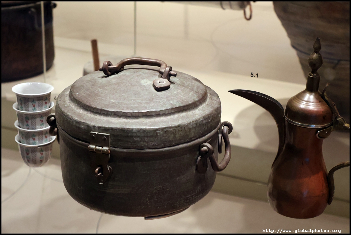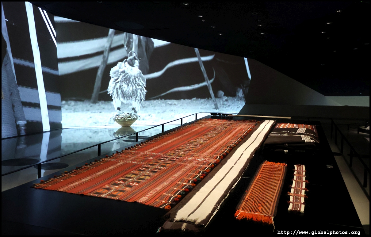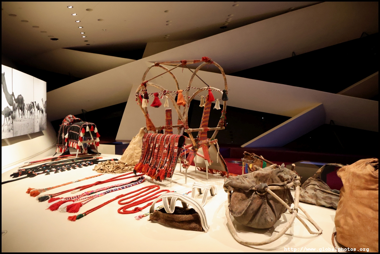 Continuing on, there is a huge glass case of archaeological finds, followed by objects from the traditional lifestyle. The next gallery showcases life in the desert with objects such as a tent, falconry equipment, coffee-making tools, and traditional clothes.