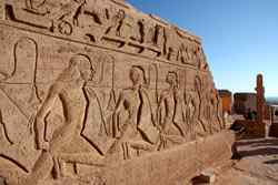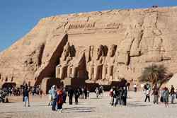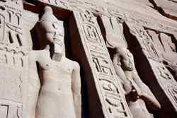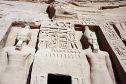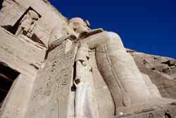 The Temple of Ramses II was carved out of a cliff in the 13th century BC with 4 imposing statues of Ramses II in the facade. The temple was rediscovered by a Swiss explorer in 1813, but had to be relocated as Lake Nasser's water level rose in the 1960s. UNESCO led this effort to move the temple further away and 65m above its original position.