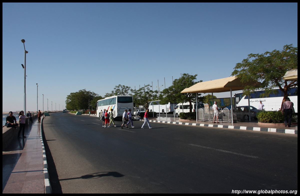 An optional excursion out of Aswan is to visit Abu Simbel, which requires a very early start with police escort in a convoy for the drive south. Long before sunrise, tour buses gathered at the police station in Aswan to get ready for the trip.