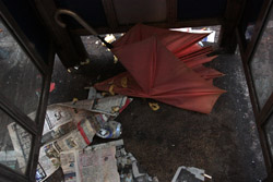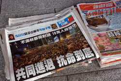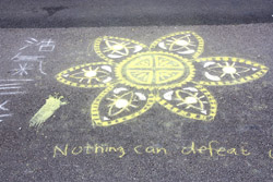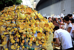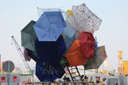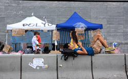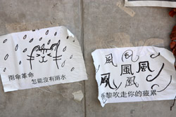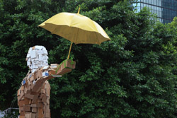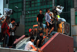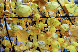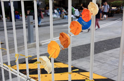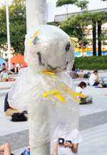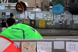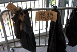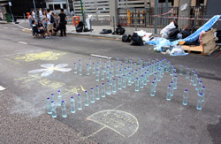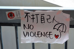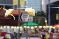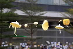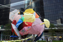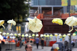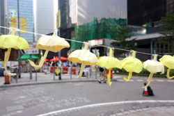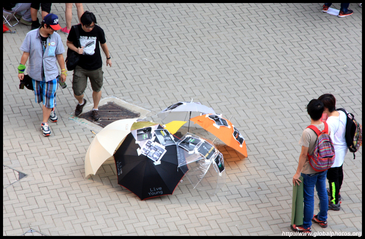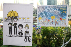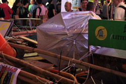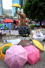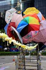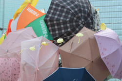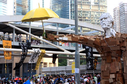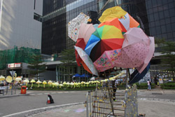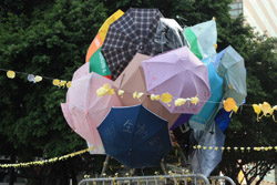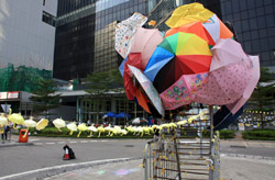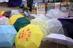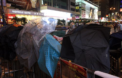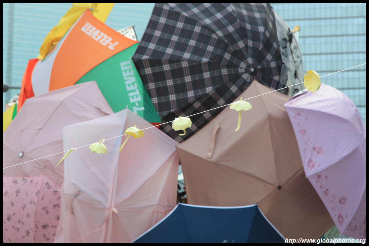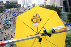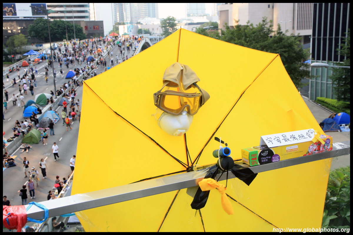 The umbrella became a symbol of the protest. They were useful in repelling the police's pepper spray attacks. Protesters played skits on-site to demonstrate how they can be used as a protective shield.