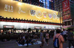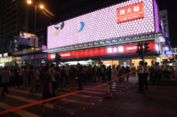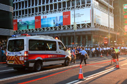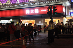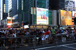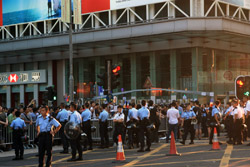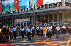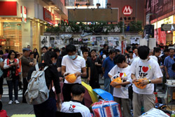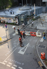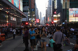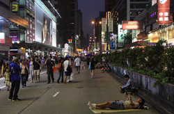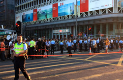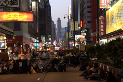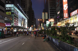 The atmosphere changed drastically across the harbour in Mongkok, where there were violent scuffles along parts of bustling Nathan Road that were shut off to traffic. Many families were out enjoying the new pedestrian zone.