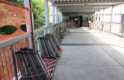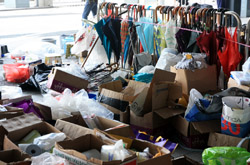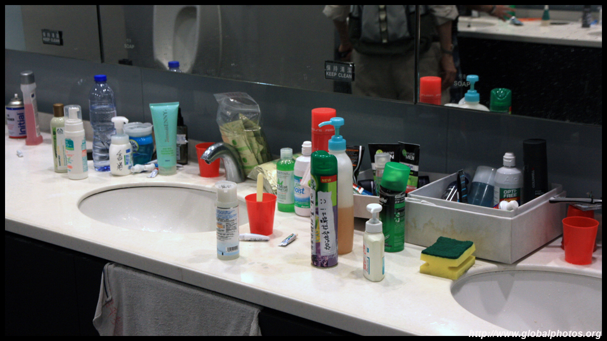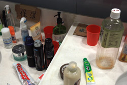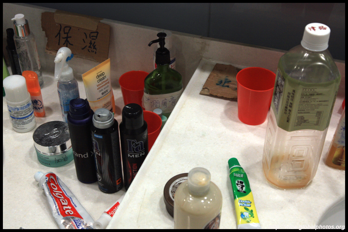The public toilet at the government headquarters was transformed into a family's bathroom. There were plenty of supplies to keep everyone well-groomed throughout the long journey.