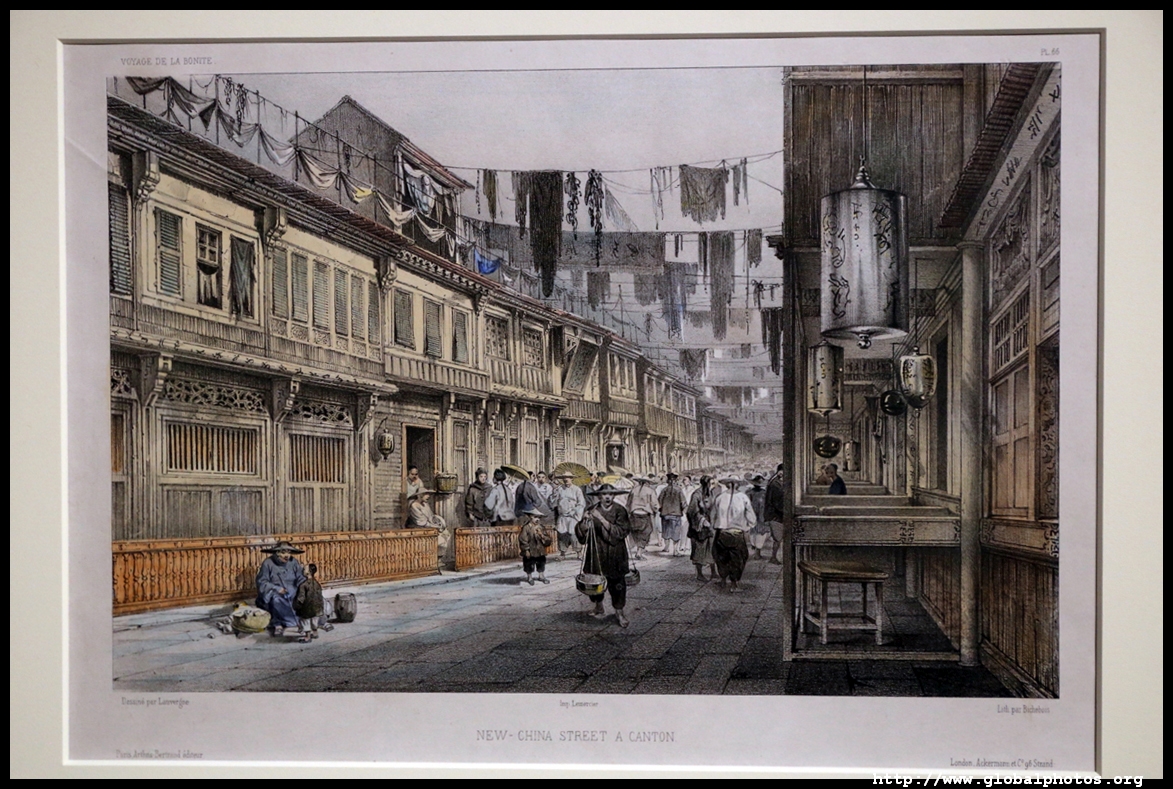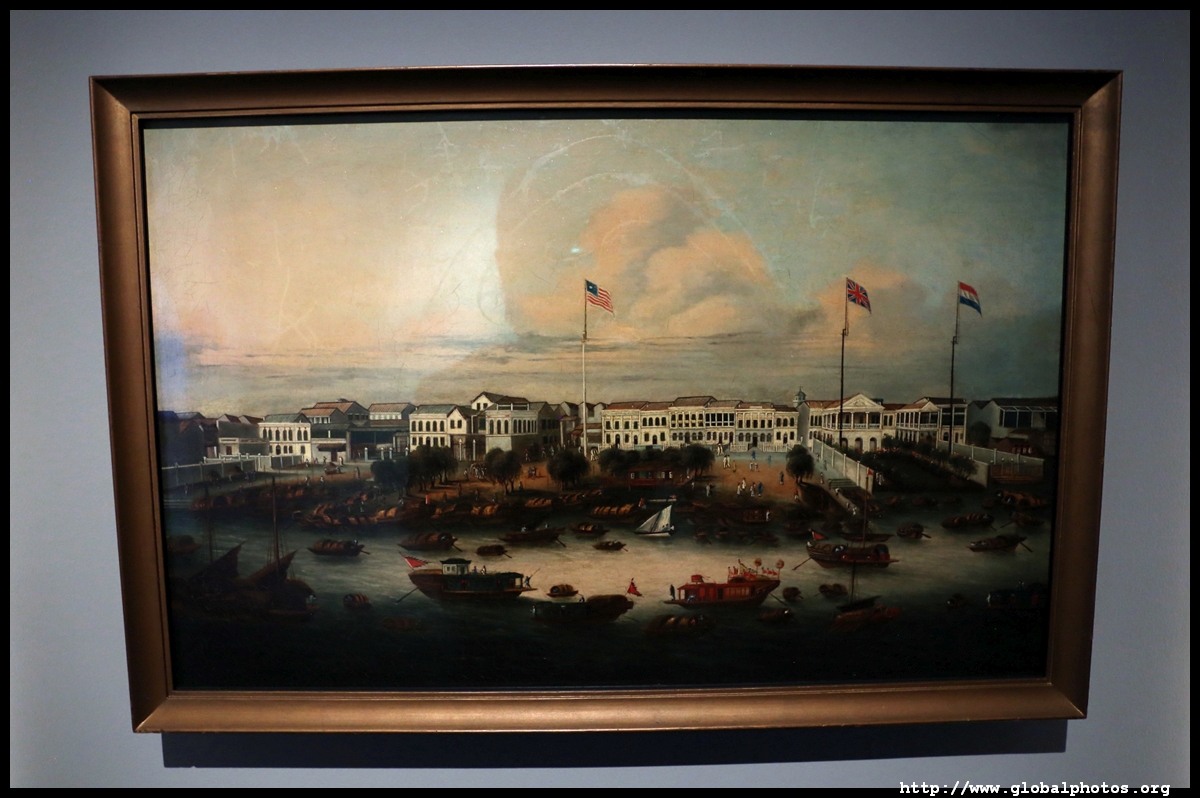 The 2-3 storey buildings are in Western style and line along the Pearl River. All foreign traders had to stay within these factories and not mingle elsewhere in the city. There was once even a fence here, but a fire in 1822 forced their removal to facilitate evacuation. Offices are on the ground floor while living quarters are above. A large square sits in front of the factories where foreigners are seen talking a walk during their free time, but with the fence gone, it became a bustling centre with hawkers, beggars, gamblers, and more. The fence returned in the 1840s and the foreigners put in private gardens instead.