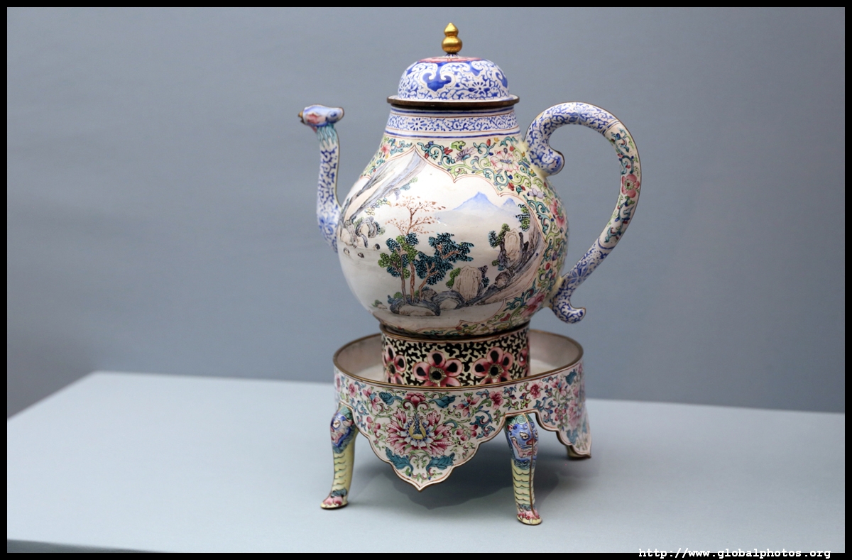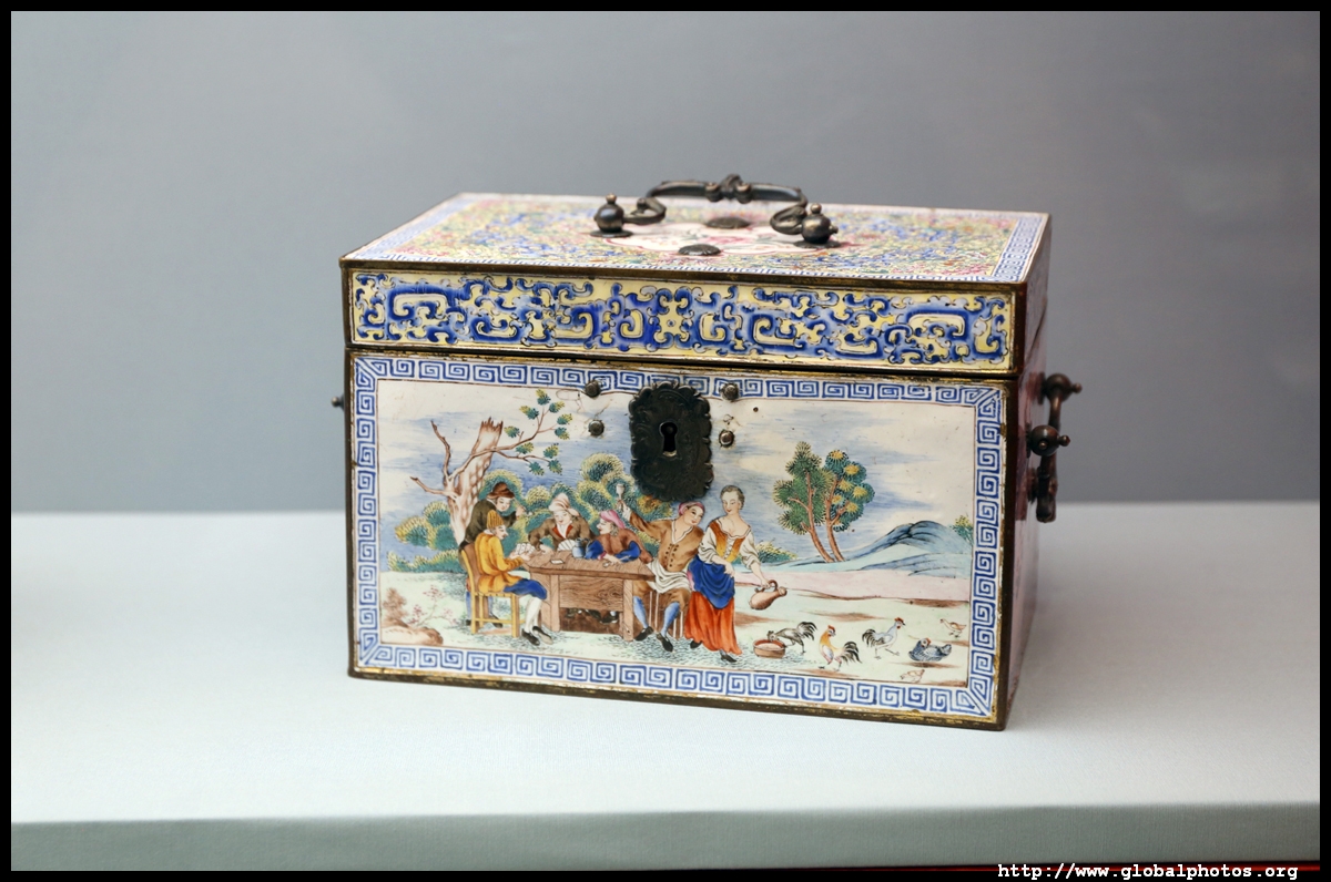 This painted enamel tea caddy reflects the Chinese perception of a Westerner, someone with red, blonde, or brown hair. These works look Western but were made with traditional Chinese painting techniques.