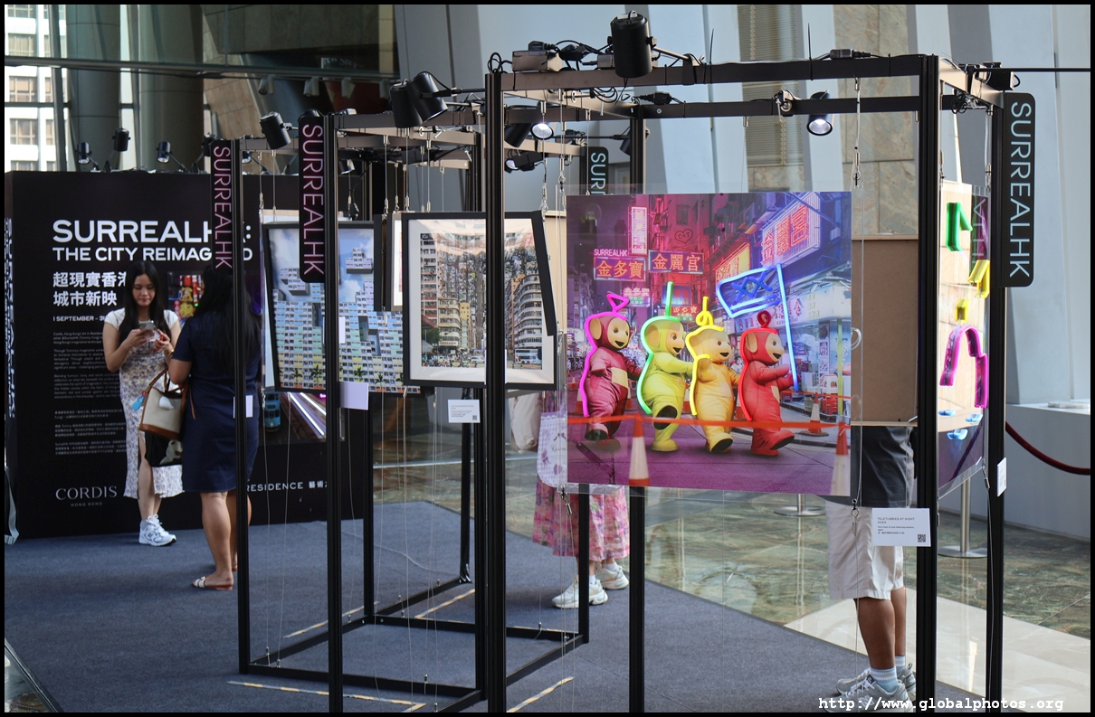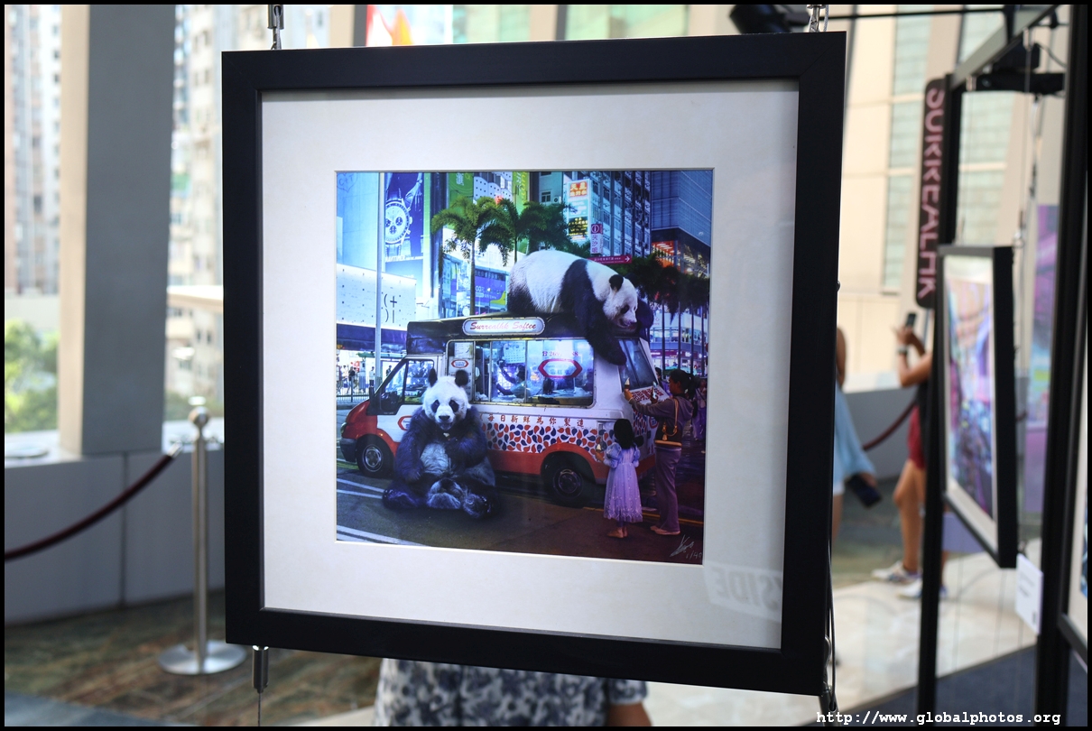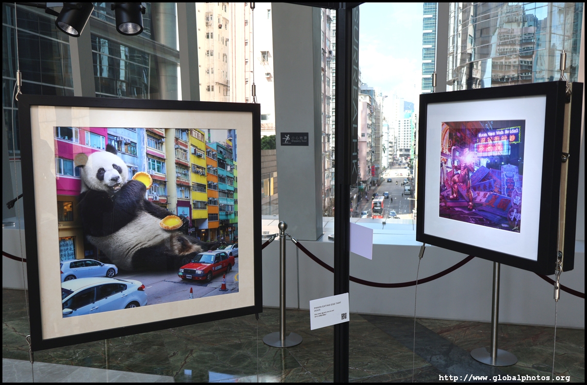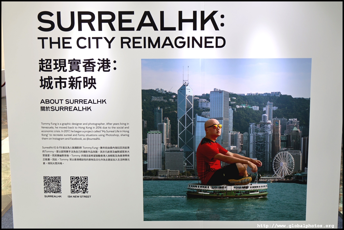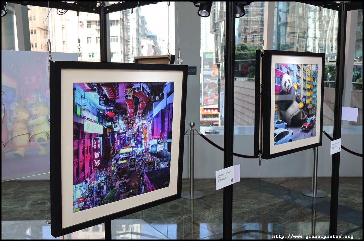 Located on the pedestrian bridge between Langham Place and Cordis Hotel is a small exhibition featuring Tommy Fung's works. He is a graphic designer and photographer who moved to Hong Kong in 2016. He used Photoshop to create surreal and funny situations and shared them on social media.