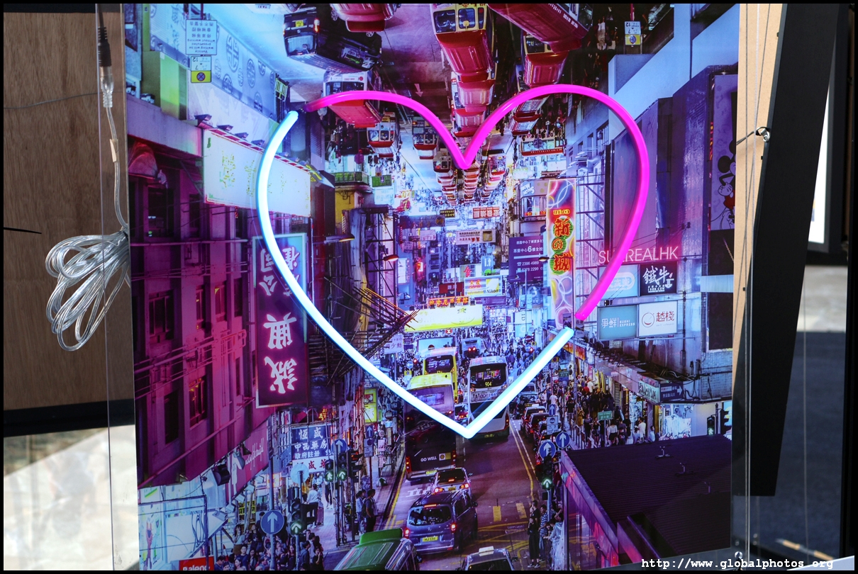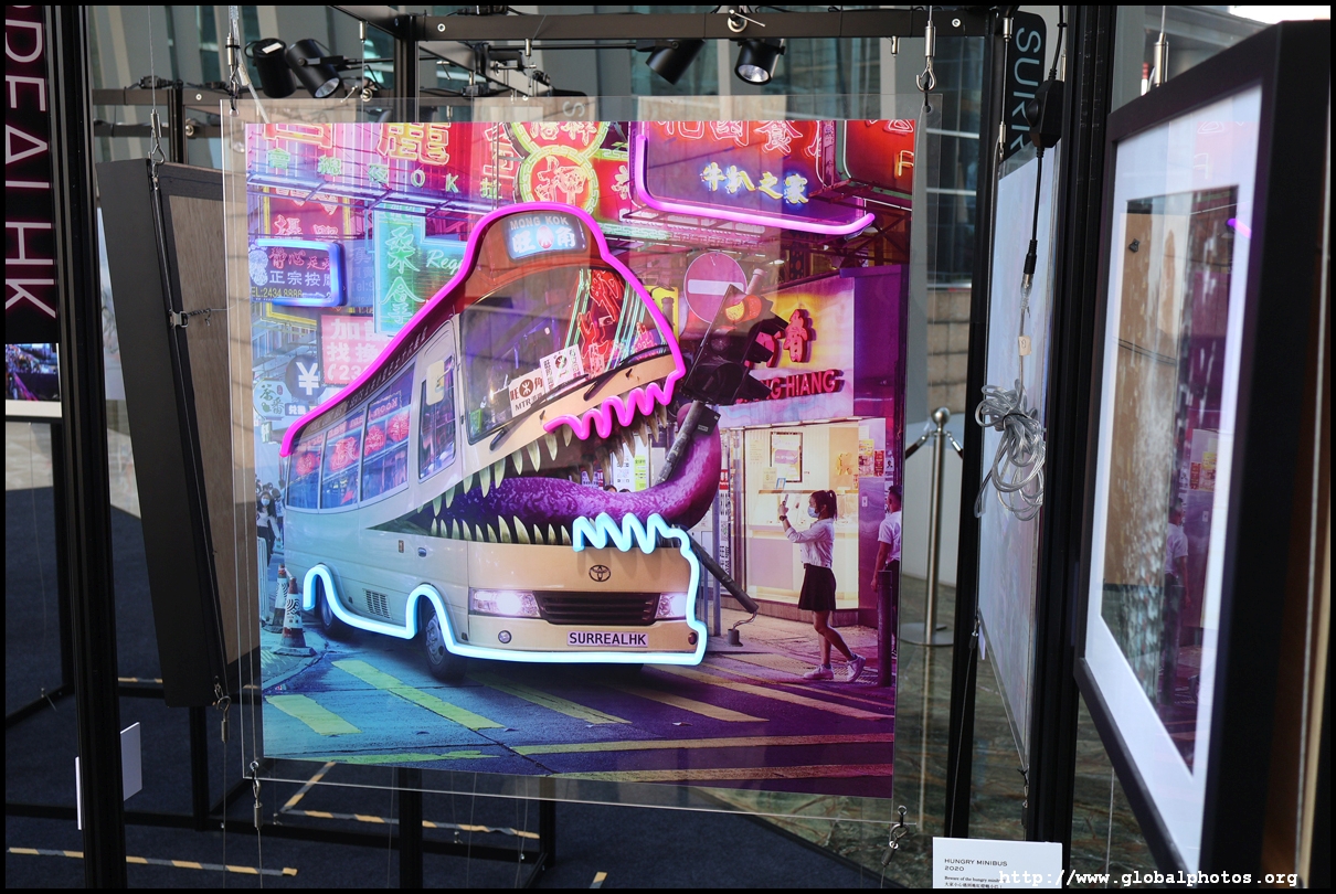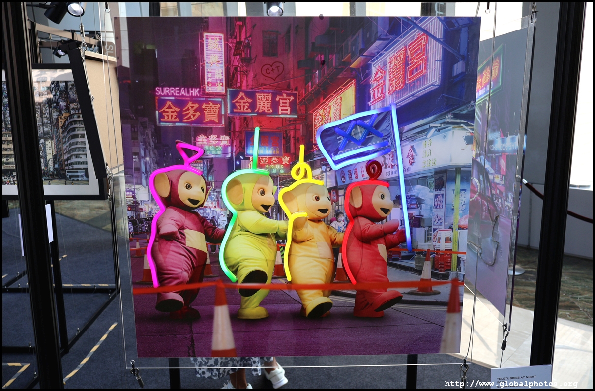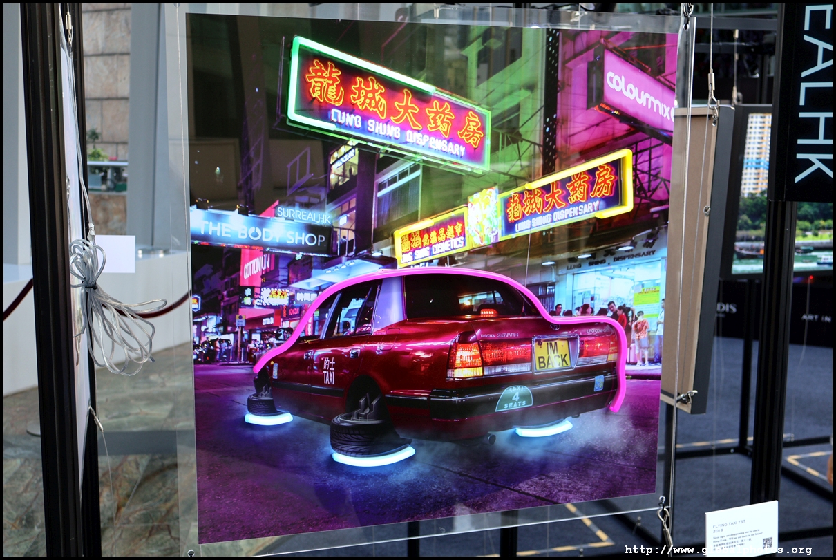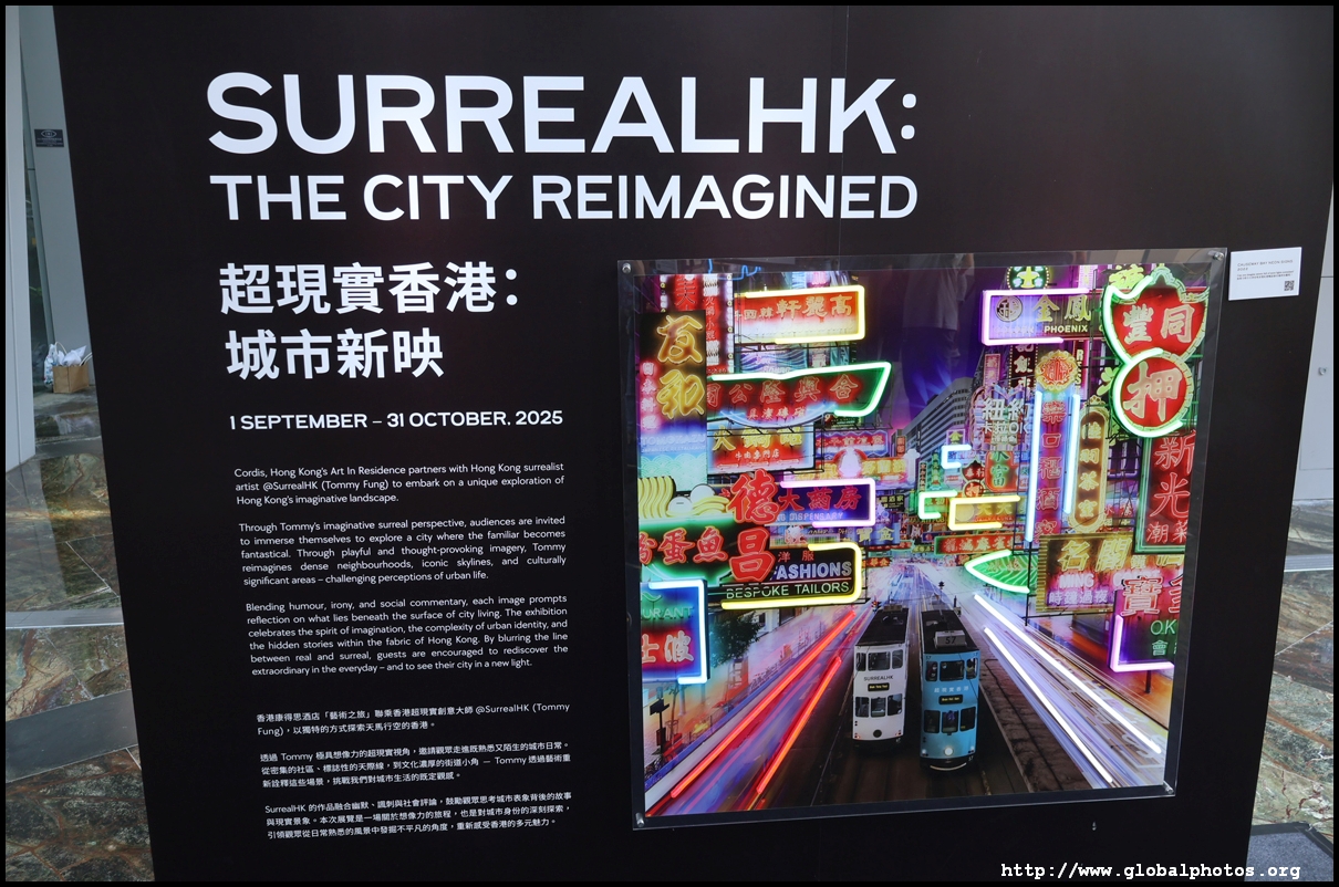 Located on the pedestrian bridge between Langham Place and Cordis Hotel is a small exhibition featuring Tommy Fung's works. He is a graphic designer and photographer who moved to Hong Kong in 2016. He used Photoshop to create surreal and funny situations and shared them on social media.