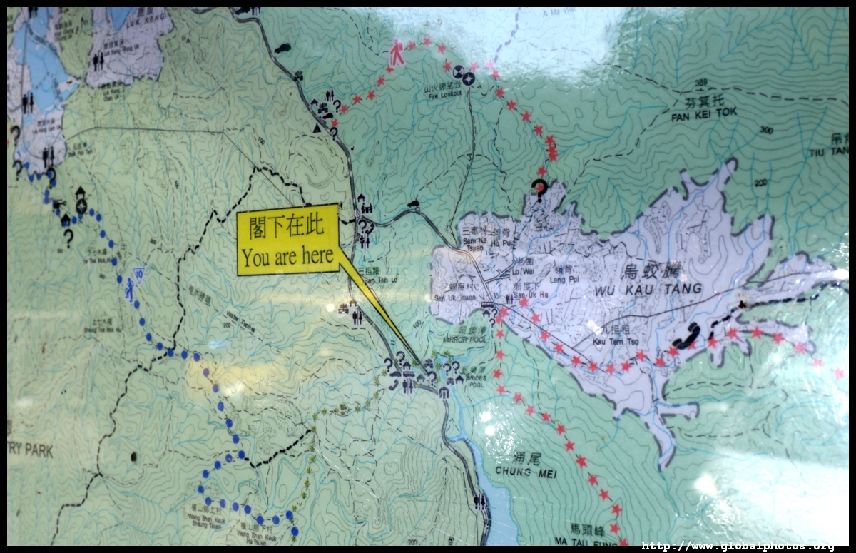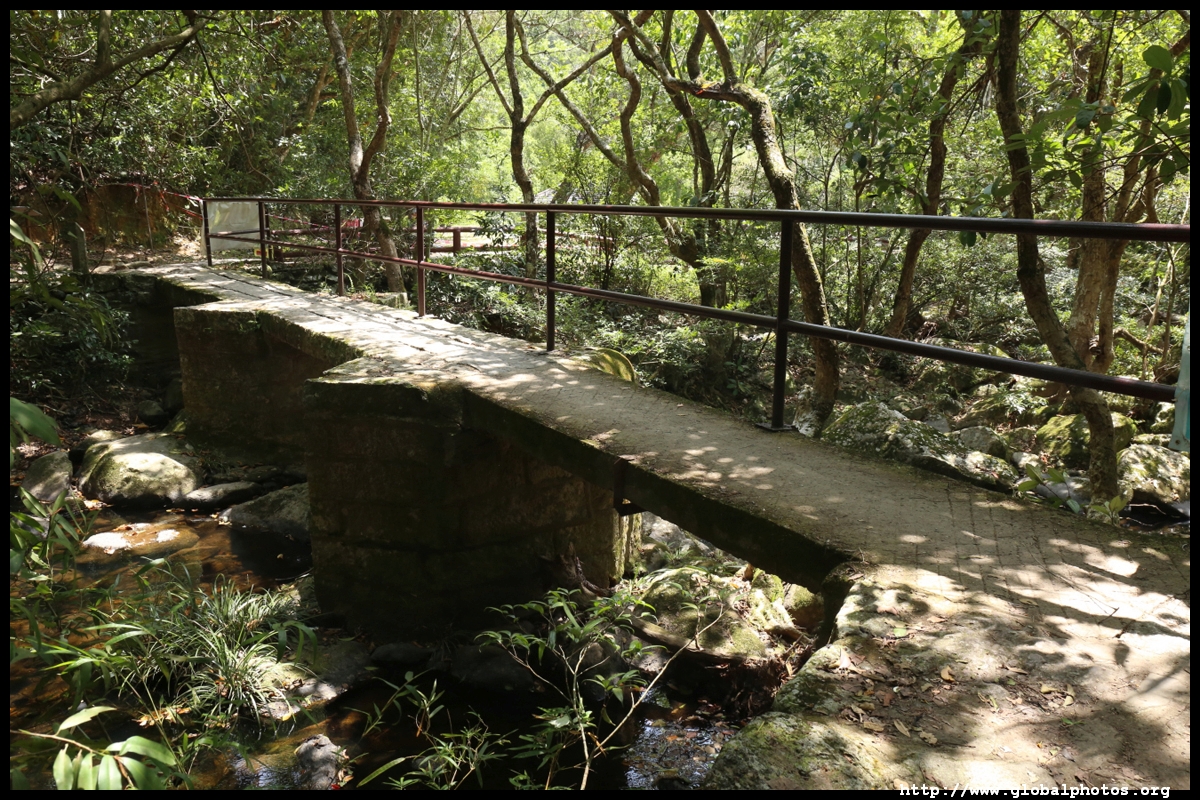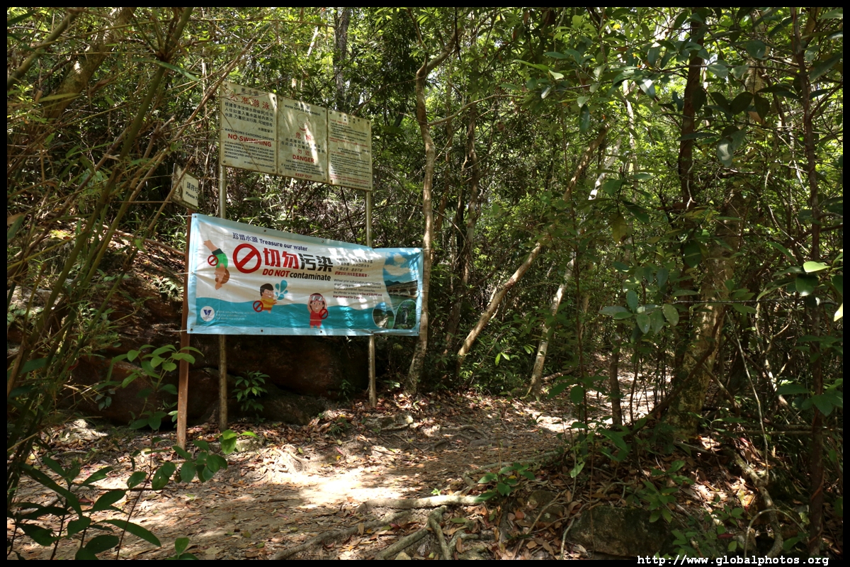 Don't cross the bridge. Note the sign to Chiu Keng Tam, which is home to an even bigger waterfall.