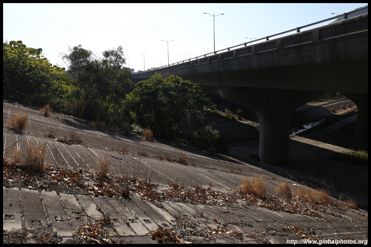 On the other side of the underpass, turn left along Cheung Tung Road for a short distance until it terminates at Sunny Bay Road. Cross the street here then continue to the right. You will see the sidewalk slant down to beneath the bridge. Cross to the other side, turn right, and there will be a staircase leading to a dirt path uphill.