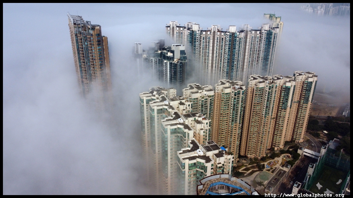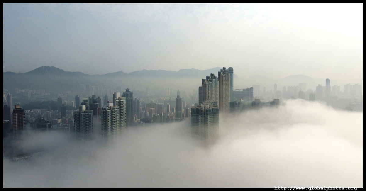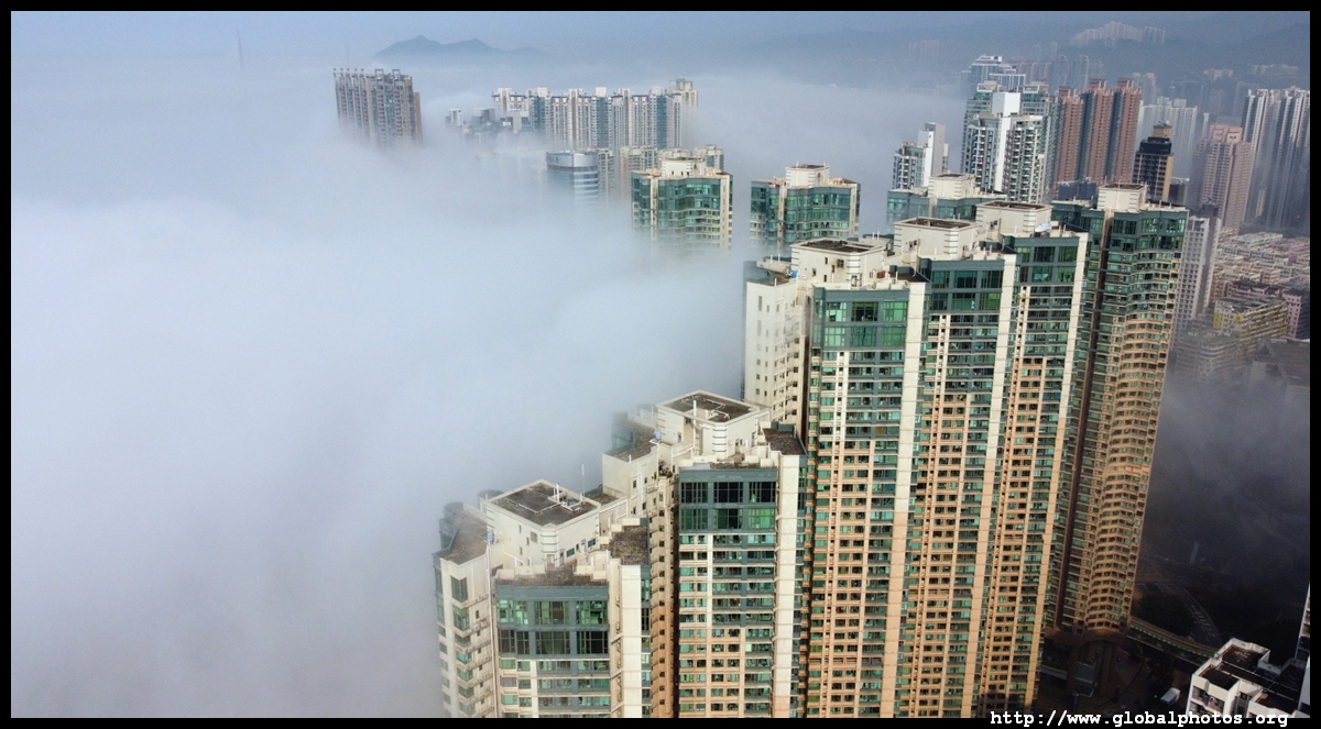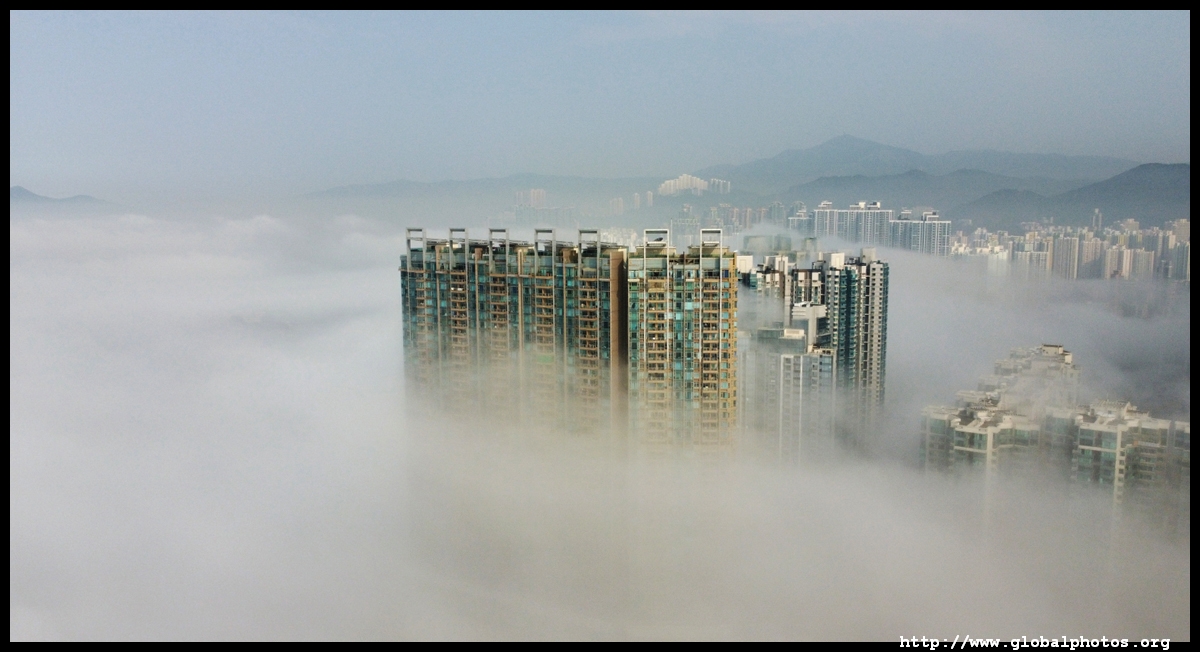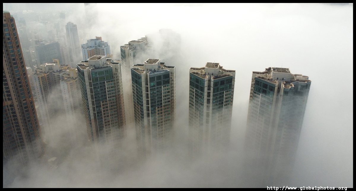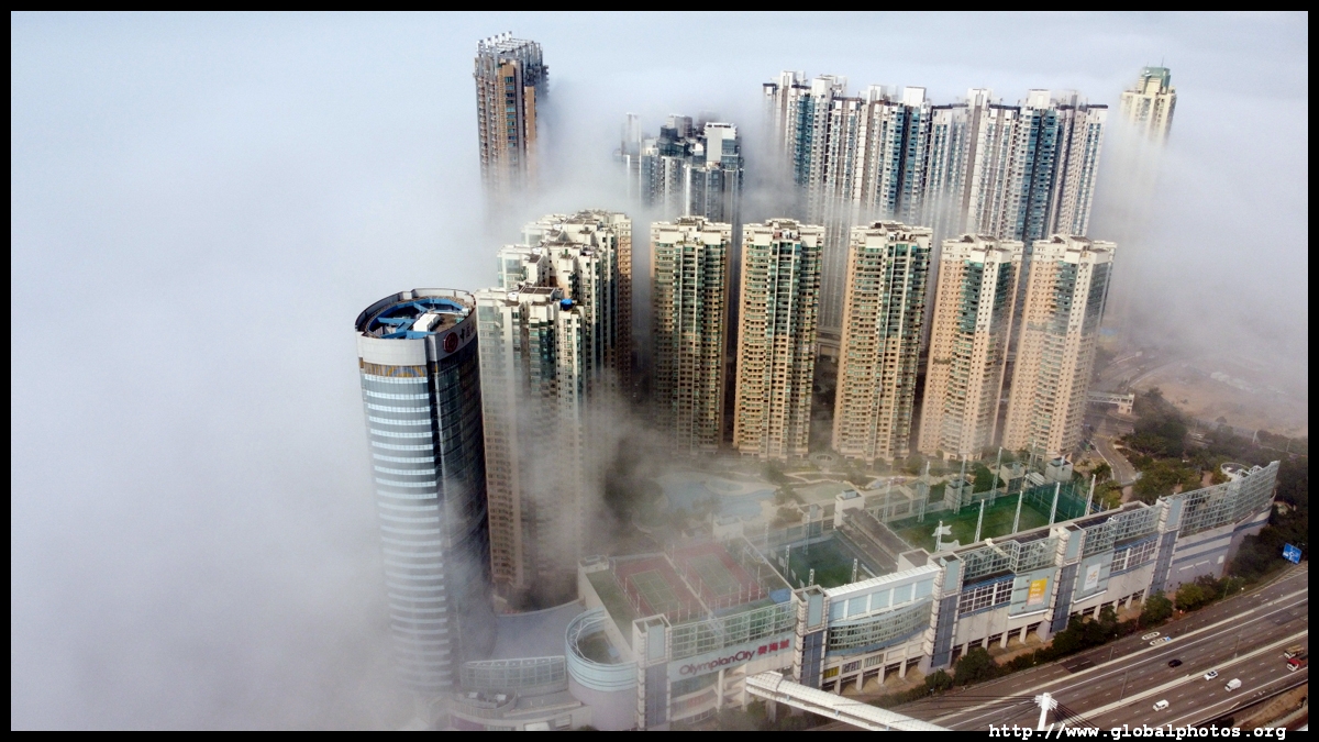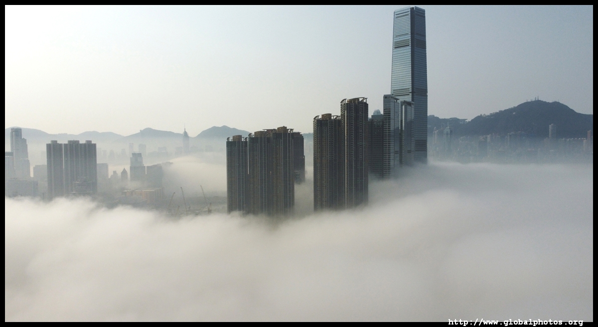 During the spring, warmer, humid air from the sea is cooled by the cold coastal waters, resulting in intense fog that is prevalent between March and April. On March 5, 2022, parts of the city were shrouded in fog but the city's tall buildings were able to pierce through at times.Here are some views from West Kowloon. The towers on top of Kowloon station were partially covered.