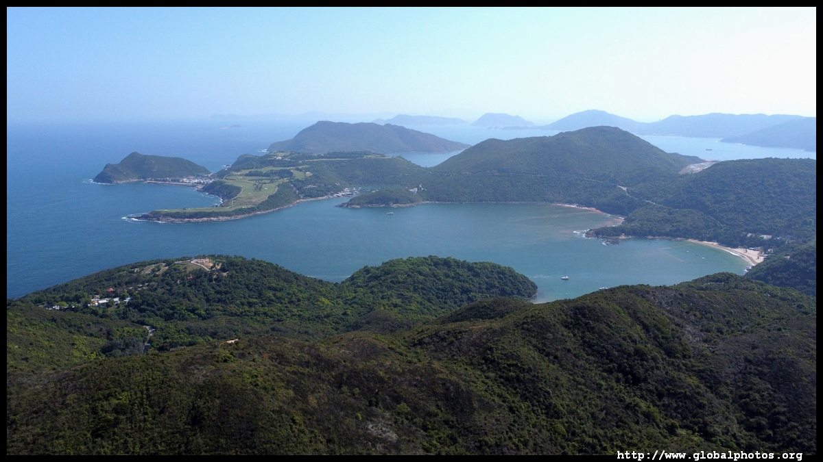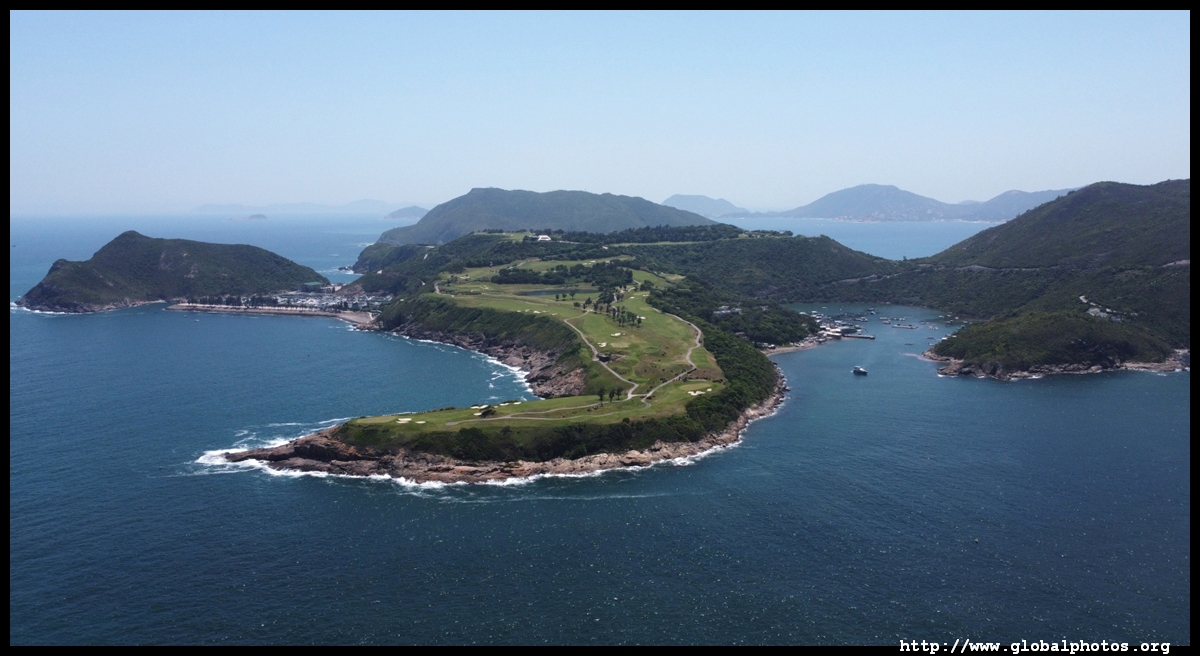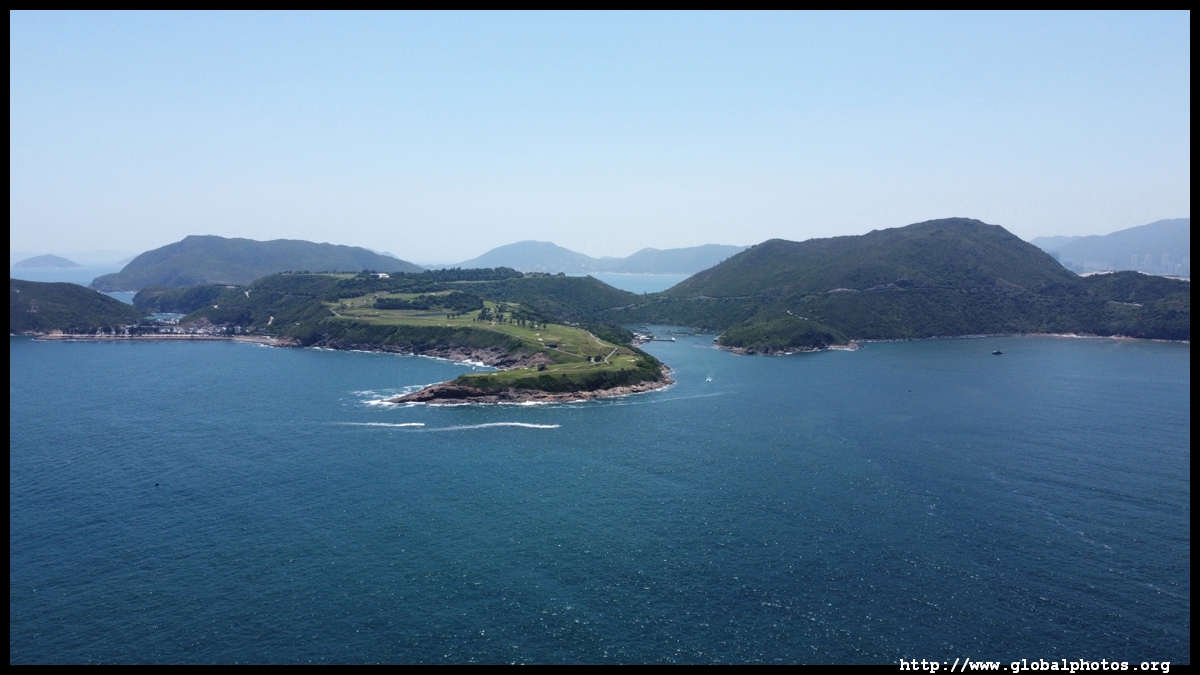 Across the bay is the golf course surrounded by ocean and a few islands further offshore.